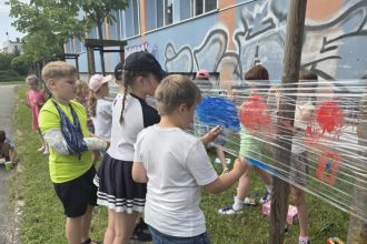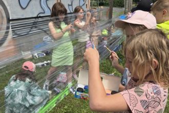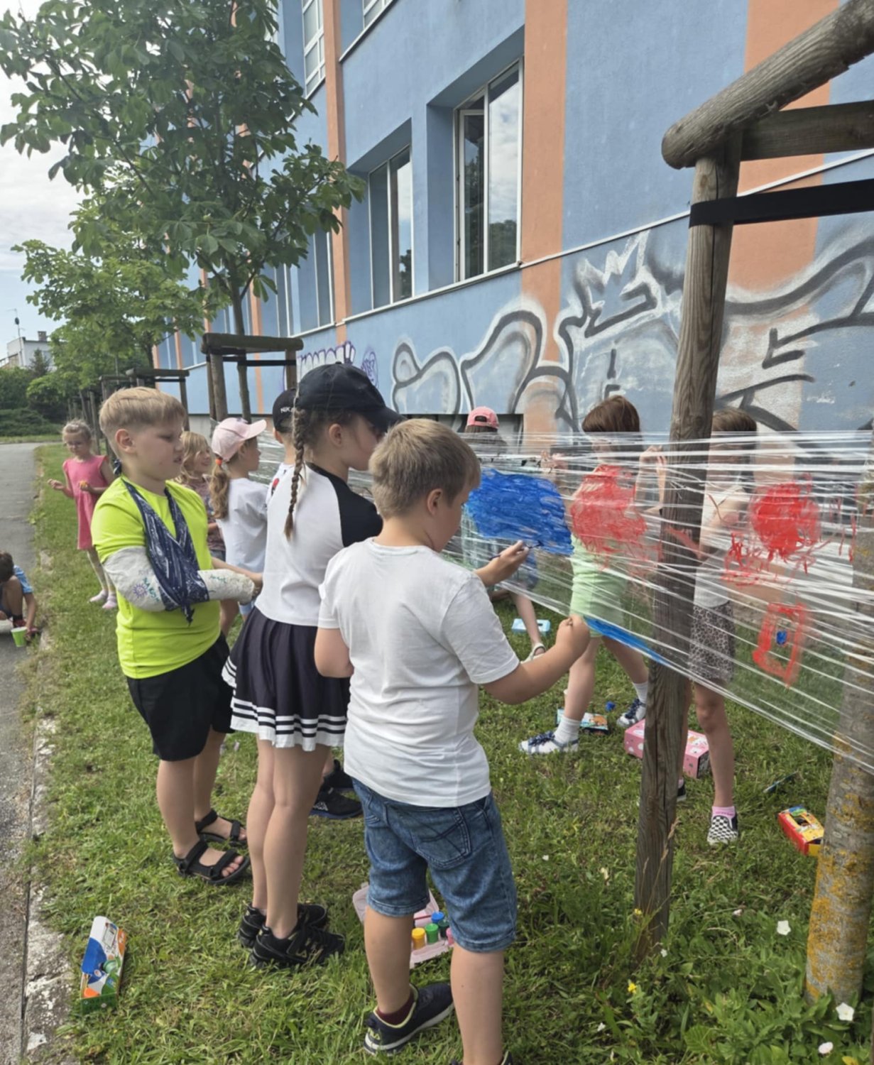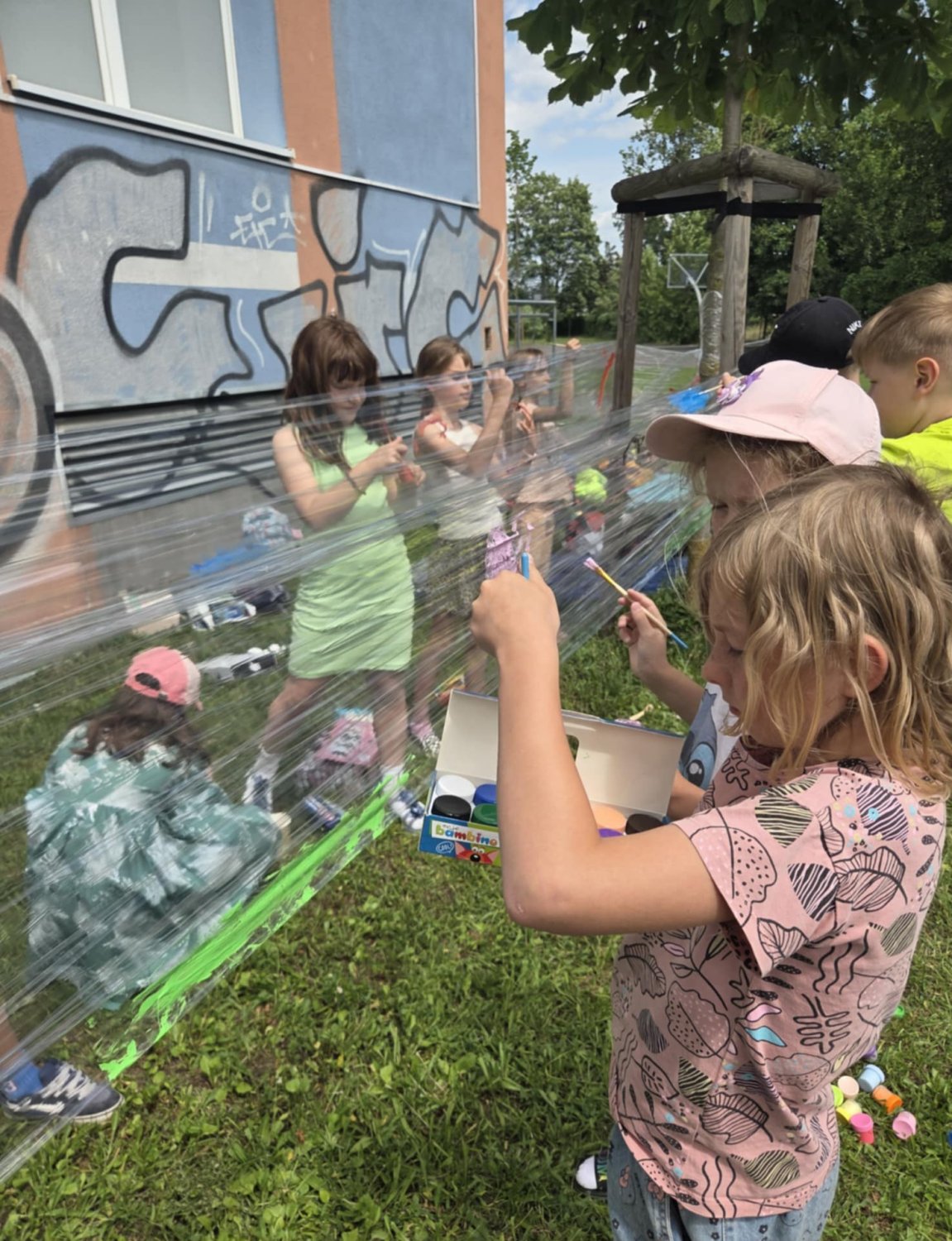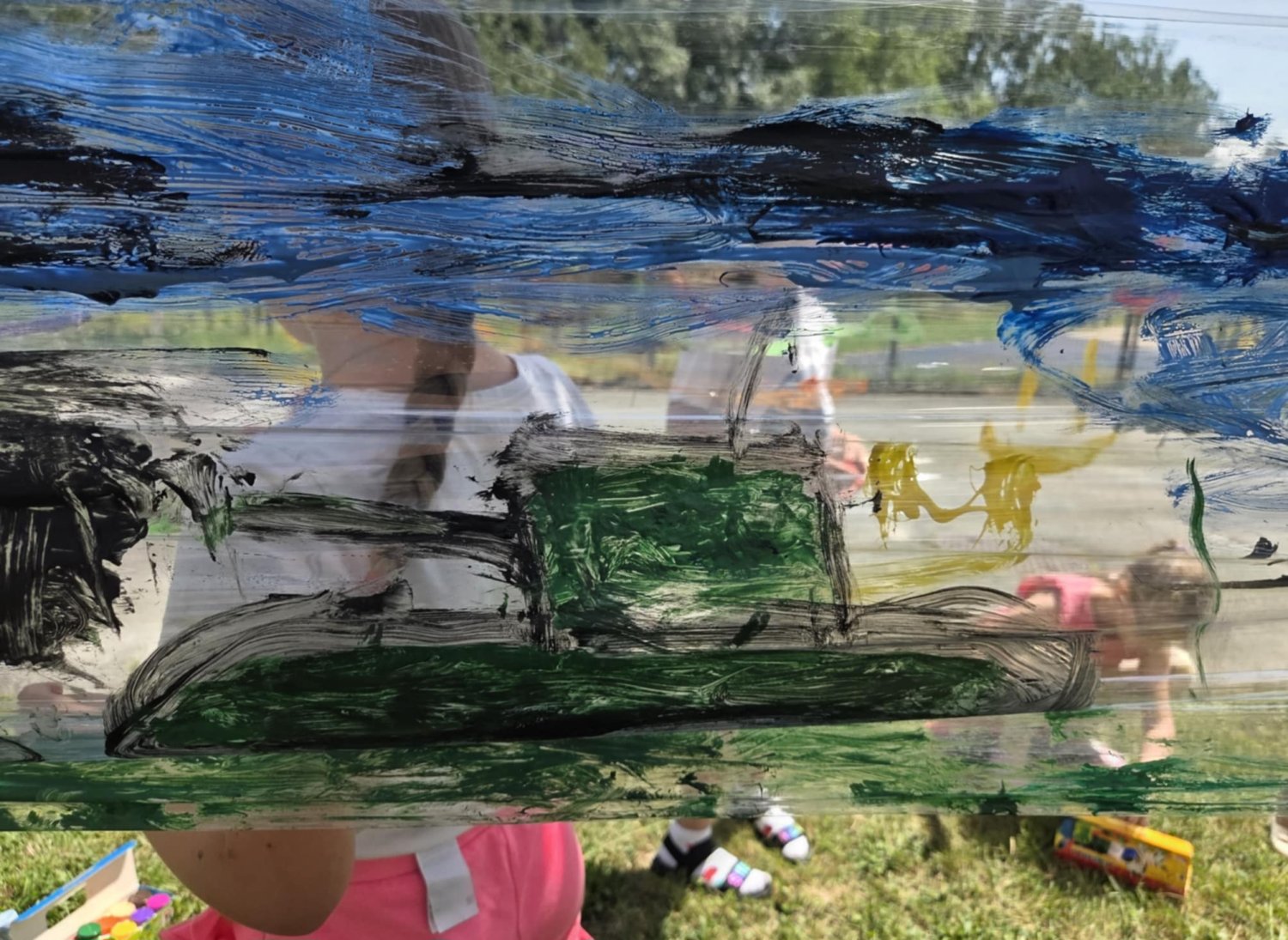 Dzieci z ogromnym zaangażowaniem tworzyły barwne kompozycje, ciesząc się swobodą działania i pięknem otaczającej przyrody. Nietypowe podłoże – rozciągnięta folia – dodało całemu wydarzeniu wyjątkowego charakteru i zachęcało do eksperymentowania z kolorami oraz technikami malarskimi.