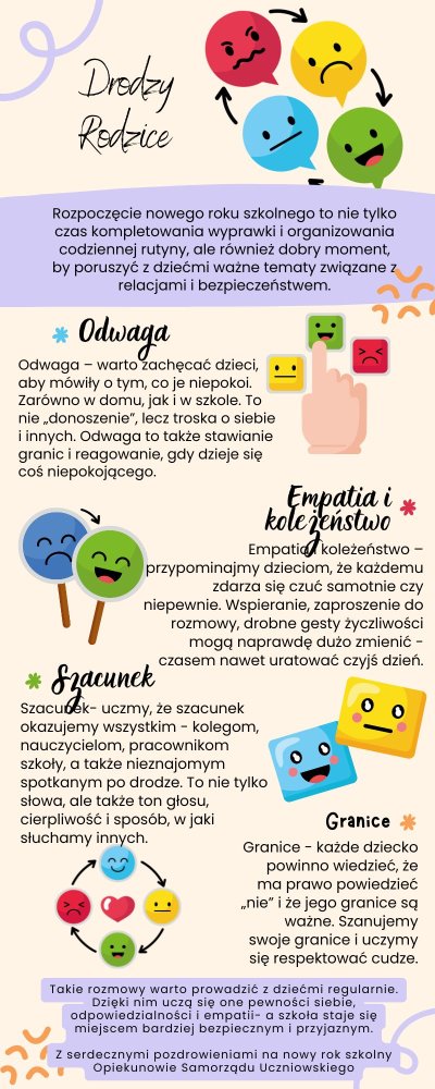 Rozpoczęcie nowego roku szkolnego to nie tylko czas kompletowania wyprawki i organizowania codziennej rutyny, ale również dobry moment, by poruszyć z dziećmi ważne tematy związane z relacjami i bezpieczeństwem.