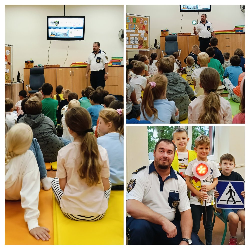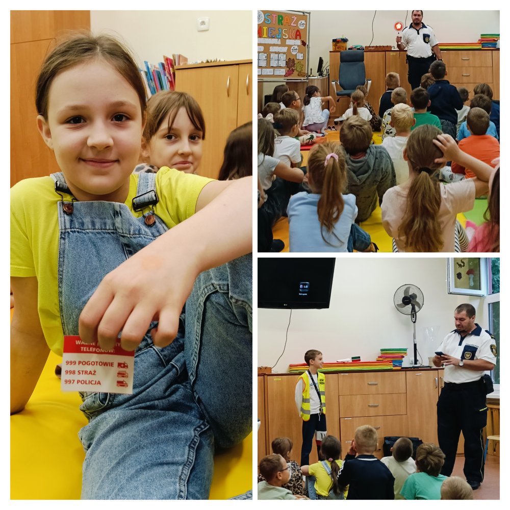 Podczas spotkania świetliczaki dowiedziały się, jak prawidłowo przechodzić przez jezdnię, dlaczego warto nosić elementy odblaskowe oraz jak zachowywać się w pobliżu ulicy. Strażnik opowiedział też o tym, że znaki drogowe poziome i pionowe są ważną informacją zarówno dla przechodniów, jak i dla kierowców. Dzieci miały okazję zadawać pytania i dzielić się swoimi doświadczeniami. Aktywni uczestnicy otrzymali za wypowiedzi naklejkę z numerami alarmowymi.