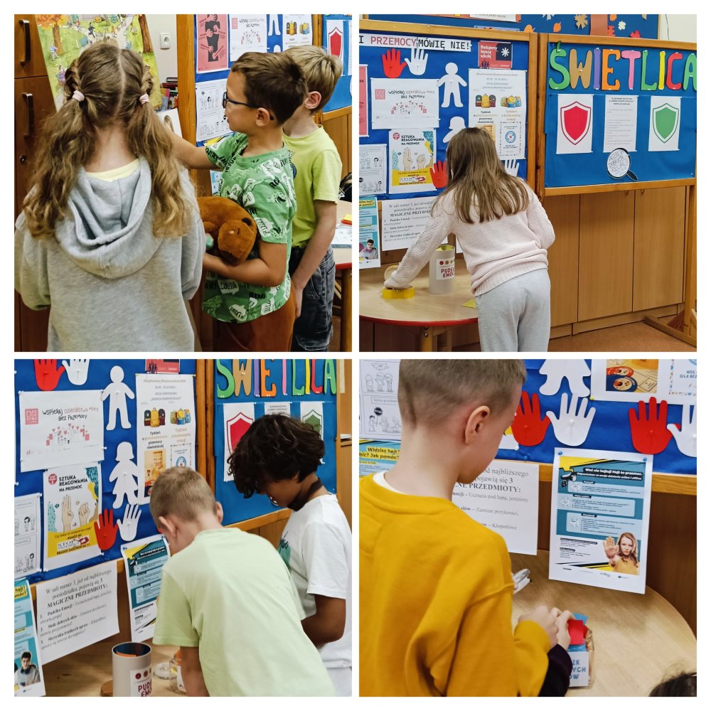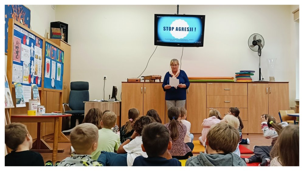 Rozmawialiśmy również o przemocy rówieśniczej oraz mieliśmy możliwość udziału w interaktywnym filmie pt.: „Otwórz się na pomoc: przemoc”. Następnie czytaliśmy książkę Agnieszki Stążki-Gawrysiak pt.: „Self – Regulation. Opowieści dla dzieci o tym, jak działać, gdy emocje biorą górę”. Opowiadanie „O dwóch kubkach i o tym, co się dzieje, kiedy skończy się paliwo” przedstawia trzyletnią Lenkę, siedmioletniego Kubę i ich Rodziców, którzy pomagają nam lepiej zrozumieć sytuacje stresowe i kontrolować zachowania wywołujące napięcie. Z empatyczną Rodzinką dowiedzieliśmy się, że „W samochodzie jest takie żółte światełko, które zapala się, kiedy w baku jest mało paliwa. Fajnie by było, gdyby ludzie mieli takie lampki […] od razu byłoby wiadomo, do kogo nie należy podchodzić”.