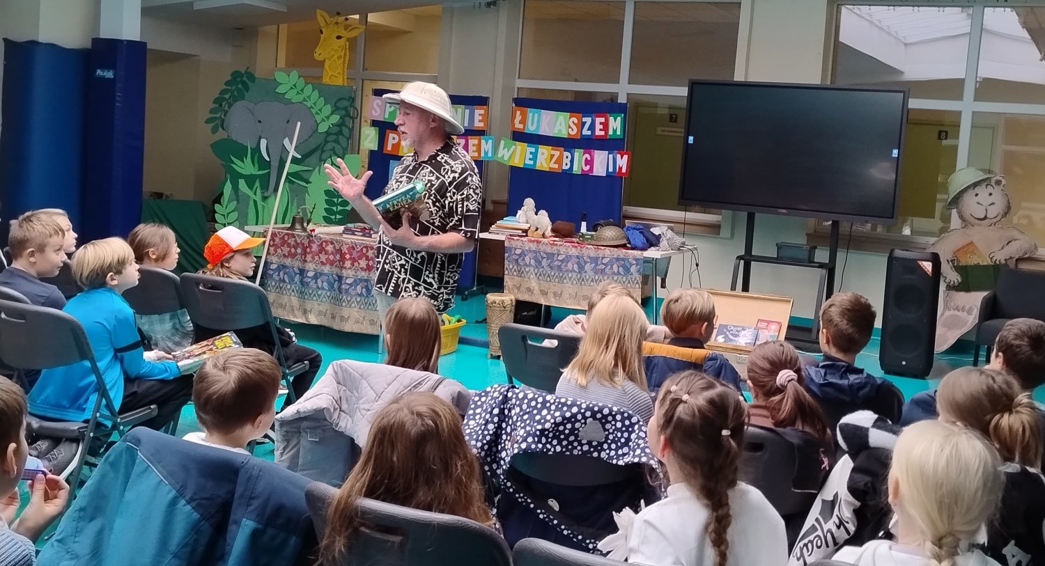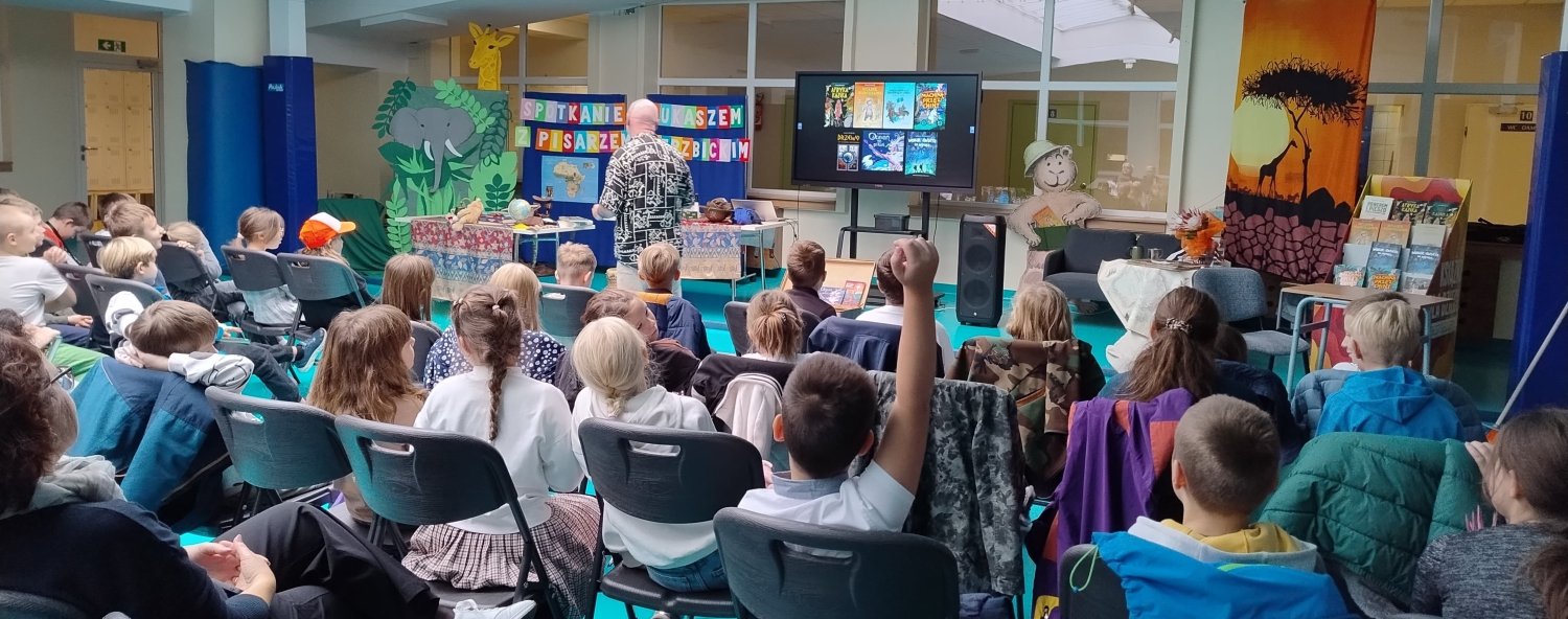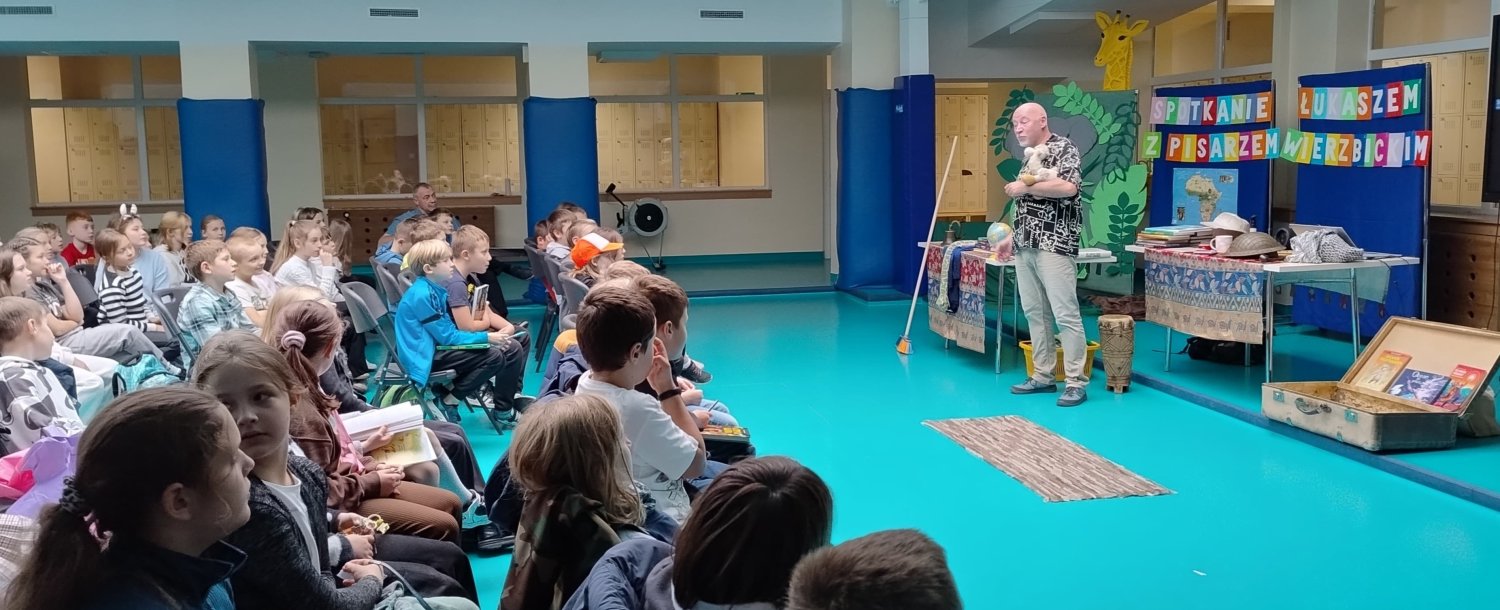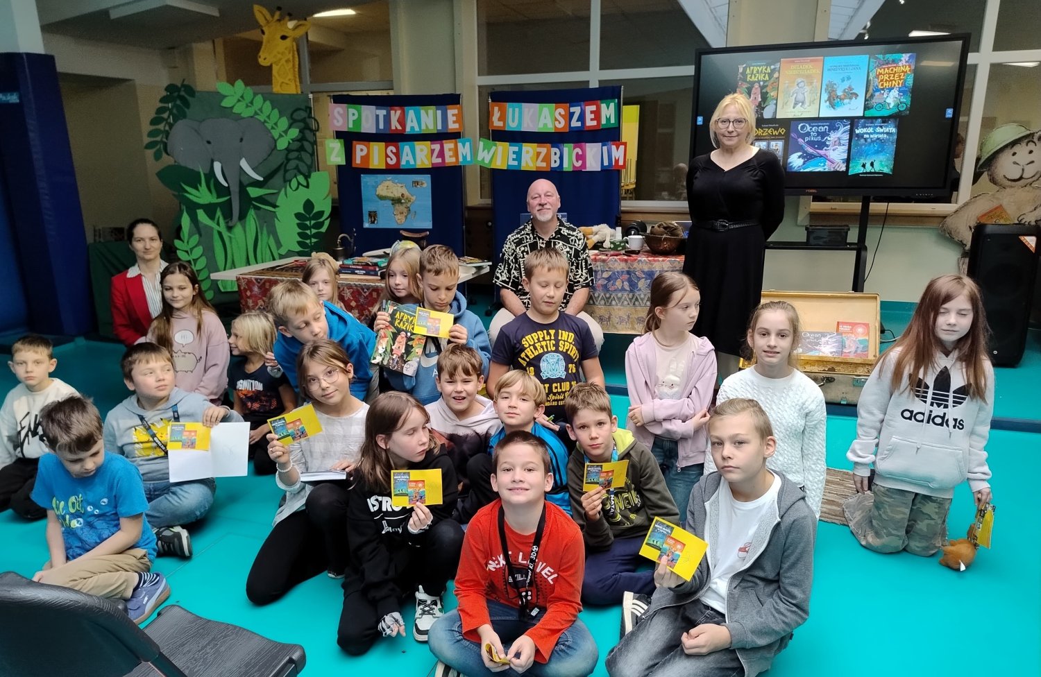 W poniedziałek 6 października 2025 r. nasza Szkoła gościła pisarza – pana Łukasza Wierzbickiego, autora dwóch lektur dla klas I-III pt. „Afryka Kazika” oraz „Dziadek i niedźwiadek”, a także wielu innych ciekawych i znanych książek: „Machiną przez Chiny”, „Podróż niesłychana Benedykta i Jana”, „Wokół świata na wariata”, „Ocean to pikuś”, „Co hrabia porabia? Listy spod Góry Kościuszki”, „Drzewo. Mity słowiańskie i inne opowieści”.