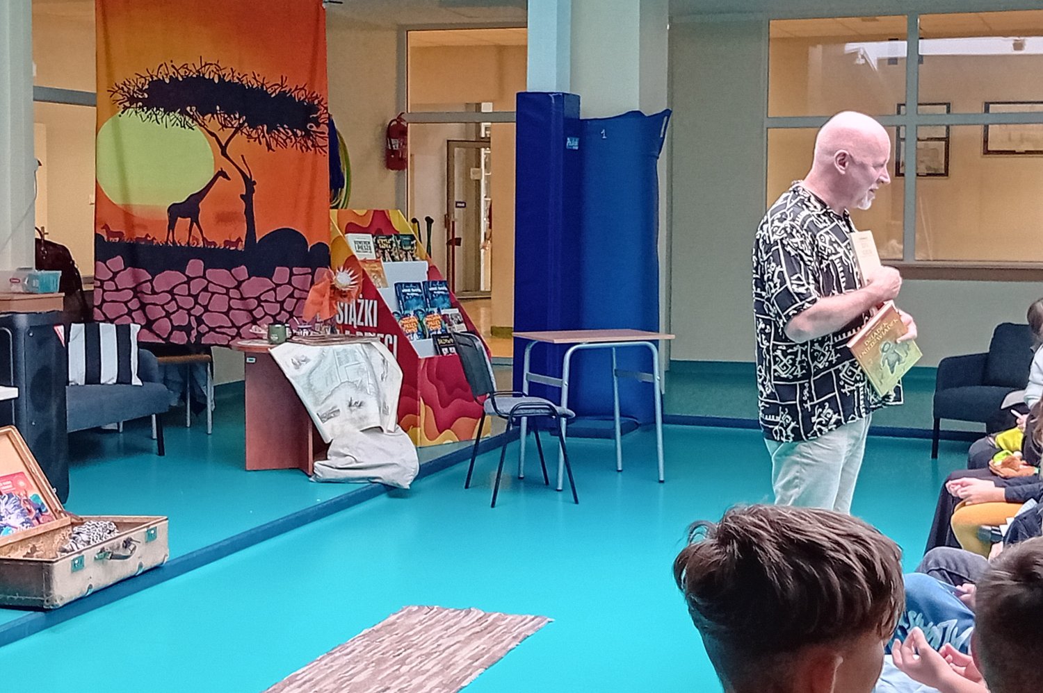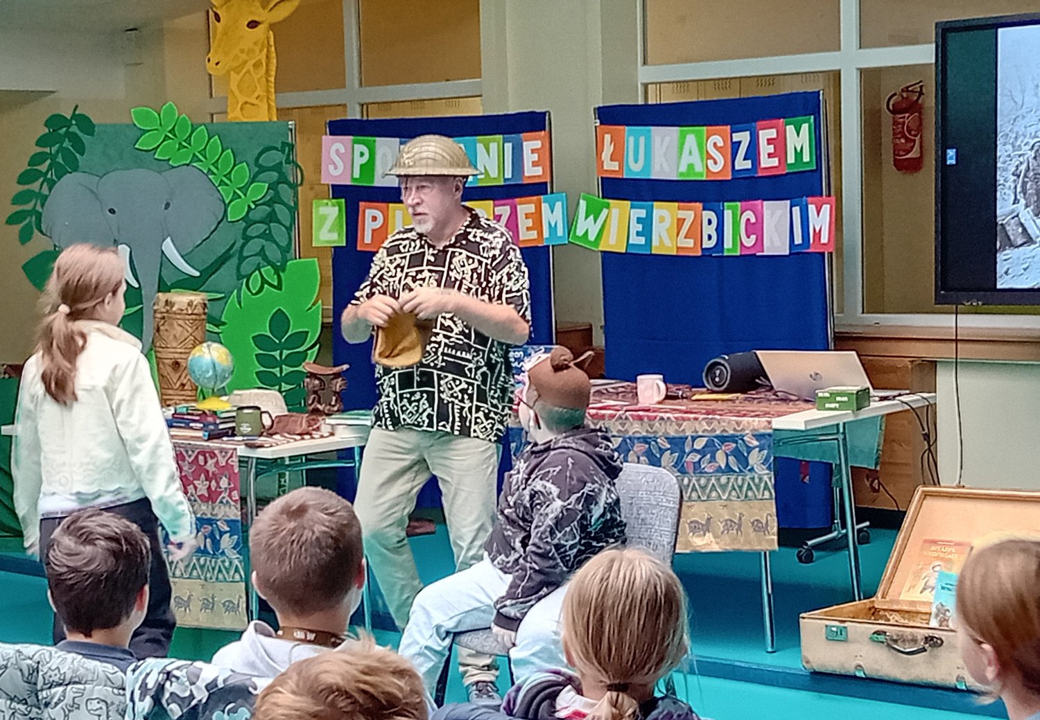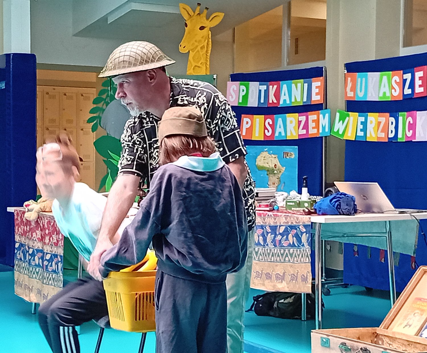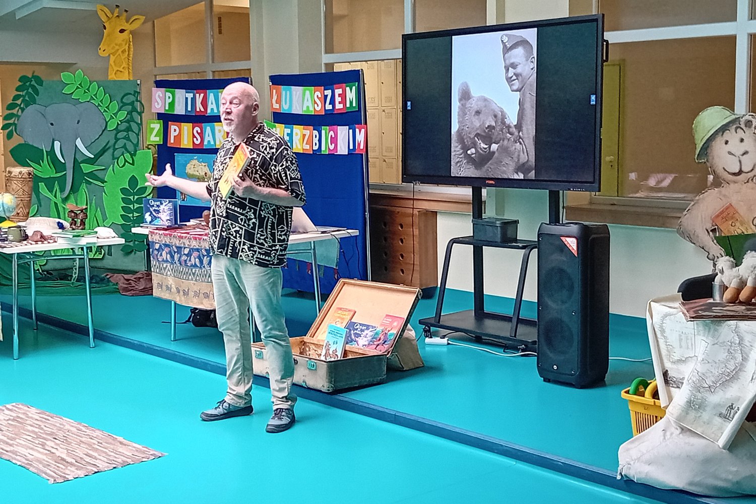 W poniedziałek 6 października 2025 r. nasza Szkoła gościła pisarza – pana Łukasza Wierzbickiego, autora dwóch lektur dla klas I-III pt. „Afryka Kazika” oraz „Dziadek i niedźwiadek”, a także wielu innych ciekawych i znanych książek: „Machiną przez Chiny”, „Podróż niesłychana Benedykta i Jana”, „Wokół świata na wariata”, „Ocean to pikuś”, „Co hrabia porabia? Listy spod Góry Kościuszki”, „Drzewo. Mity słowiańskie i inne opowieści”.