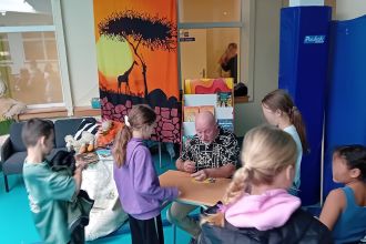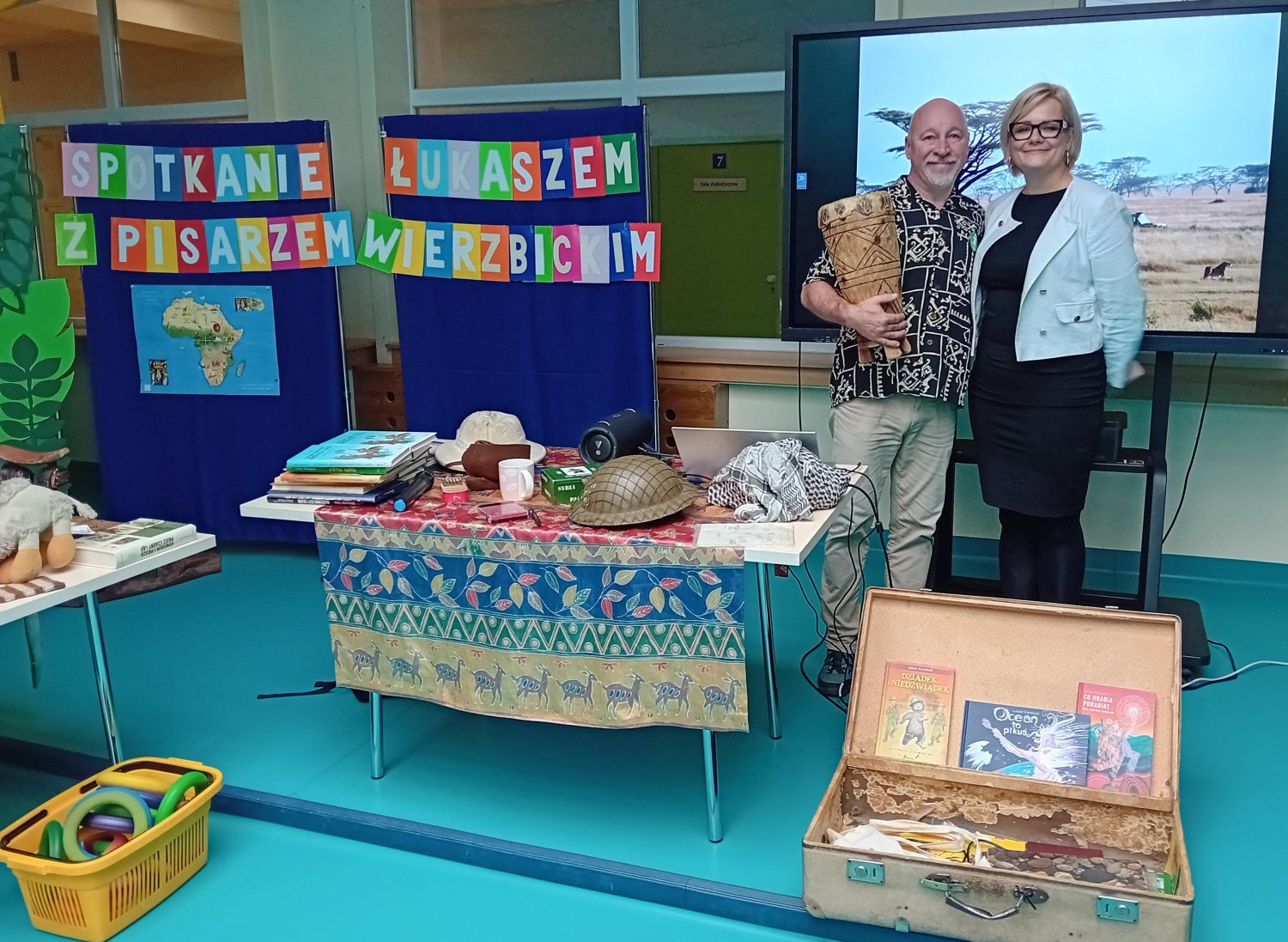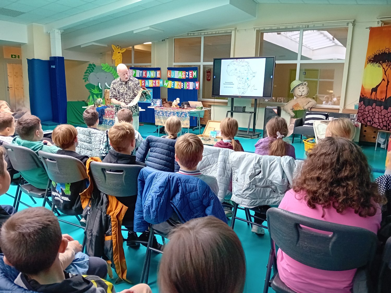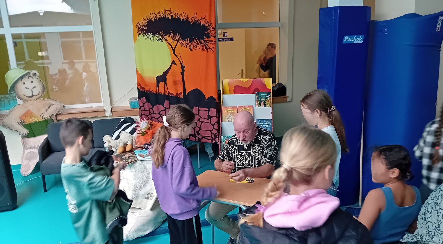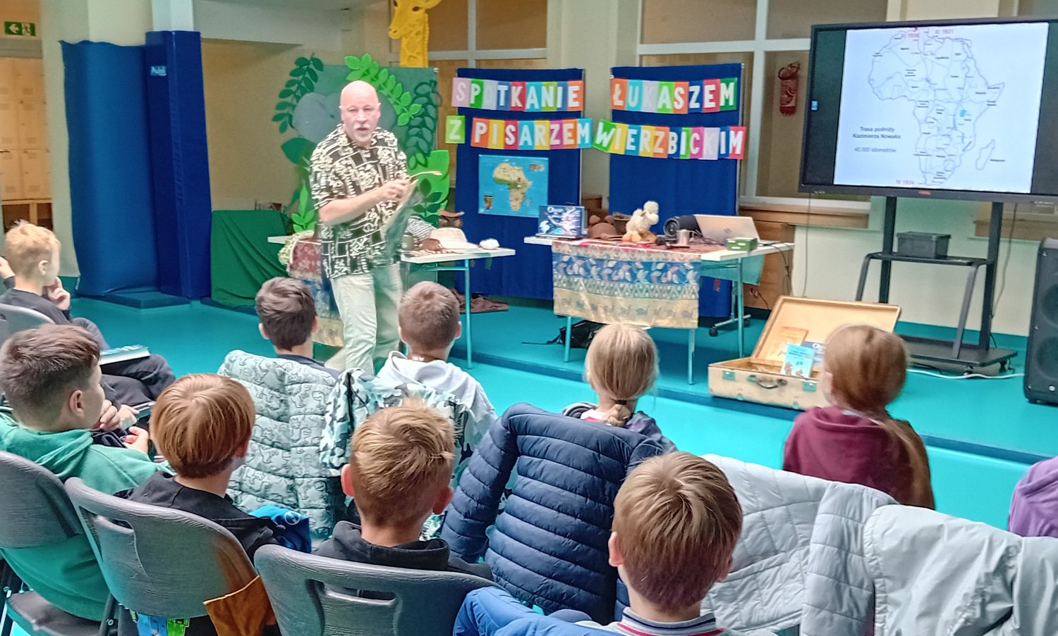 W poniedziałek 6 października 2025 r. nasza Szkoła gościła pisarza – pana Łukasza Wierzbickiego, autora dwóch lektur dla klas I-III pt. „Afryka Kazika” oraz „Dziadek i niedźwiadek”, a także wielu innych ciekawych i znanych książek: „Machiną przez Chiny”, „Podróż niesłychana Benedykta i Jana”, „Wokół świata na wariata”, „Ocean to pikuś”, „Co hrabia porabia? Listy spod Góry Kościuszki”, „Drzewo. Mity słowiańskie i inne opowieści”.