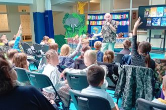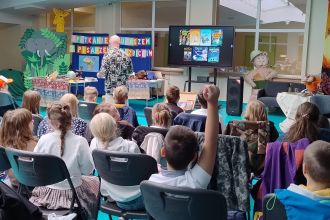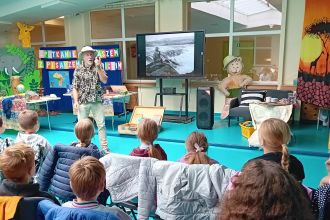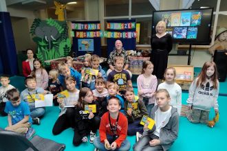 Dzieci z zaciekawieniem oglądały slajdy oraz rekwizyty nawiązujące do treści książek, zadawały autorowi pytania, a także miały możliwość otrzymania dedykacji w książce lub autografu.