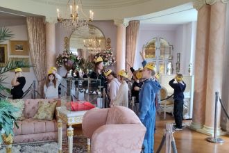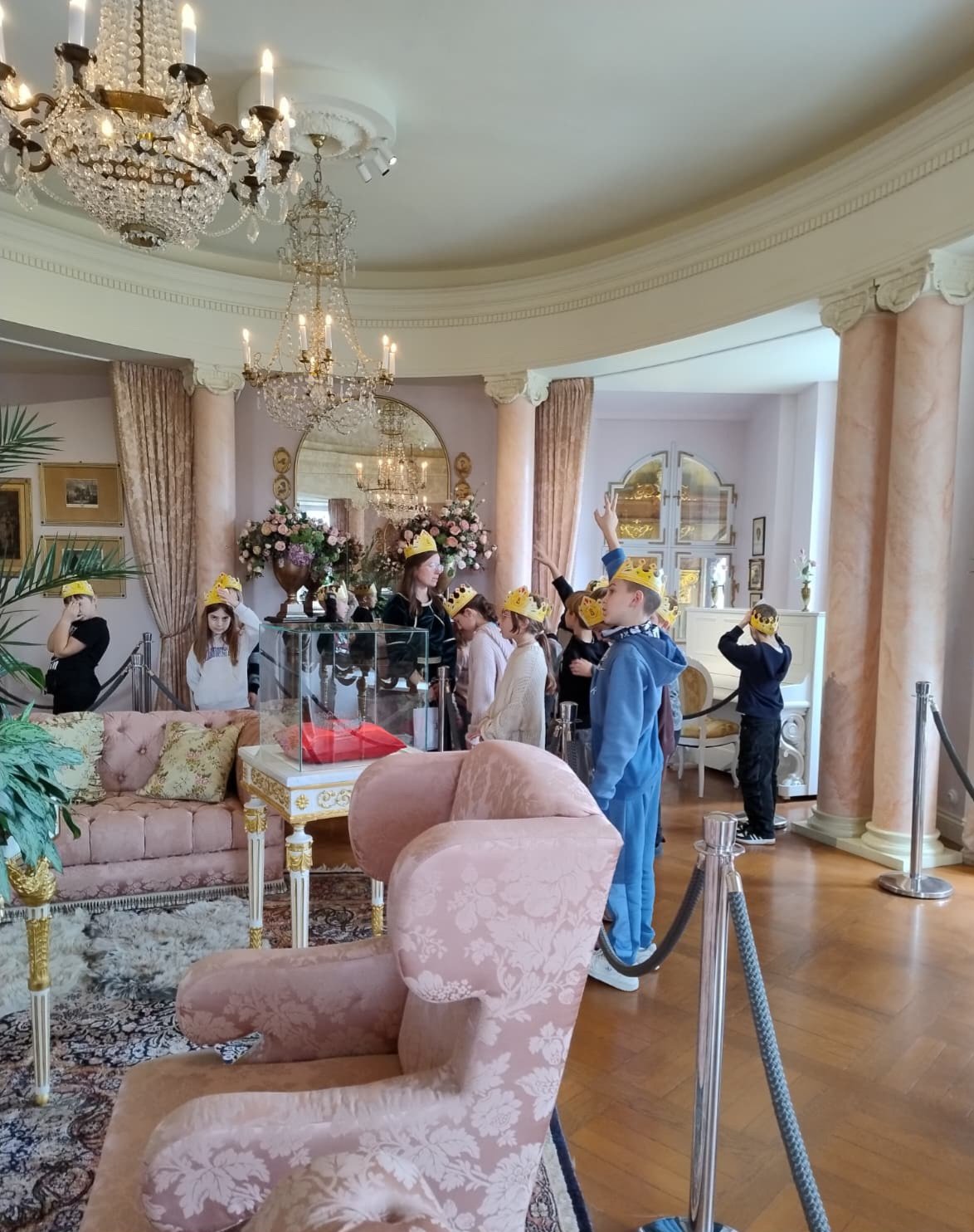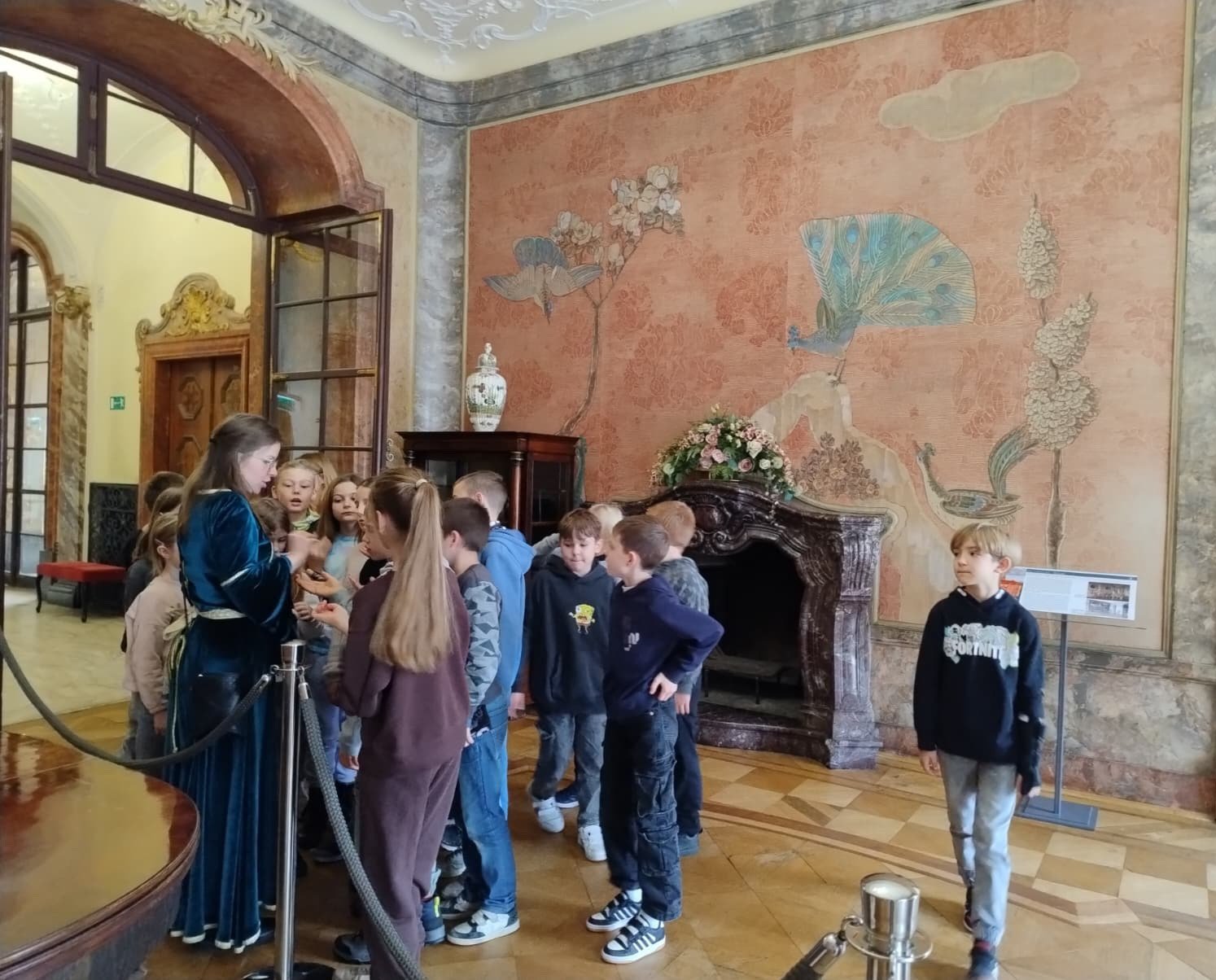 Podczas spaceru po zamku dowiedzieliśmy się, ile pawi jest w Salonie Chińskim, jak długi naszyjnik z pereł posiadała księżna Daisy, co robił w zamku wilczek i czy zamek został zbudowany na wierzchołku skalnym zwanym obecnie Skałą Szczęścia.