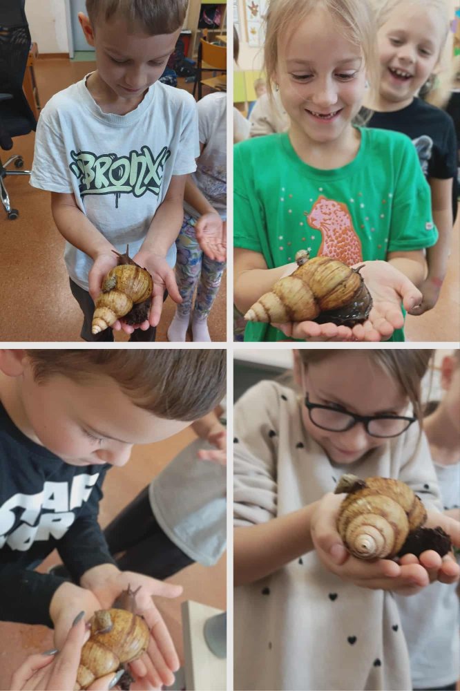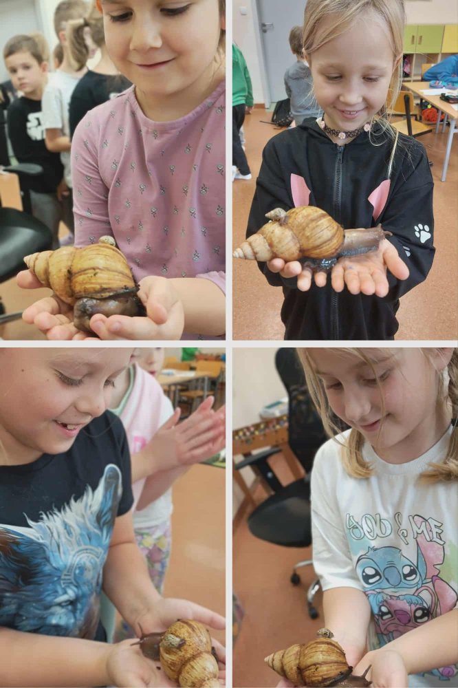 Największe emocje wzbudziła jednak bezpośrednia obserwacja żywego ślimaka. Dzieci mogły z bliska przyjrzeć się jego budowie, a chętni uczniowie – wziąć go ostrożnie na ręce i poczuć, jak delikatnie się porusza.