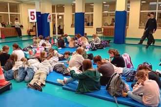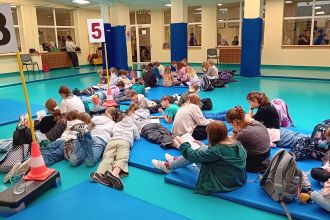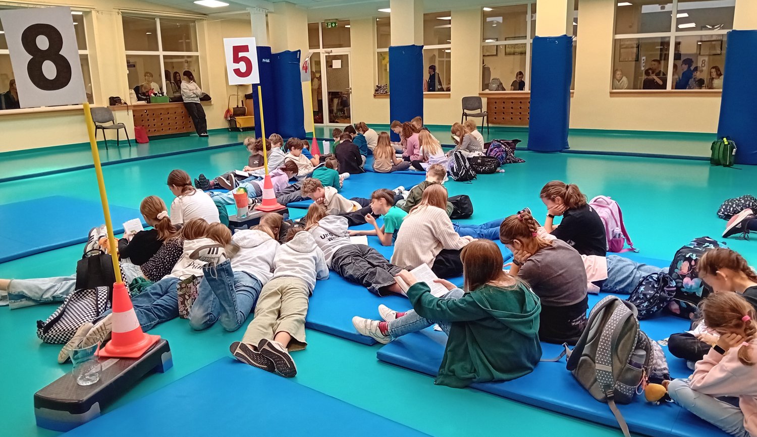 zajęli wygodne miejsca na materacach przygotowanych przez wolontariuszy z klas VIII.