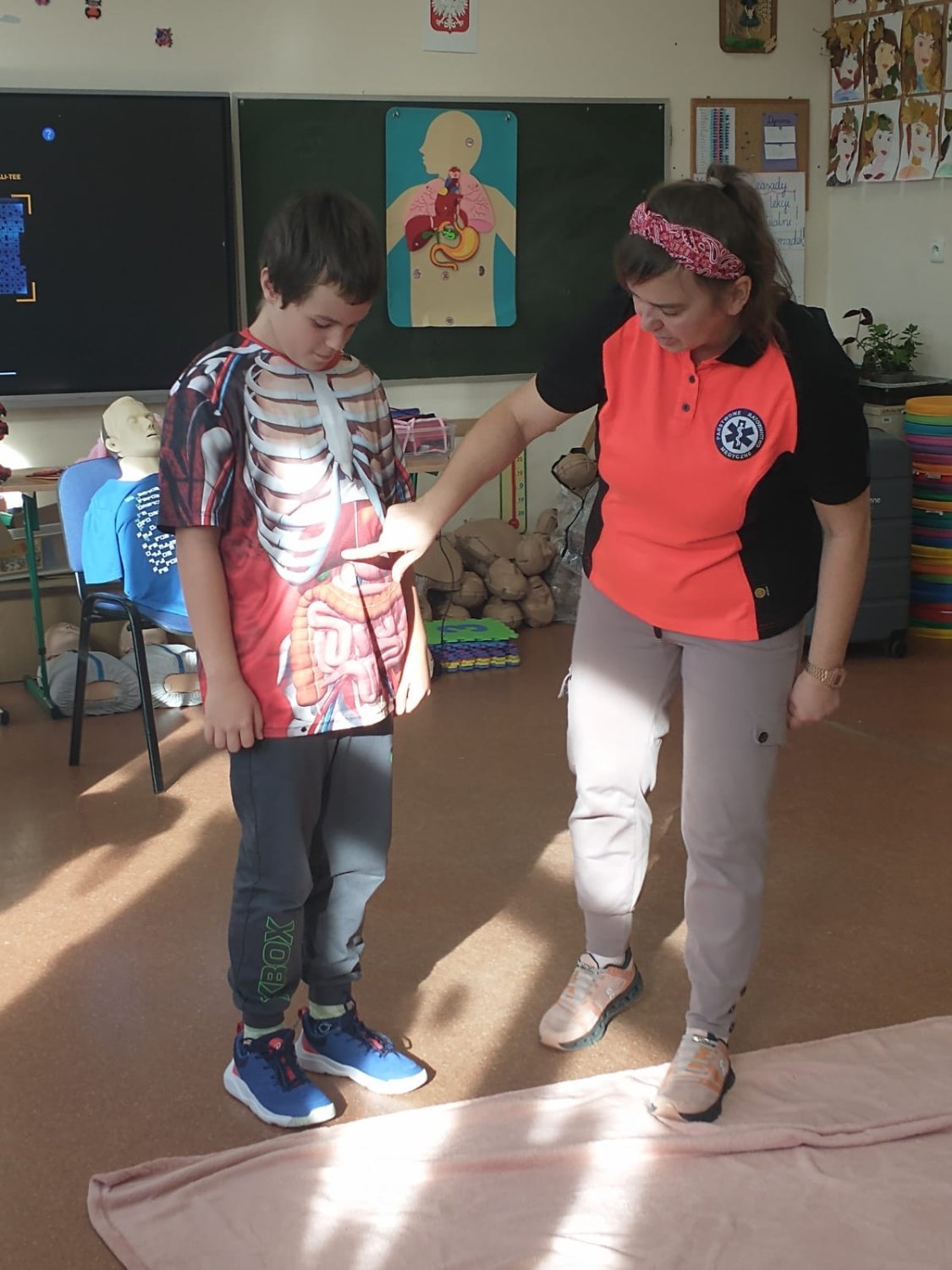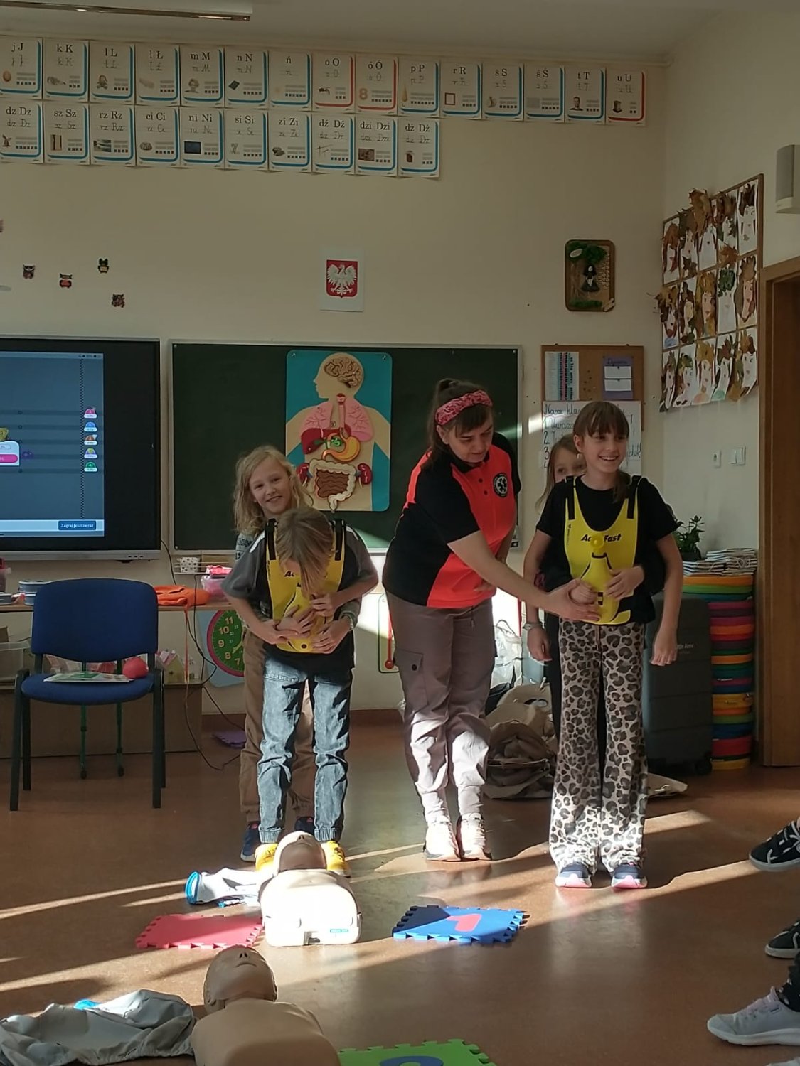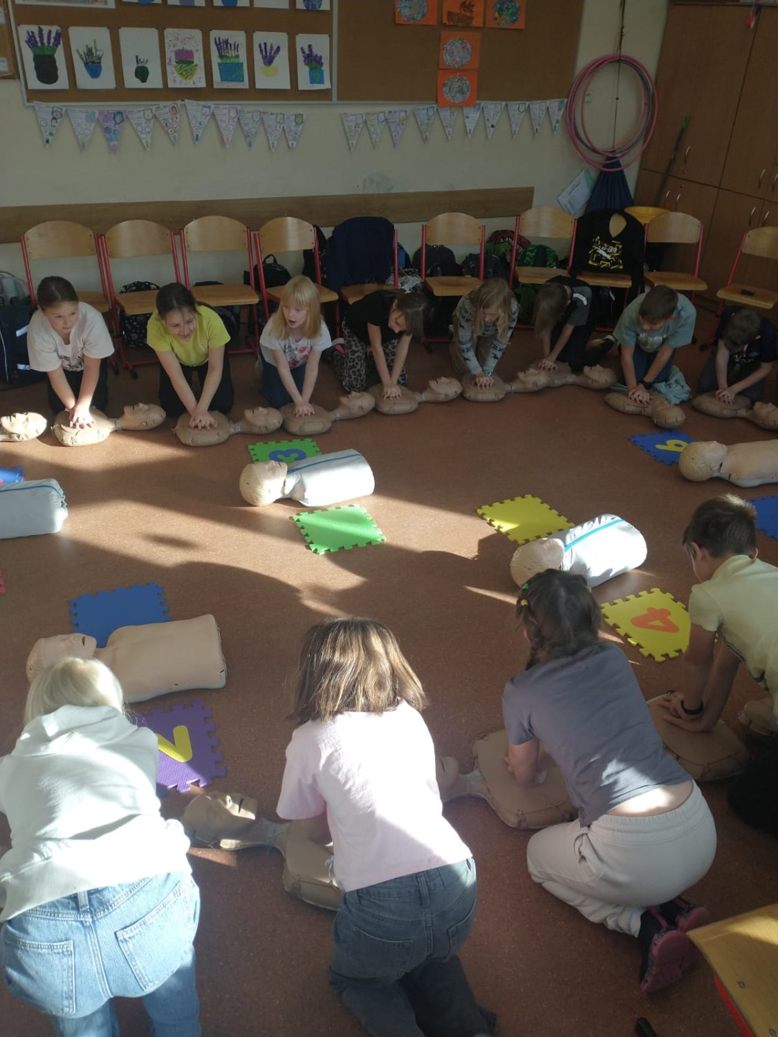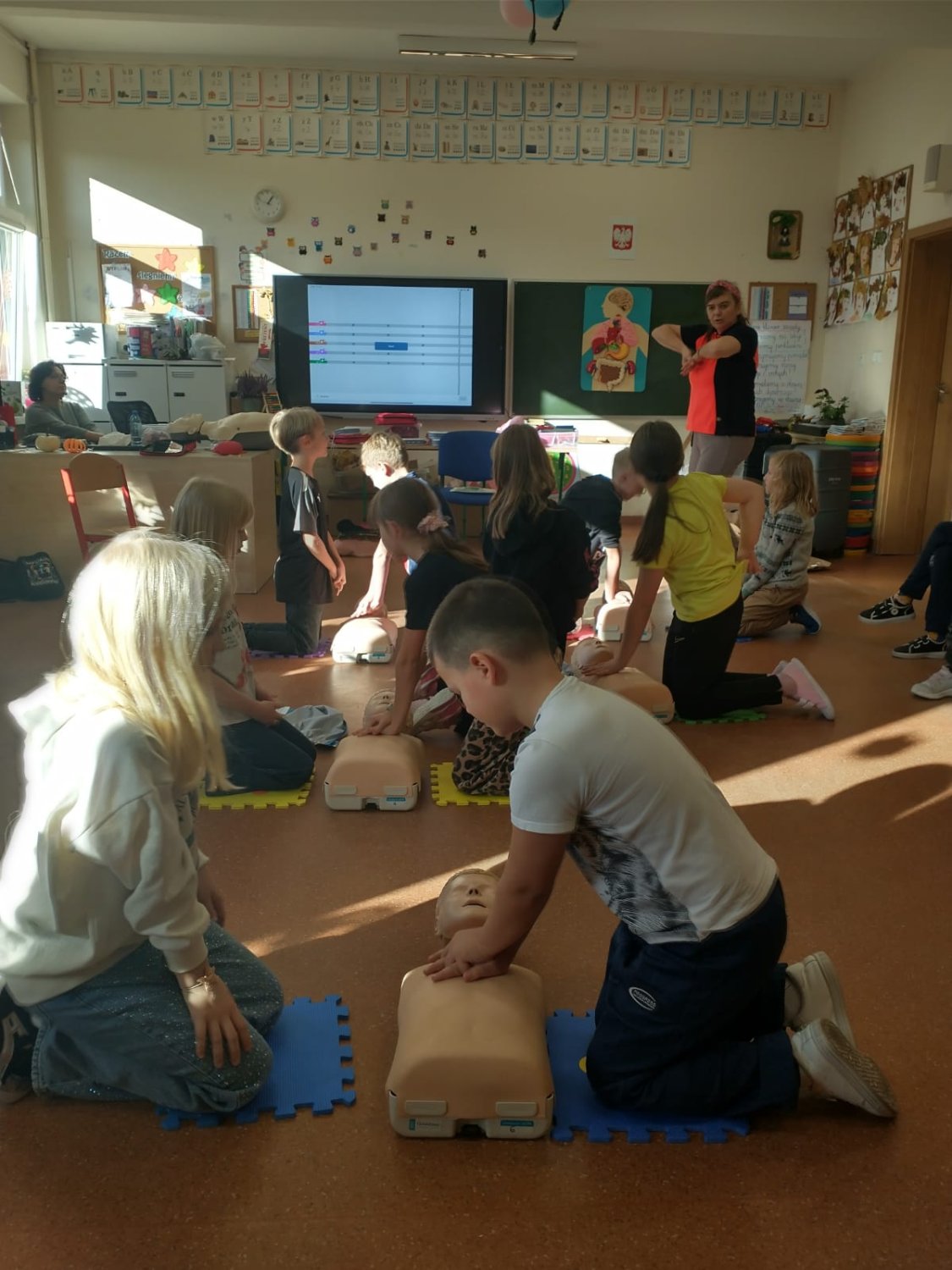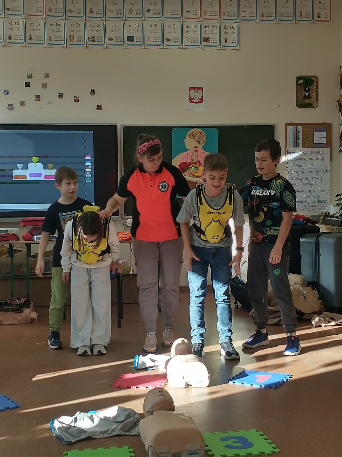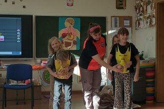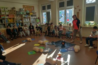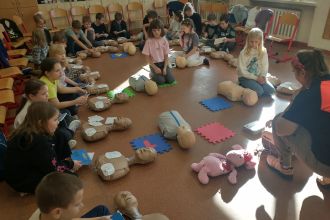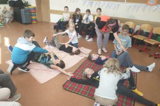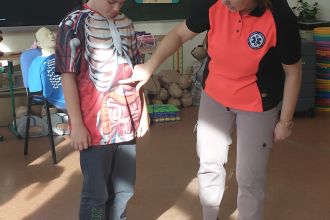 Dnia 5.11. klasa III B wzięła udział w warsztatach dotyczących udzielania pierwszej pomocy. Uczniowie dowiedzieli się, w jakich sytuacjach i w jaki sposób należy wzywać pogotowie oraz jak układać poszkodowanego w pozycji bezpiecznej. Samodzielnie przećwiczyli wykonywanie resuscytacji oraz defibrylacji. Nauczyli się także, jak udzielać pomocy w sytuacji zadławienia. Za pomocą wyjątkowych pomocy dydaktycznych i nowoczesnych narzędzi multimedialnych mieli szansę zajrzeć w głąb ludzkiego ciała i dowiedzieć się, gdzie umieszczone są poszczególne organy człowieka oraz jakie są ich zadania. Dzięki przeprowadzonemu doświadczeniu dzieci uzmysłowiły sobie, jak ważne jest noszenie kasku podczas jazdy na rowerze, deskorolce czy hulajnodze. Udział w warsztatach uświadomił im, że sami mogą stać się superbohaterami, a w ich działaniu tkwi moc ratowania ludzkiego życia.