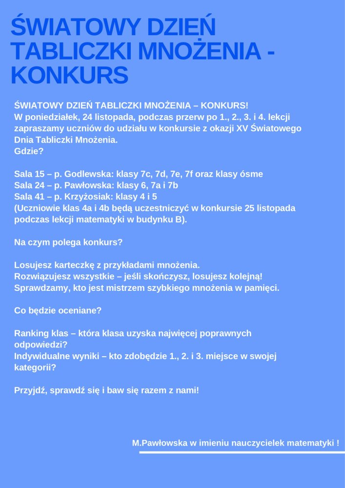 AktualnościNawigacja » Start » AktualnościŚwiatowy Dzień TABLICZKI MNOŻENIA - konkurs21 listopada 2025 | Magdalena Pawłowska | Powrót do spisu wiadomości