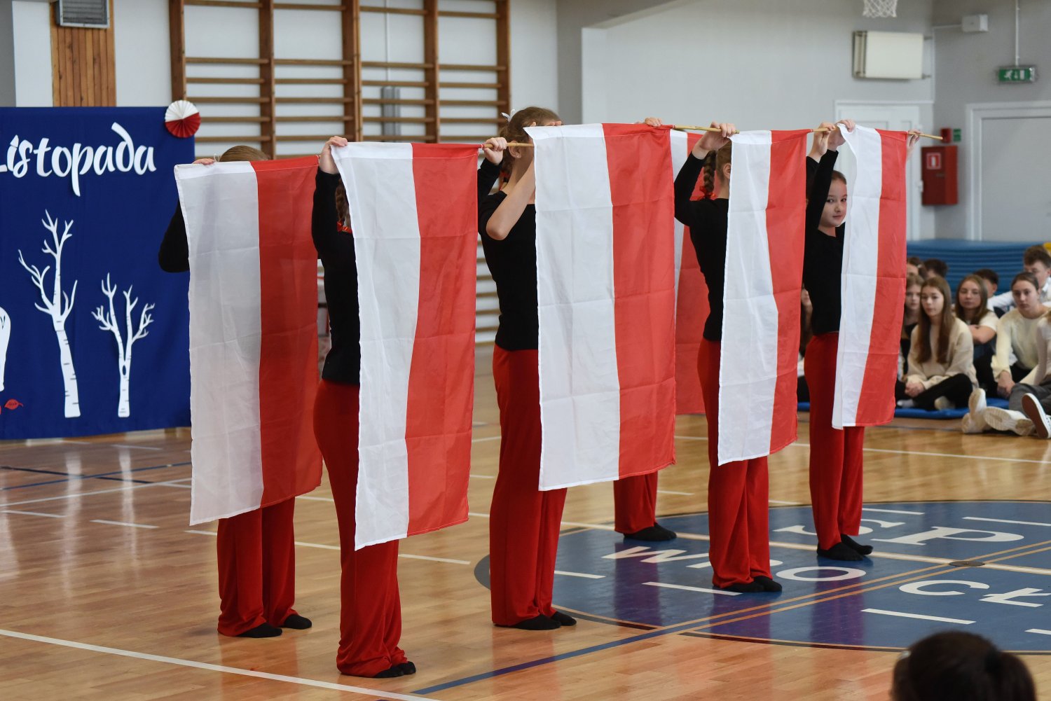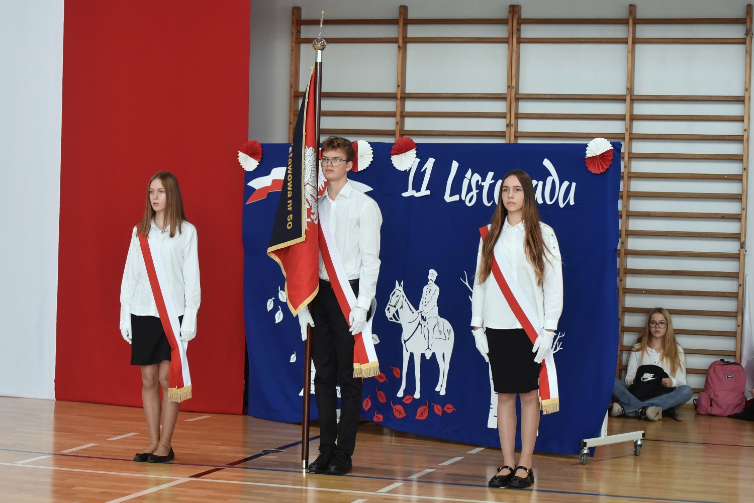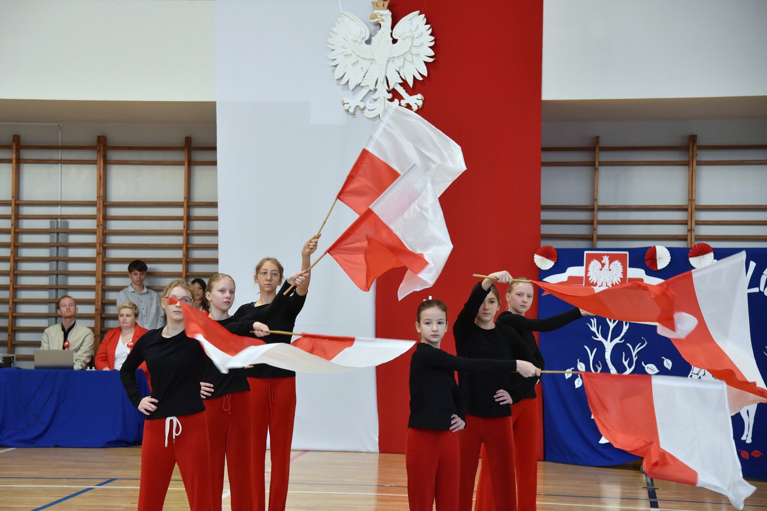 Następnie wprowadzono sztandar szkoły i odśpiewano Hymn Polski – a w tej chwili cała sala stała się jednym sercem bijącym w rytmie dumy i wdzięczności wobec Ojczyzny.
