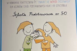 21 listopada uczniowie klas trzecich, którzy brali udział w stworzeniu pracy plastycznej na konkurs „Znajdź się wśród życzliwych” zorganizowany przez UMW odebrali nagrodę za zajęcie drugiego miejsca.