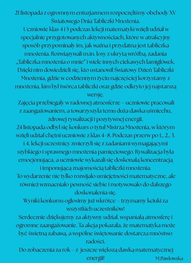 AktualnościNawigacja » Start » AktualnościObchody Światowego Dnia Tabliczki Mnożenia1 grudnia 2025 | Magdalena Pawłowska | Powrót do spisu wiadomości