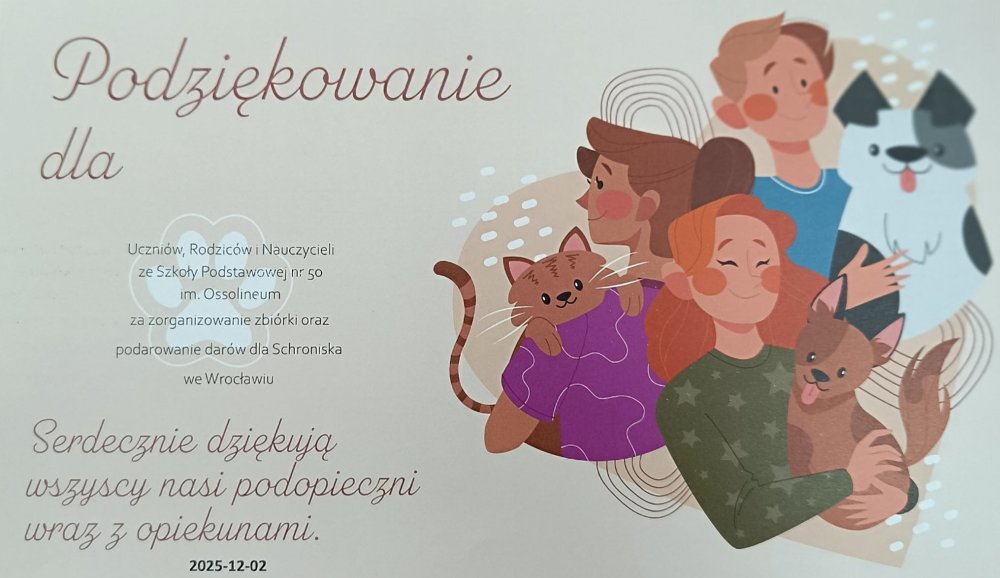 We wtorek (2.12.2025r.) wolontariusze Szkolnego Koła Wolontariatu odwiedzili Schronisko dla Bezdomnych Zwierząt przy ul. Ślazowej we Wrocławiu. Wyjazd był podsumowaniem akcji „Pełna miska dla schroniska”, którą zorganizowaliśmy w naszej szkole, aby wesprzeć czworonożnych podopiecznych tej placówki.