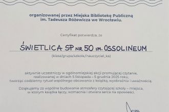 Od 5 listopada do 5 grudnia 2025 r. codziennie czytaliśmy dzieciom przez piętnaście minut rozmaite pozycje literackie. Zajęcia czytelnicze upływały w niezwykle spokojnej i pełnej zaciekawienia atmosferze. Rozmawialiśmy o bohaterach naszych ulubionych książek, graliśmy w bajkowe memory, a także mogliśmy korzystać z bogatego księgozbioru i przytulnej czytelni w bibliotece szkolnej. Uczniowie obcowali z literaturą dziecięcą: wierszami, opowiadaniami, legendami, bajkami terapeutycznymi oraz „perełkami”, nowościami na rynkach targów czytelniczych. Dzieci poznały magię cyfrowej wersji książek mówionych, czyli audiobooków i książek rozkładanych 3D z przestrzennymi ilustracjami i ruchomymi elementami. Wybraliśmy się na wirtualny spacer po wrocławskich bibliotekach i nowoczesnej Mediatece.