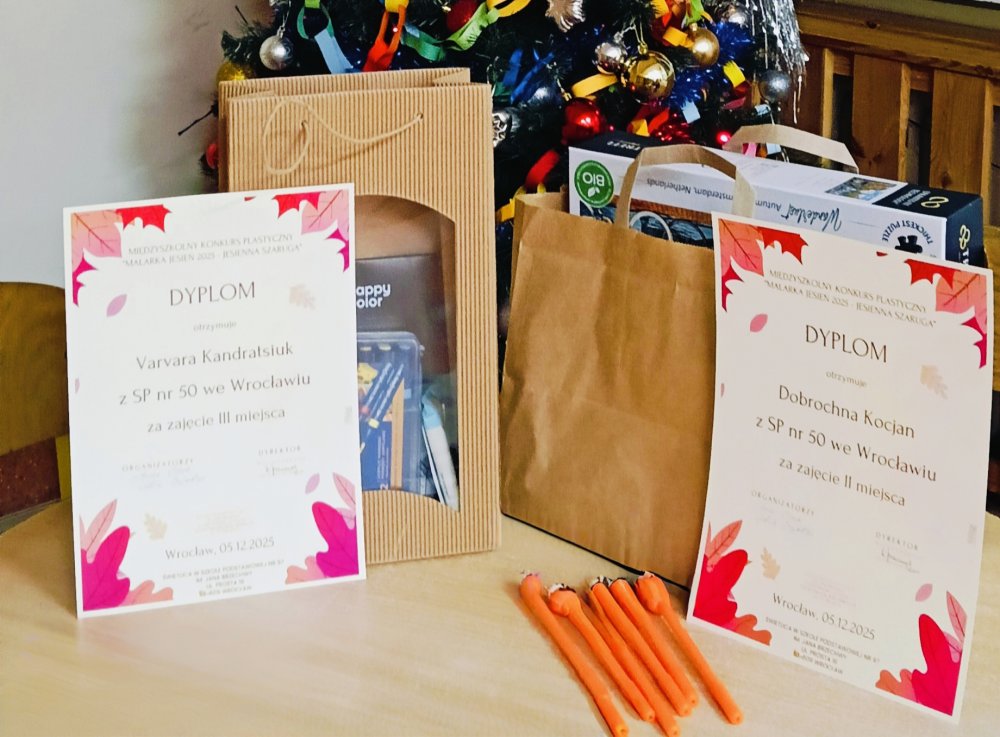 Z wielką radością informujemy o sukcesach Świetliczaków w Międzyszkolnym Konkursie Plastycznym „MALARKA JESIEŃ 2025 - JESIENNA SZARUGA” zorganizowanym przez Szkołę Podstawową nr 97 im. Jana Brzechwy we Wrocławiu.