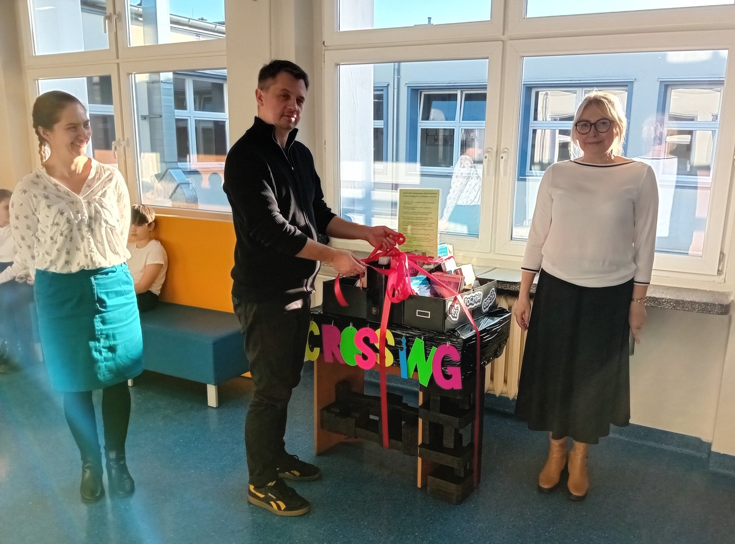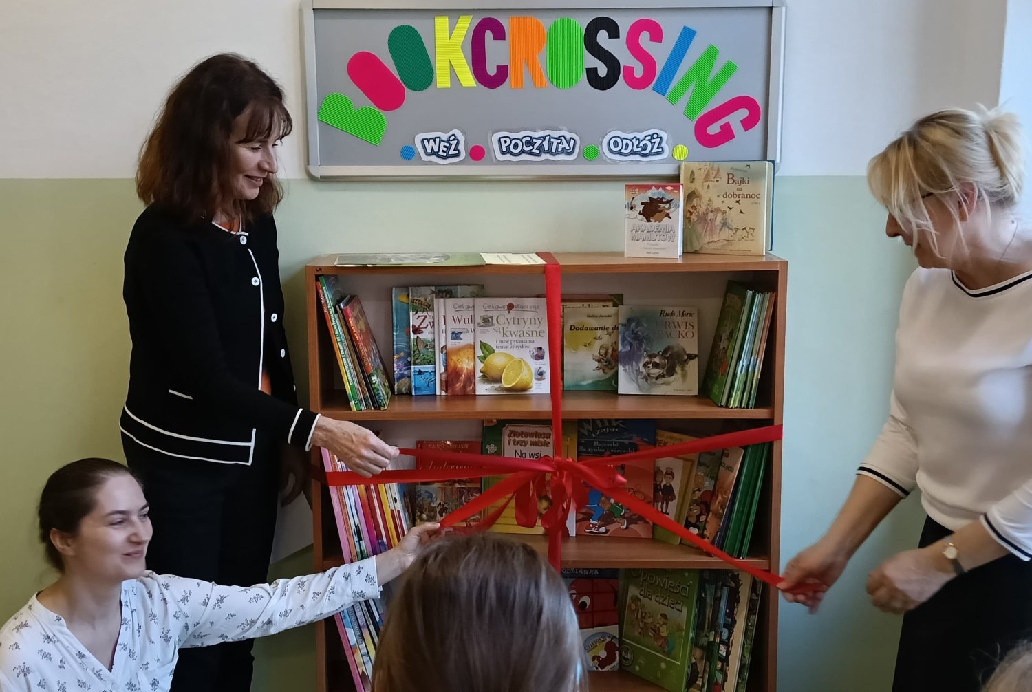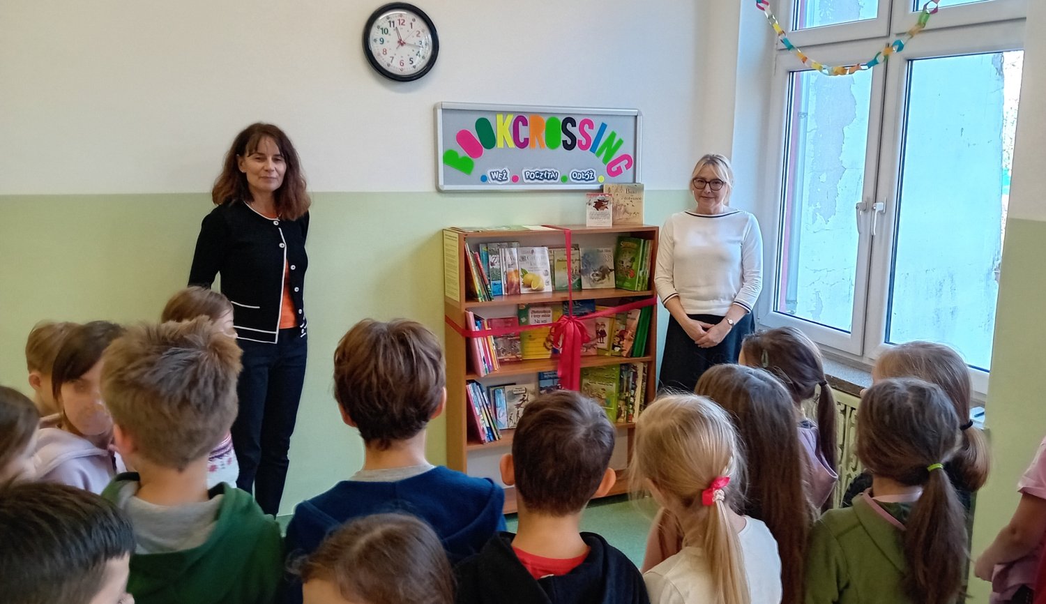 Zebrani poznali ideę bookcrossingu, a pan dyrektor Jarosław Jaroszewicz i pani dyrektor Mariola Ludynia podkreślili jego wznowienie w symboliczny sposób poprzez rozwiązanie kokardy z czerwonej wstążki.