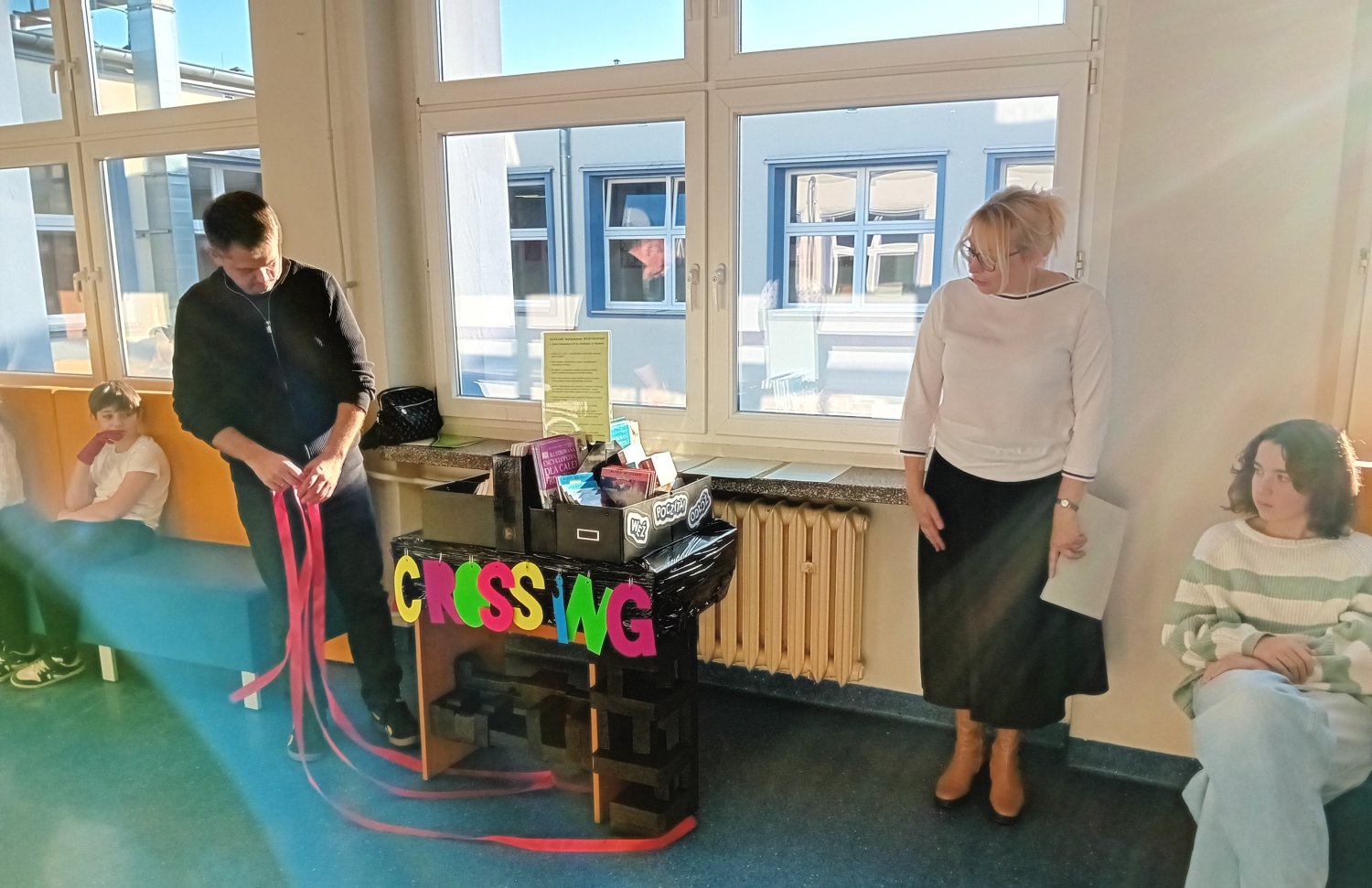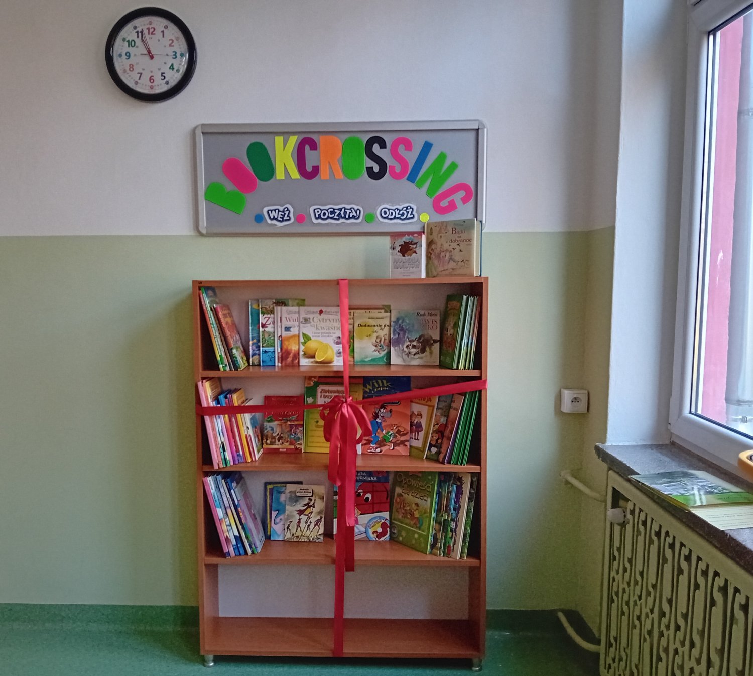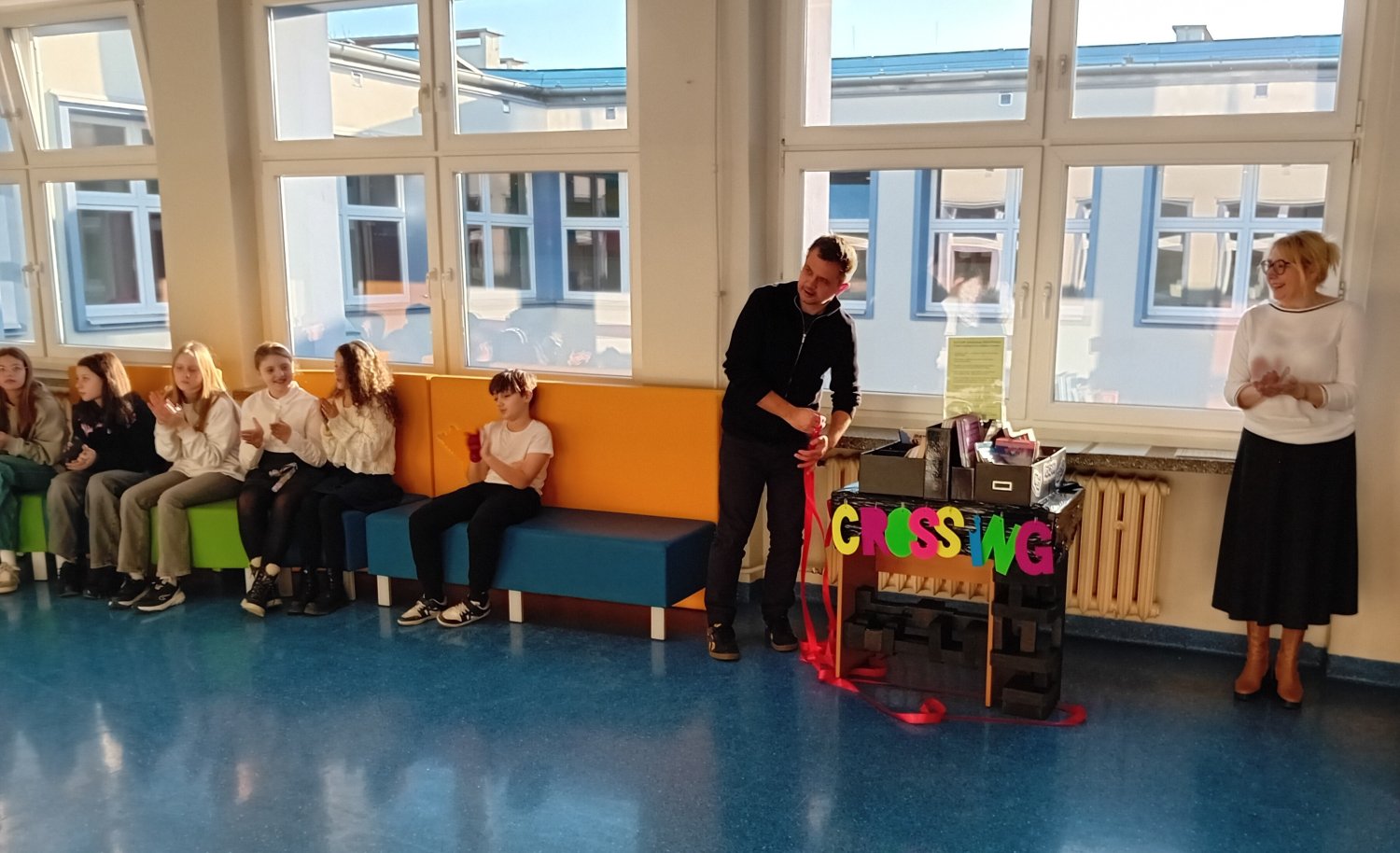 Zebrani poznali ideę bookcrossingu, a pan dyrektor Jarosław Jaroszewicz i pani dyrektor Mariola Ludynia podkreślili jego wznowienie w symboliczny sposób poprzez rozwiązanie kokardy z czerwonej wstążki.