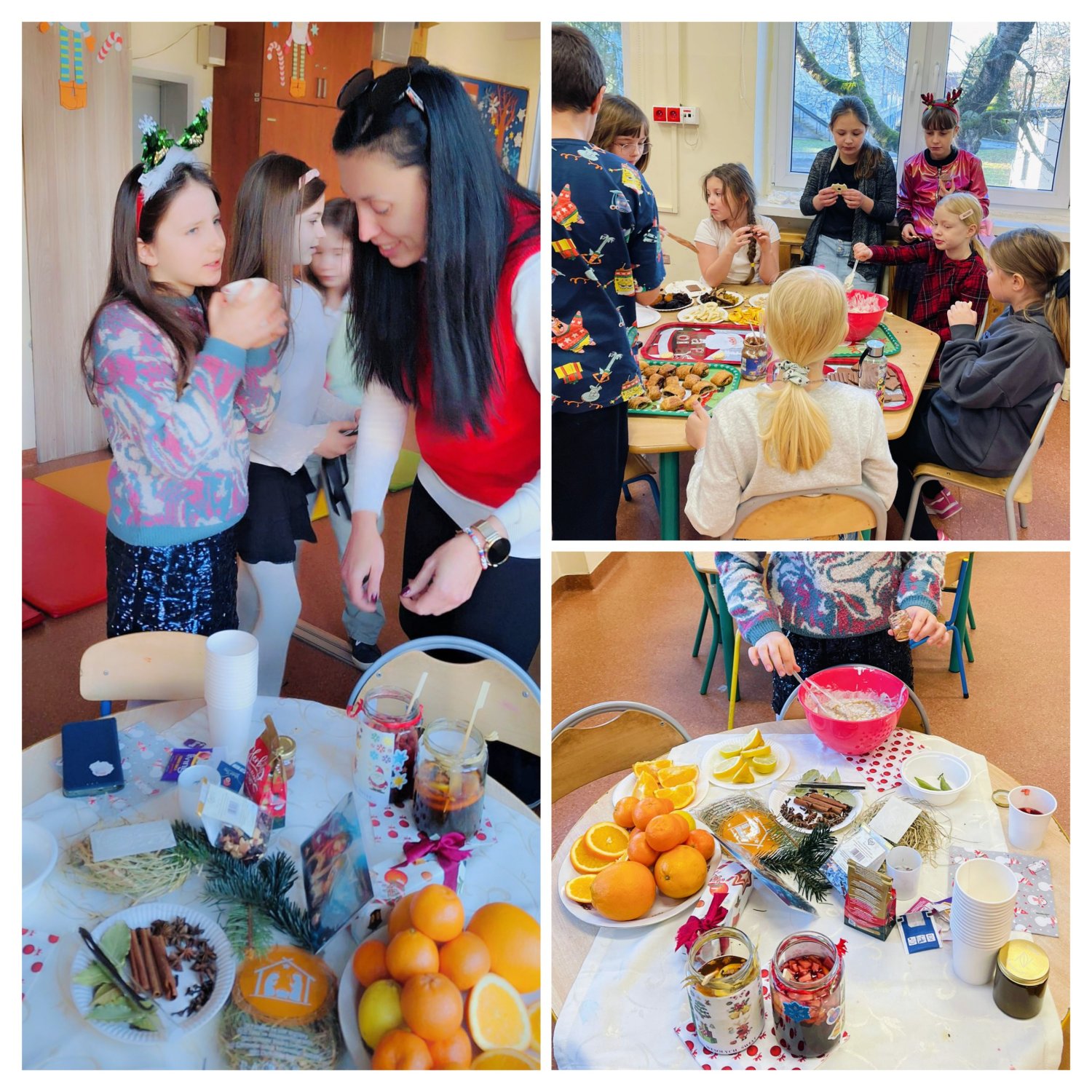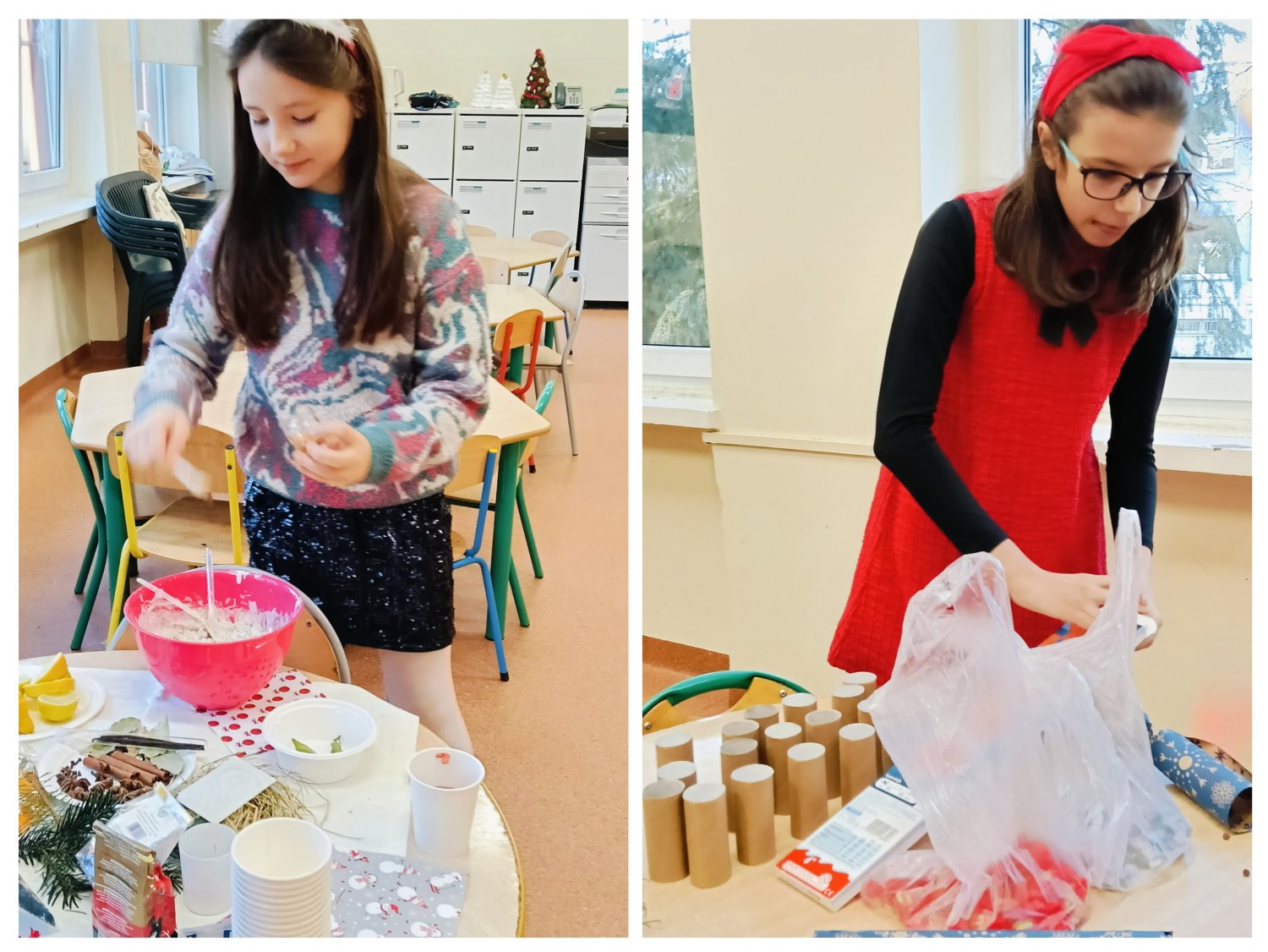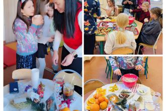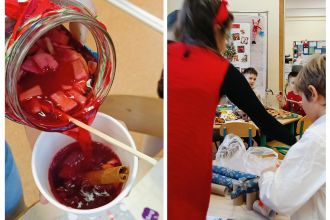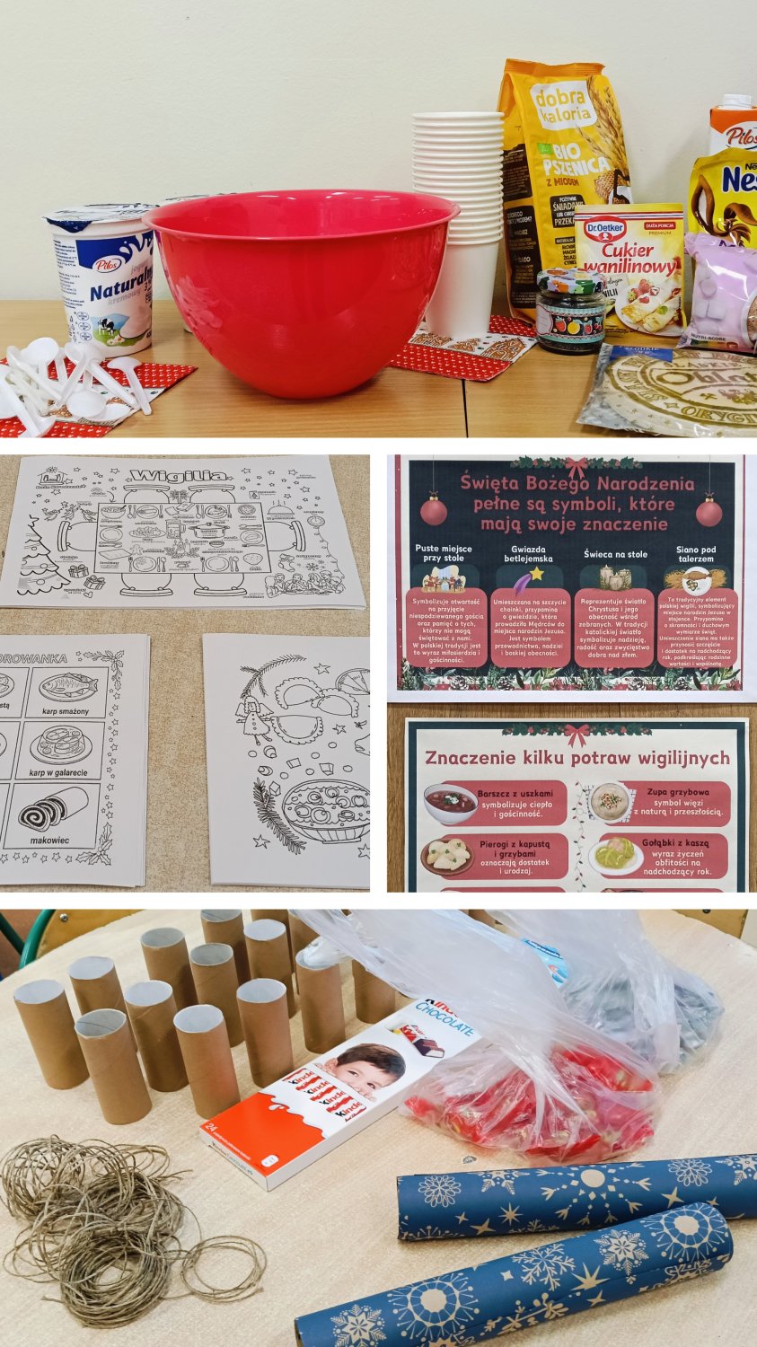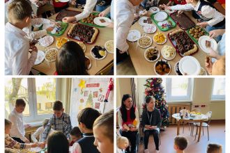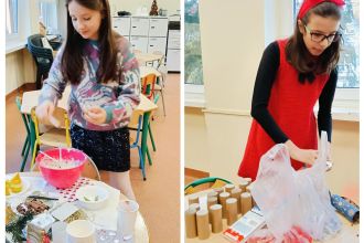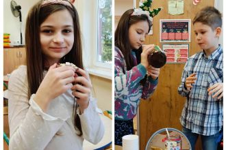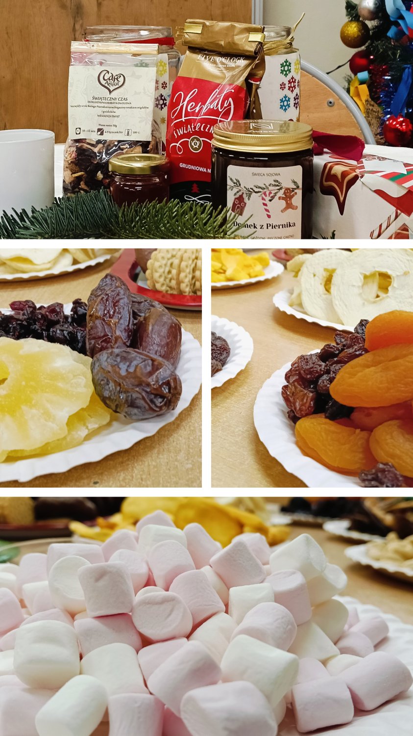 Kiedy magia świąt zapukała do drzwi świetlicy, a migoczące lampki, kolorowe bombki i zapach igliwia sprawiły, że uśmiechy same pojawiały się na twarzach... Padło ważne pytanie: „Czym pachną święta w Twoim domu?”. Świetliczaki radośnie wymieniały zapach pierniczków, pierogów, pomarańczy, ciast, barszczu z uszkami. Najwięcej emocji przyniosły jednak warsztaty kulinarno-sensoryczne. Dzieci miały możliwość poznać jak wyglądają, smakują i pachną składniki świątecznych herbat, potraw oraz ciast. Młodzi kucharze z ogromnym zapałem zabrali się do pracy – było mieszanie, dekorowanie i oczywiście… podjadanie! Uczniowie przygotowali dietetyczną kutię, rozgrzewające herbaty i kakao z piankami. Cudowny zapach świątecznych wypieków unosił się po sali, a każdy chciał pochwalić się swoim kulinarnym specjałem. Świetliczaki mogły również przygotować prezenty dla swoich bliskich - papierowe cukierki wypełnione słodyczami, orzechami, ciasteczkami.