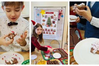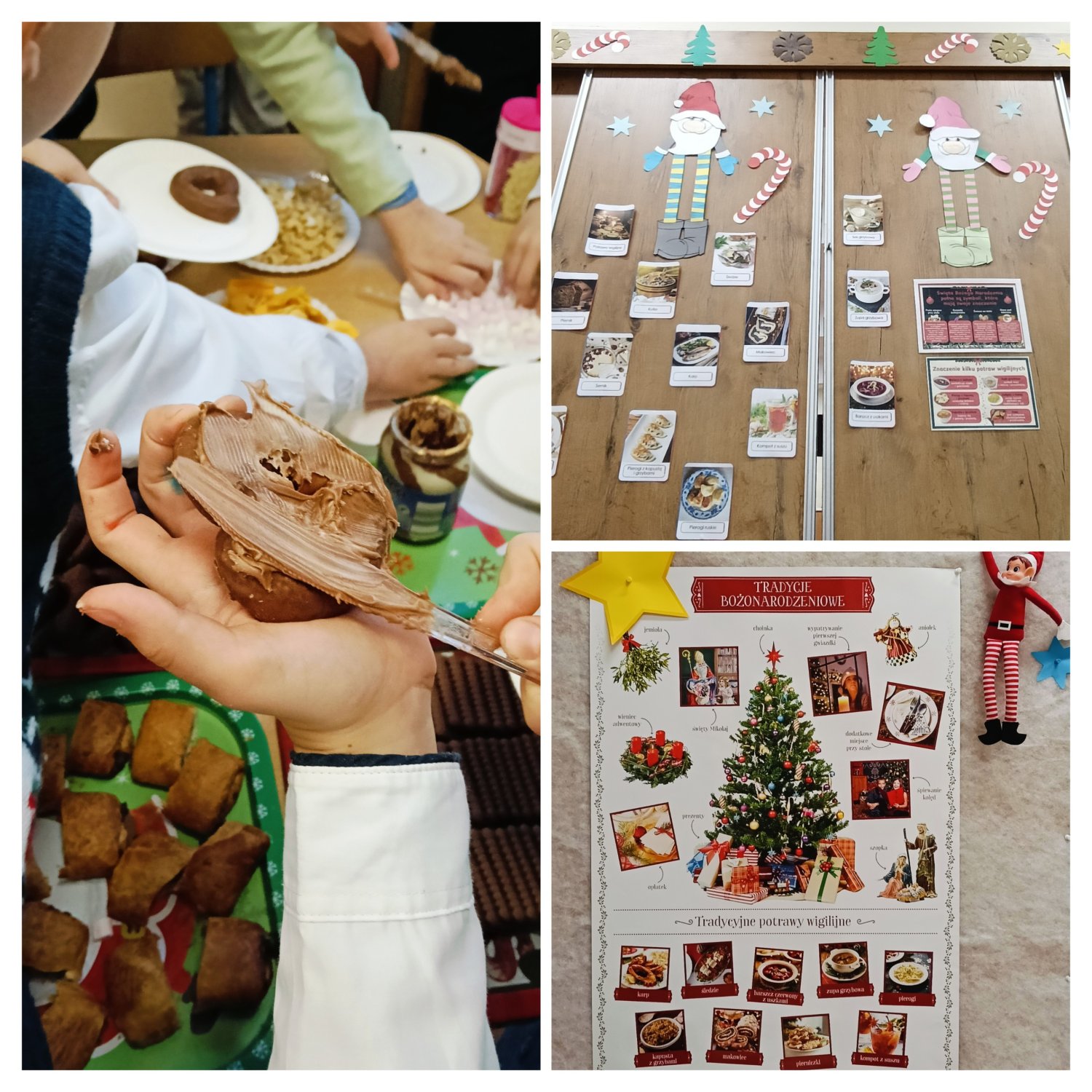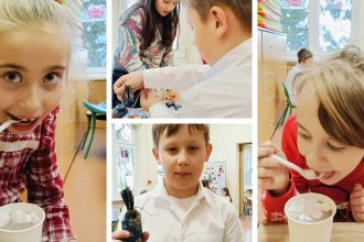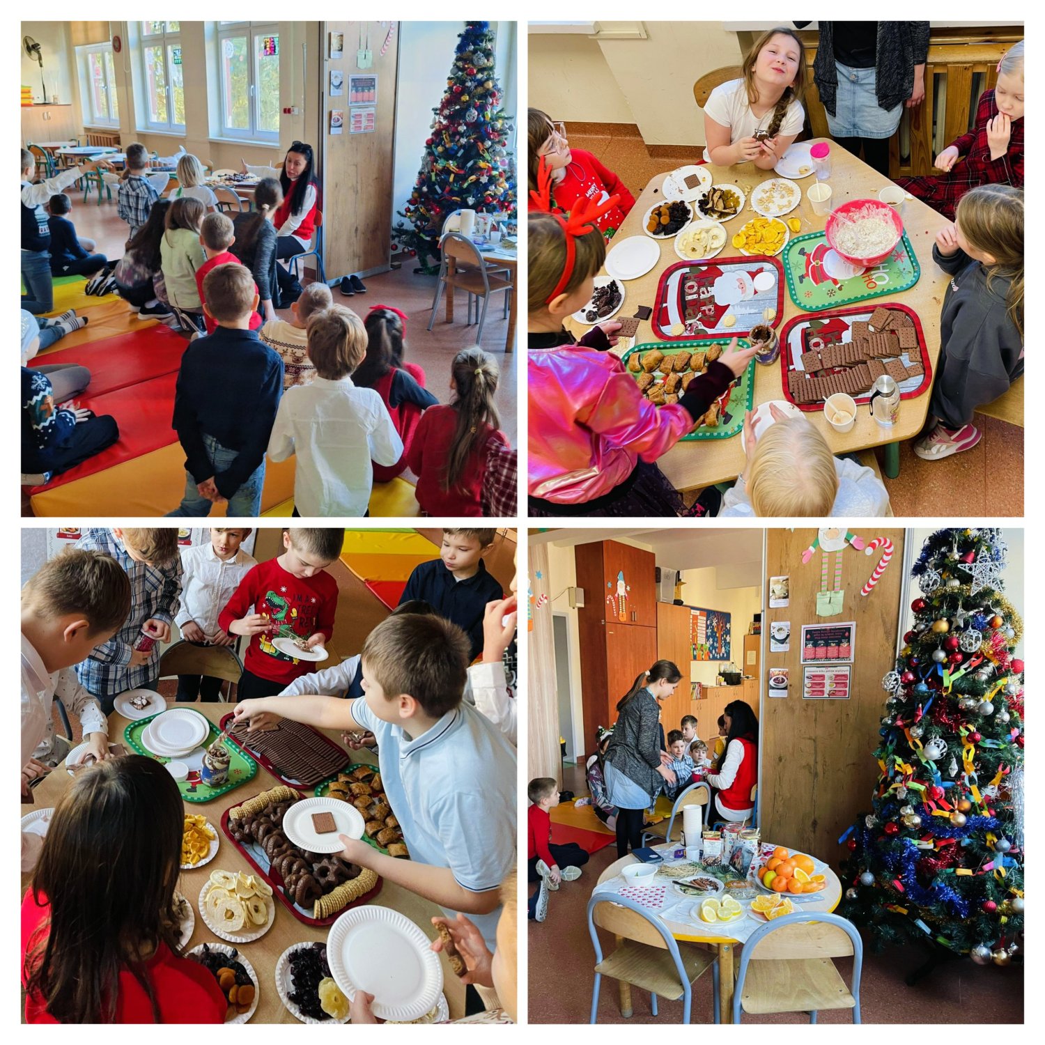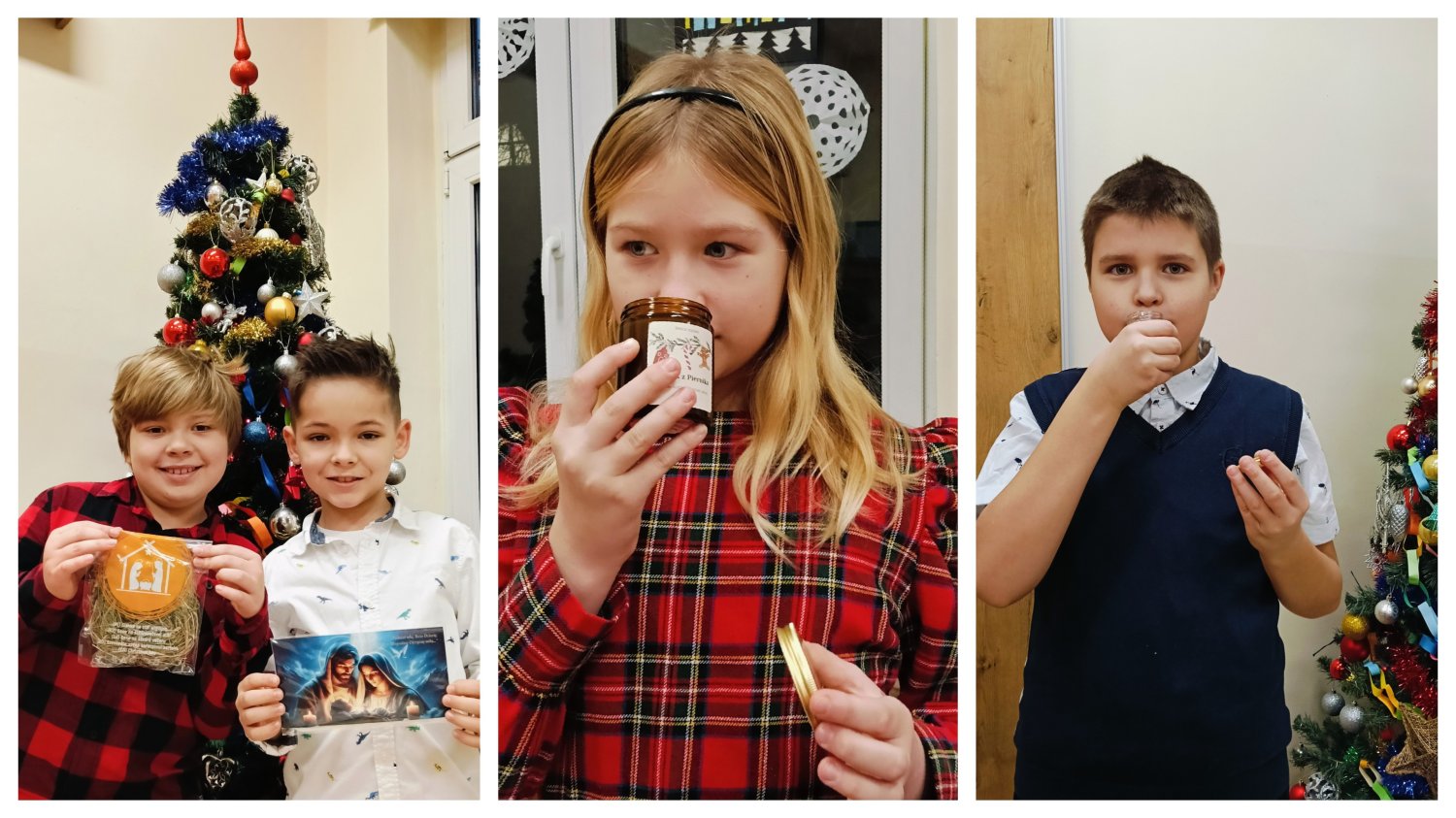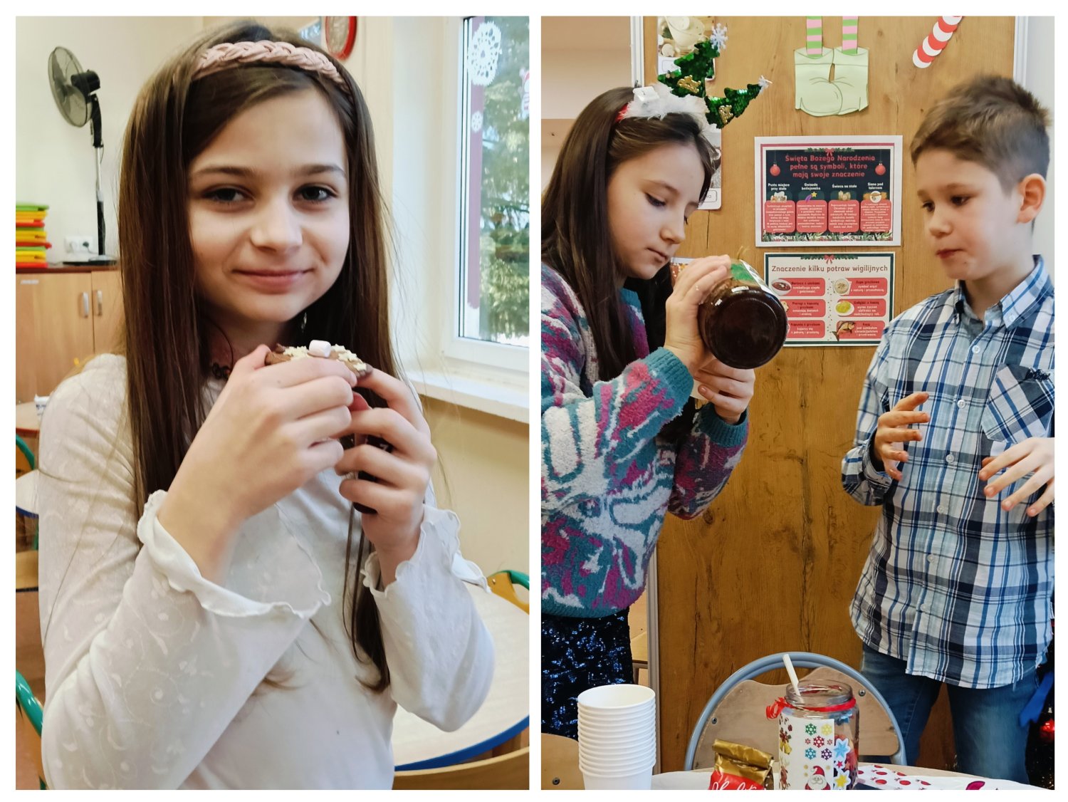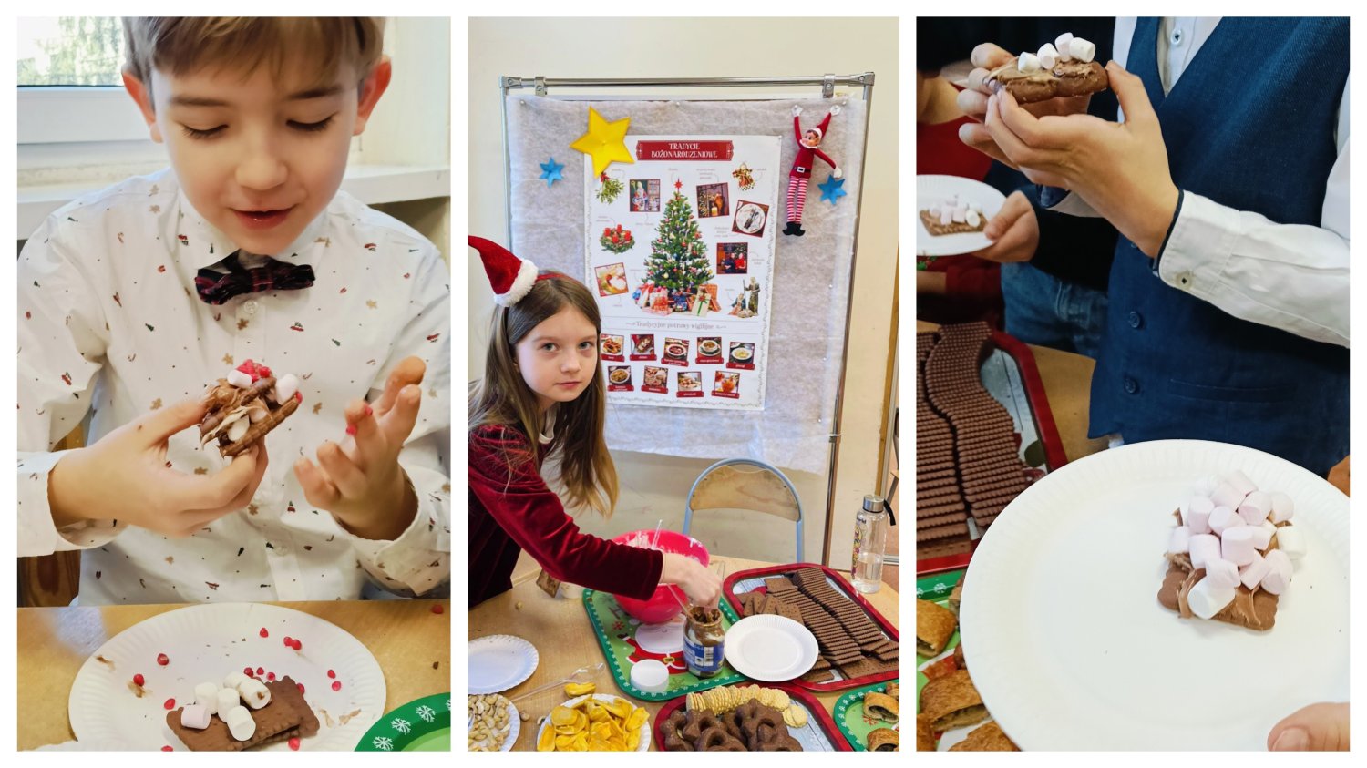 Kiedy magia świąt zapukała do drzwi świetlicy, a migoczące lampki, kolorowe bombki i zapach igliwia sprawiły, że uśmiechy same pojawiały się na twarzach... Padło ważne pytanie: „Czym pachną święta w Twoim domu?”. Świetliczaki radośnie wymieniały zapach pierniczków, pierogów, pomarańczy, ciast, barszczu z uszkami. Najwięcej emocji przyniosły jednak warsztaty kulinarno-sensoryczne. Dzieci miały możliwość poznać jak wyglądają, smakują i pachną składniki świątecznych herbat, potraw oraz ciast. Młodzi kucharze z ogromnym zapałem zabrali się do pracy – było mieszanie, dekorowanie i oczywiście… podjadanie! Uczniowie przygotowali dietetyczną kutię, rozgrzewające herbaty i kakao z piankami. Cudowny zapach świątecznych wypieków unosił się po sali, a każdy chciał pochwalić się swoim kulinarnym specjałem. Świetliczaki mogły również przygotować prezenty dla swoich bliskich - papierowe cukierki wypełnione słodyczami, orzechami, ciasteczkami.