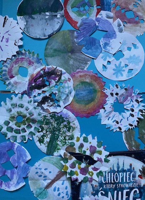 Grudniowe zadanie projektu Kreatywne Prace Plastyczne już za nami. W bajkowy, świąteczny nastrój wprowadziła nas książka „ Chłopiec, który sprowadził śnieg”. Piękna, zimowa historia wzruszyła serca dzieci. Na każdej stronie zatrzymywaliśmy się także nad pięknie wykonanymi ilustracjami. Po takiej inspiracji dzieci wykonały swoje własne malowane i wycinane śnieżynki.