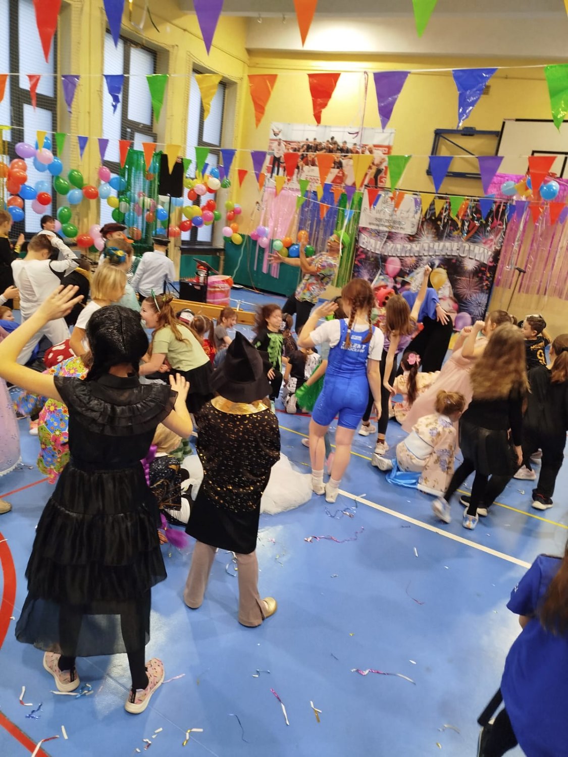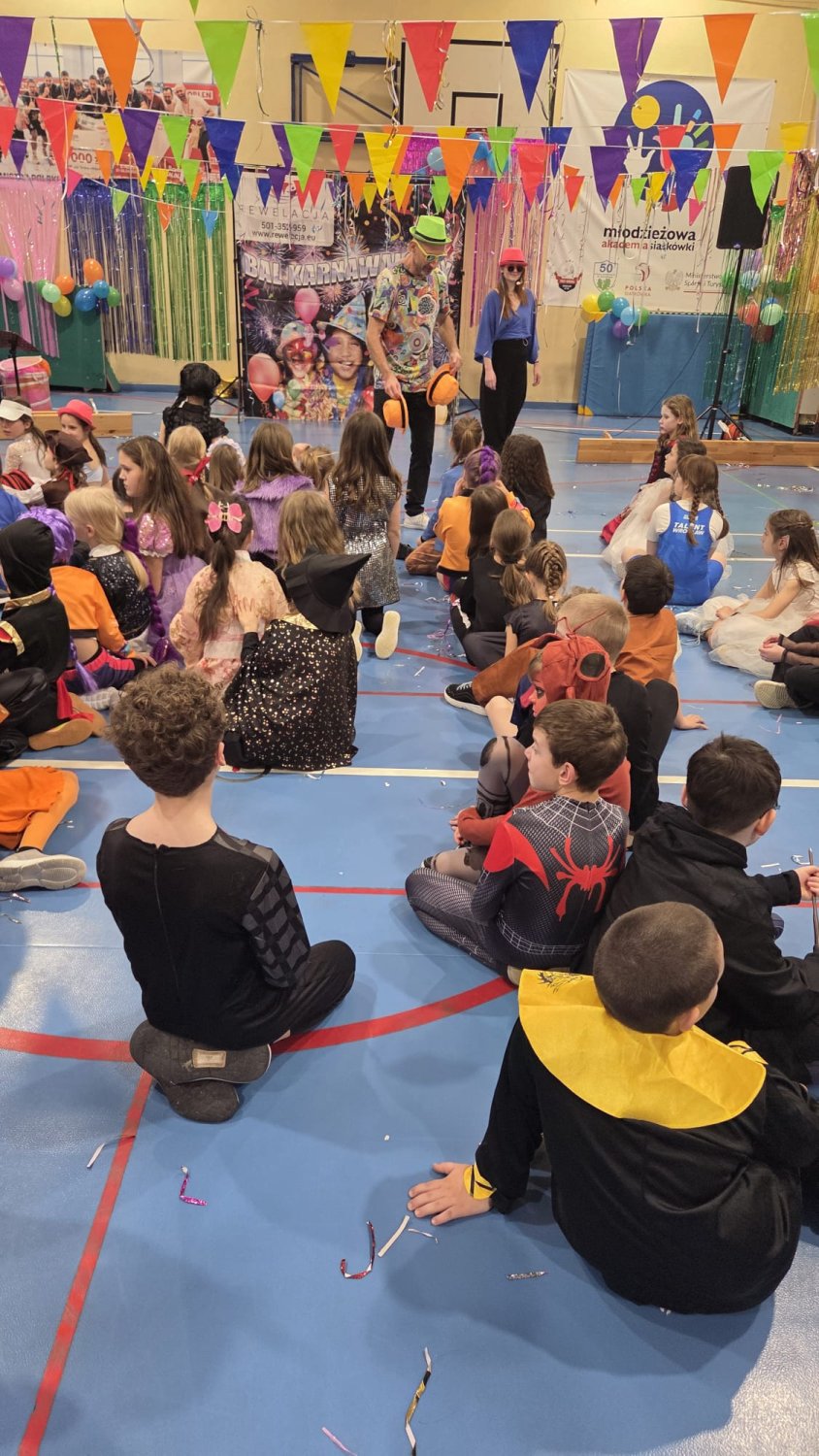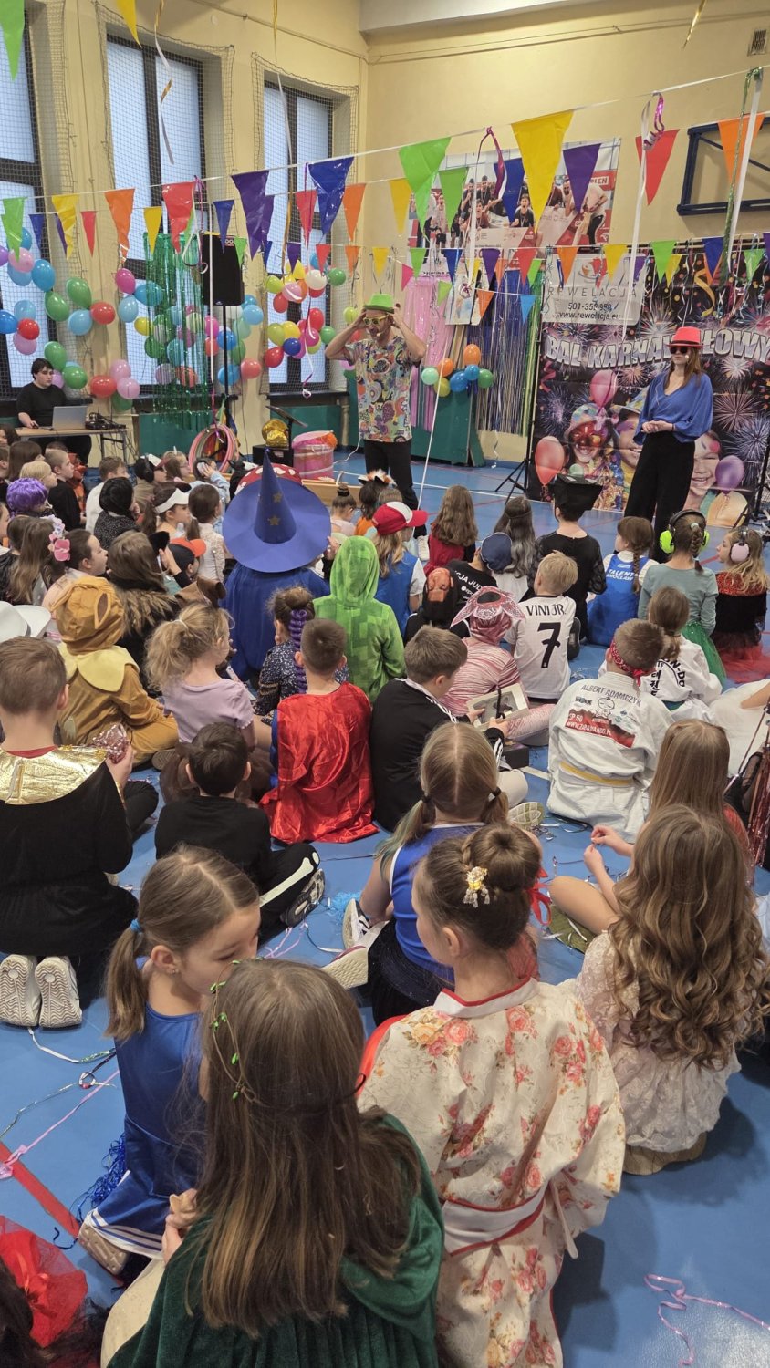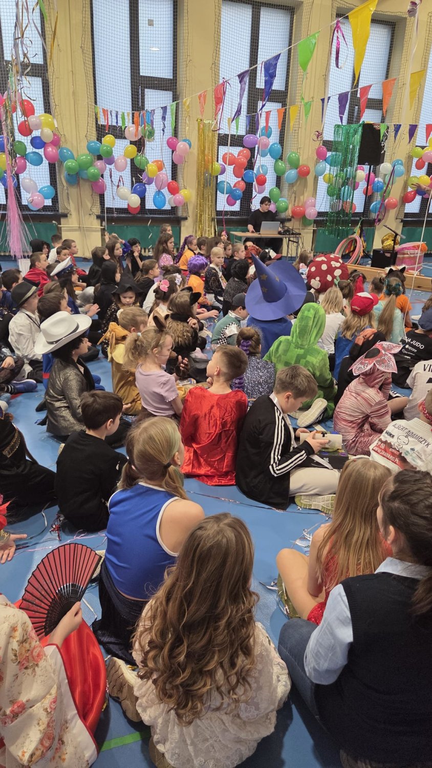 Dzisiaj w naszej szkole odbył się Bal Karnawałowy dla uczniów klas I–III. Było mnóstwo radości, tańca i wspaniałej zabawy, a dzieci zachwyciły pomysłowymi i kolorowymi przebraniami.