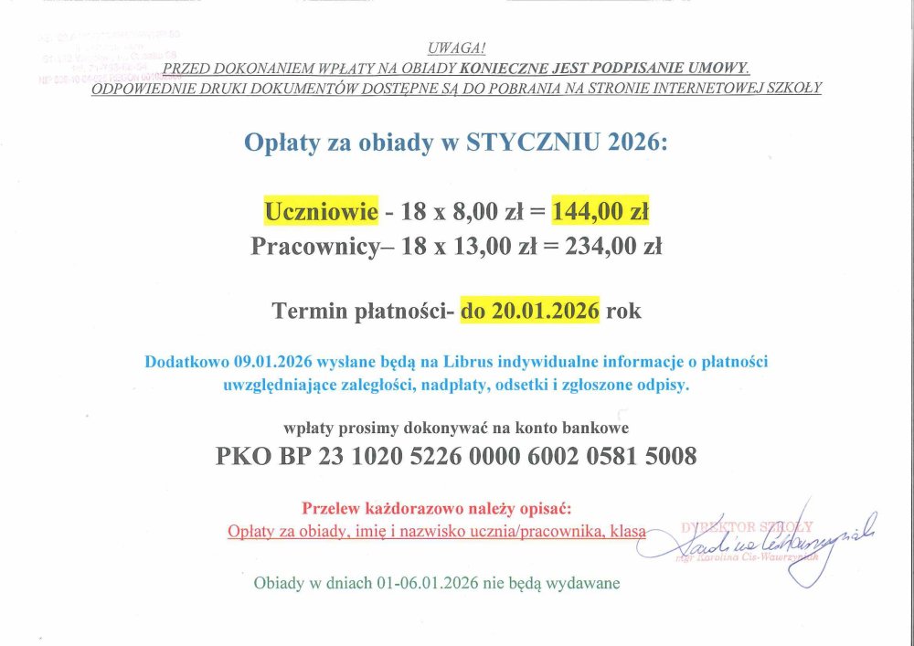 Na stronie internetowej Szkoły i przy głównych wejściach do budynku A i B co miesiąc będzie się pojawiać informacja dotycząca ilości dni obiadowych w danym miesiącu i dokładnej kwoty, którą trzeba będzie przelać na konto bankowe Szkoły.