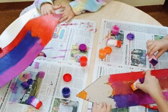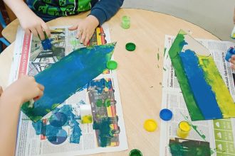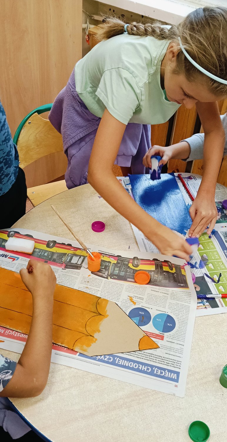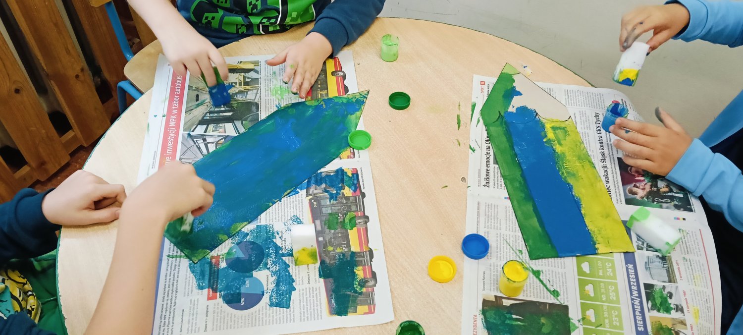 Z radością pracowaliśmy w parach i grupach. W ruch poszły kredki ołówkowe i świecowe, farby, pędzle i gąbeczki, a nawet palce :)