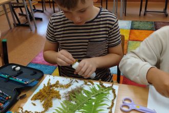 Nasi mali artyści z pomocą paproci, kwiatów hortensji, jarzębiny, traw, gałązek wrzosów, skomponowali przepiękne jesienne pejzaże.