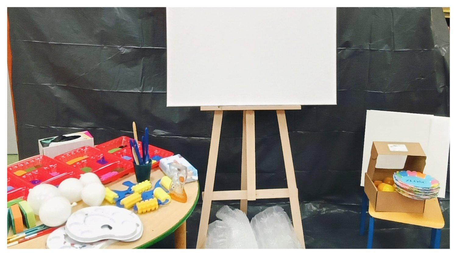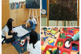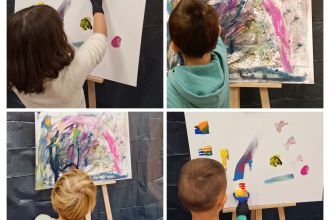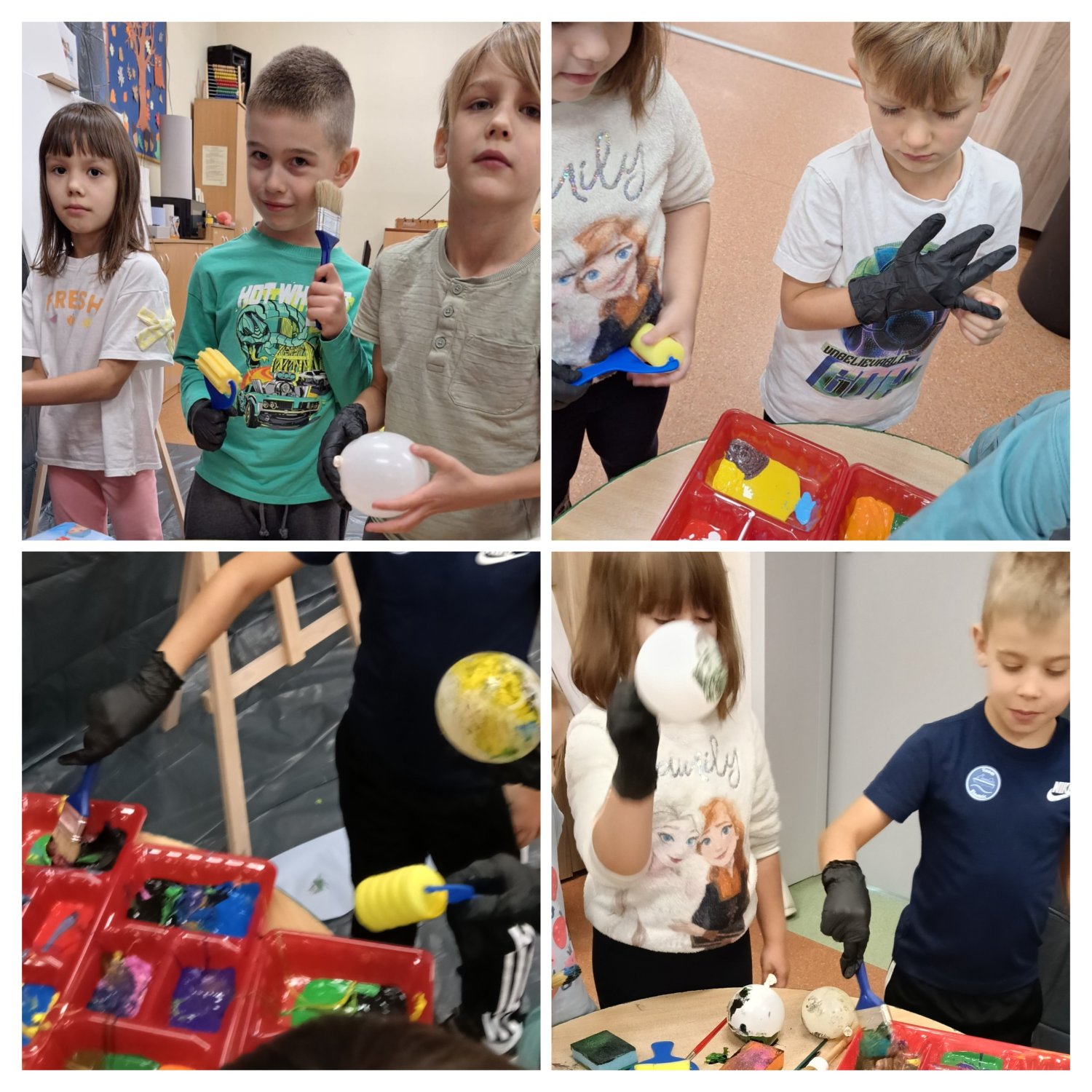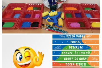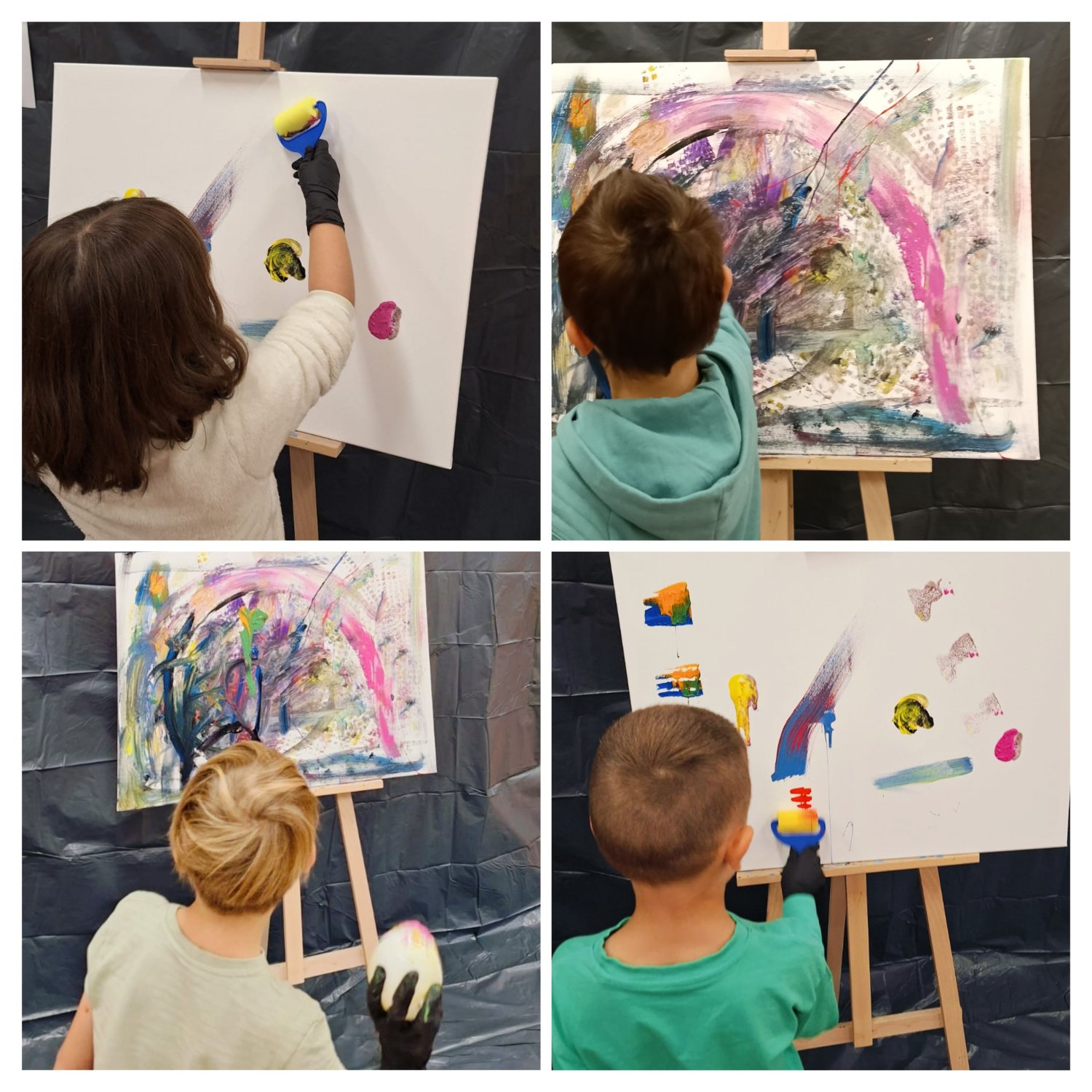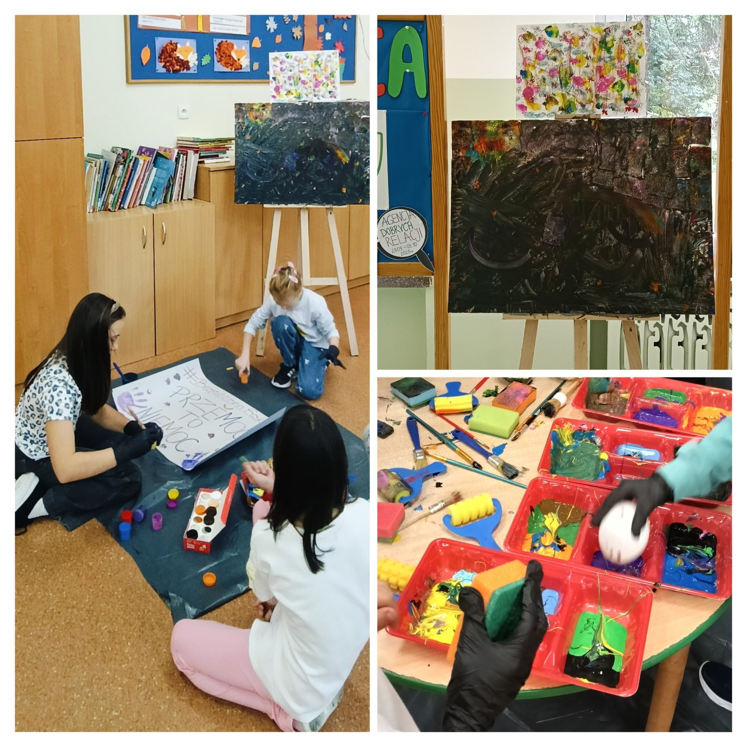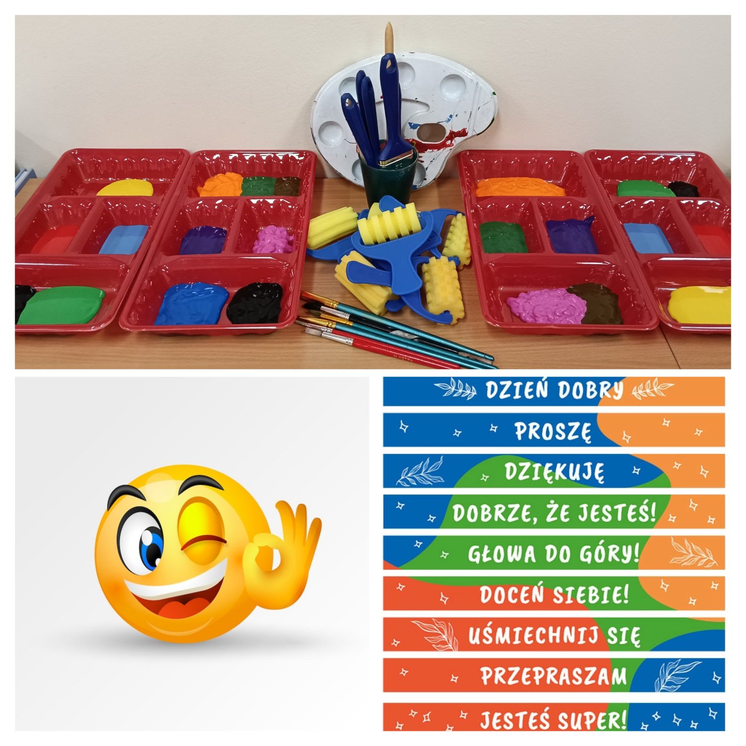 Na koniec zajęć, daliśmy plastyczny upust swoim emocjom. Zapanowała dziecięca wizja artystycznych uczuć. Pędzle, wałeczki, gąbeczki ruszyły do akcji :) A nawet rzuty balonami z farbą! Ćwicząc przy tym uprzejmość w codziennej komunikacji i trosce o kulturę słowa.