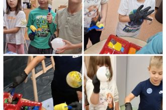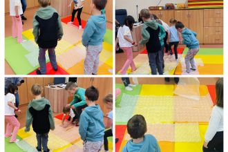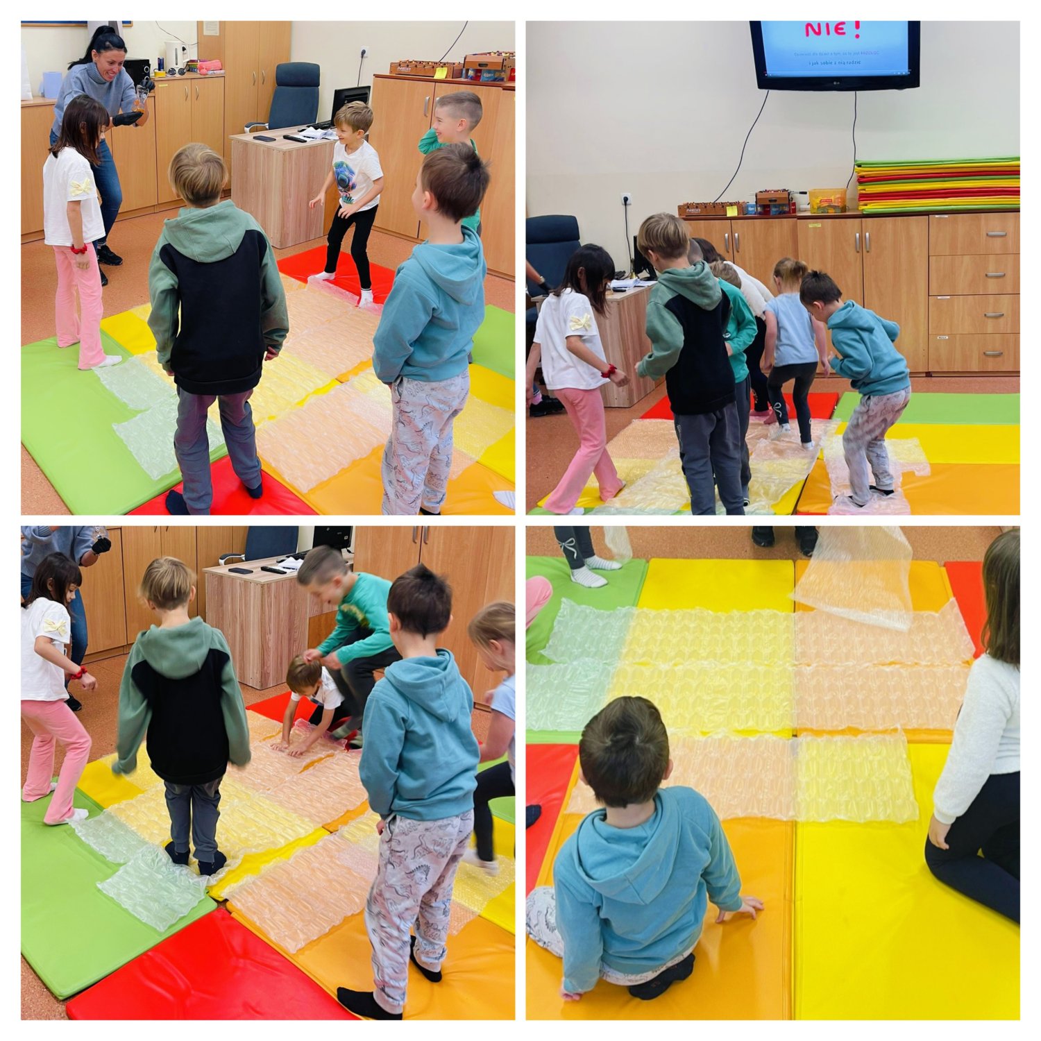 W trakcie dyskusji z TALERZAMI EMOCJI i PUDEŁKIEM UCZUĆ uczniowie dzielili się swoimi doświadczeniami, mówili o sytuacjach, w których czuli się źle albo byli świadkami niewłaściwego zachowania innych. Postanowiliśmy nauczyć się głośno i stanowczo mówić NIE – wydeptując i wyciskając dywany z folii bąbelkowej.