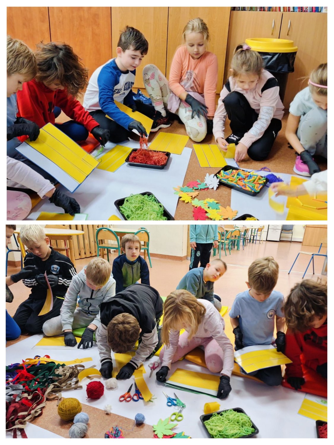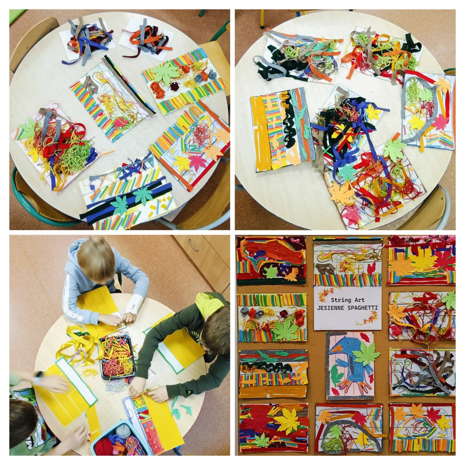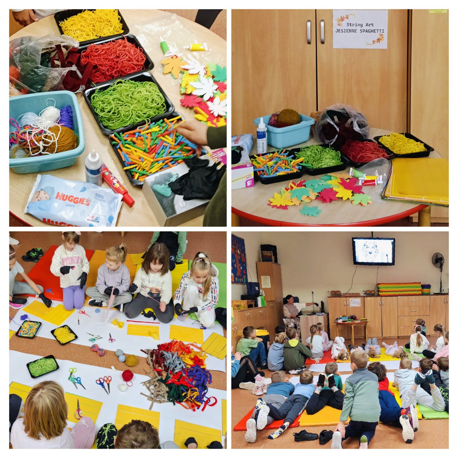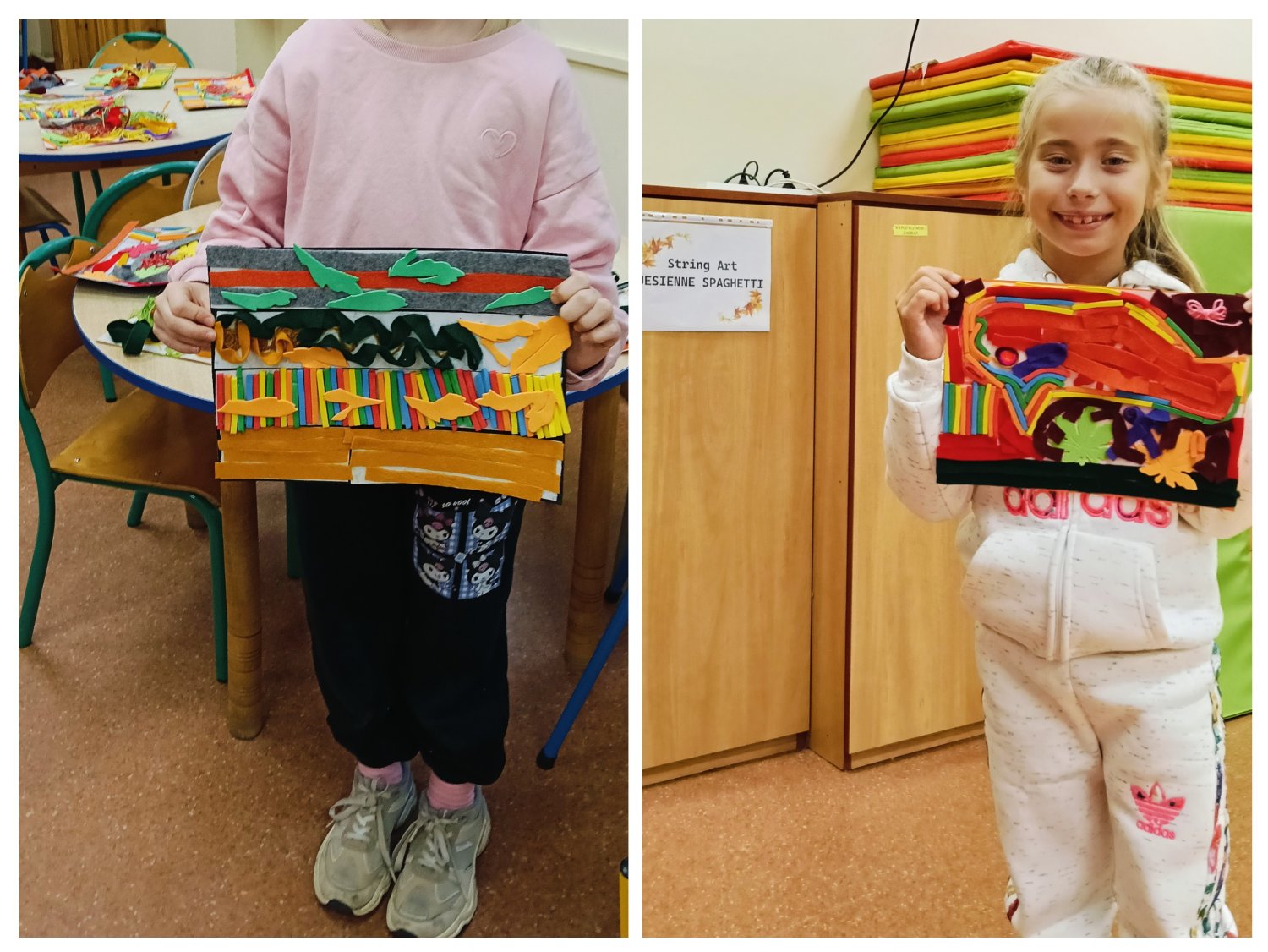Świetlicę opanowały kolorowe makarony spaghetti, filcowe wstążki, wełny, nicie, sznurki i muliny. Świetliczaki samodzielnie projektowały obrazy z JESIENNYM SPAGHETTI. Na zajęciach uczniowie współpracowali, dzielili się wiedzą i artykułami dekoracyjnymi oraz doskonalili swoją precyzję i cierpliwość.