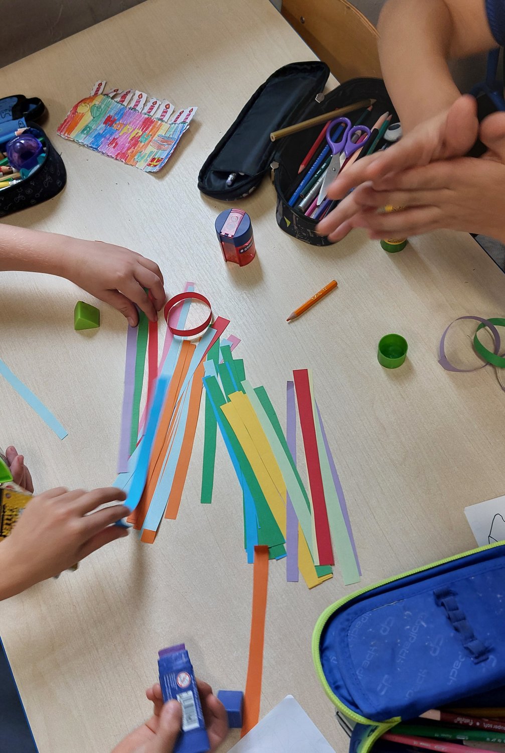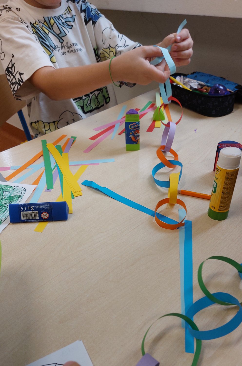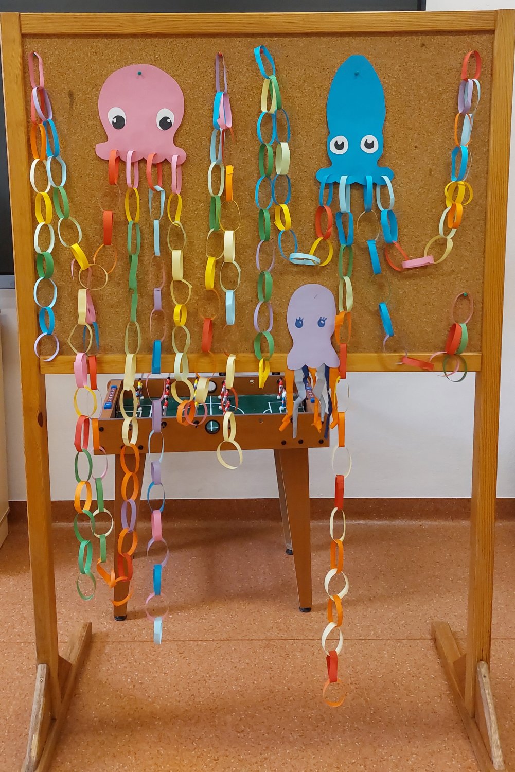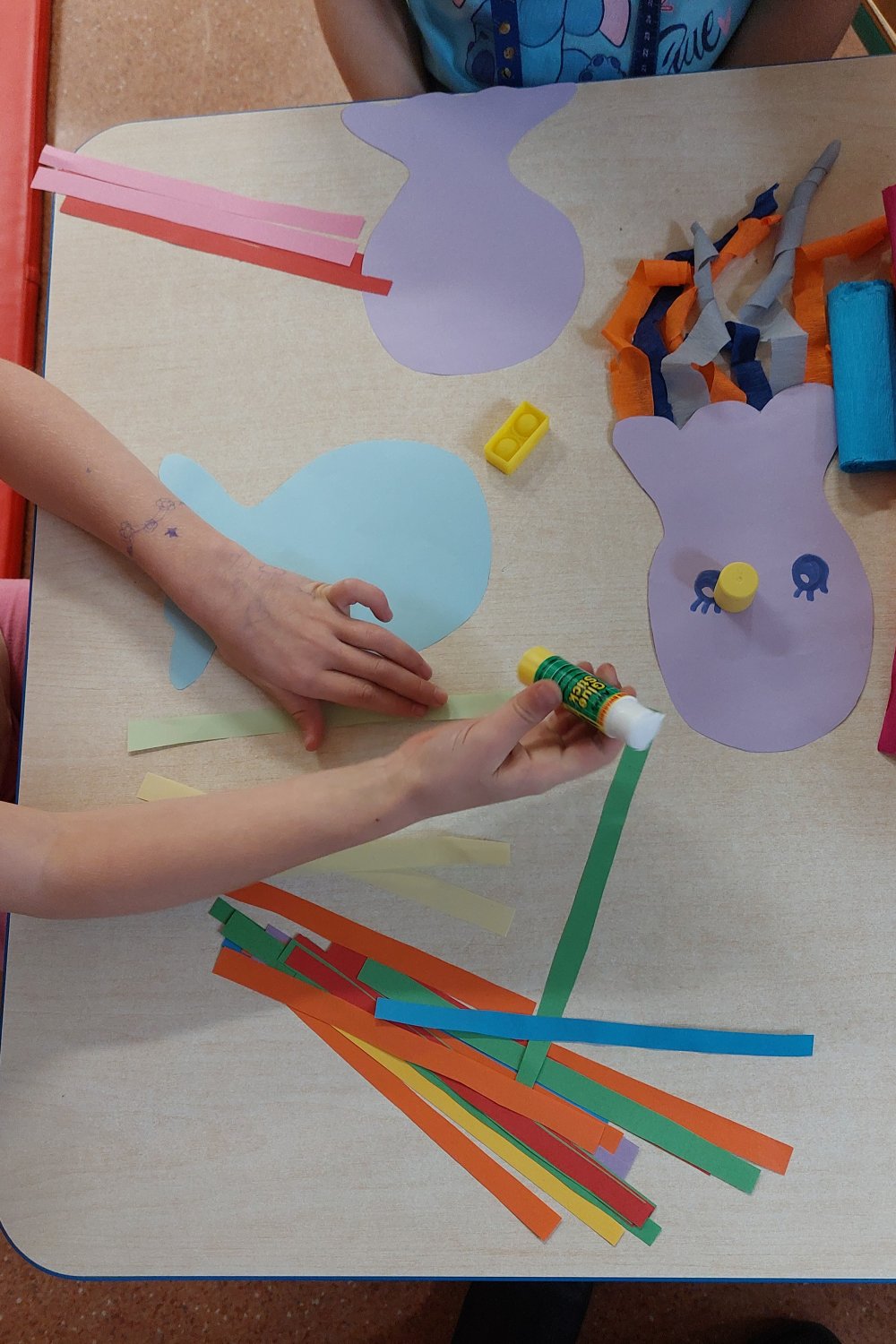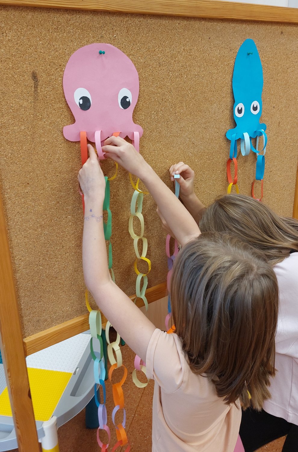 Podczas zajęć dzieci miały również okazję zobaczyć prawdziwą kość mątwy, jednego z krewnych ośmiornicy, co wzbudziło ogromne zainteresowanie i ciekawość. Zwieńczeniem spotkania była twórcza część plastyczna – wspólnie wykonaliśmy kolorowe ośmiornice z łańcuchowymi mackami, które ozdobiły naszą salę.