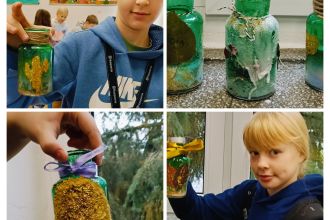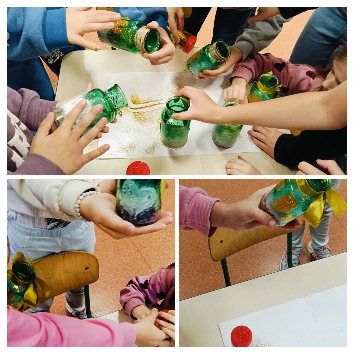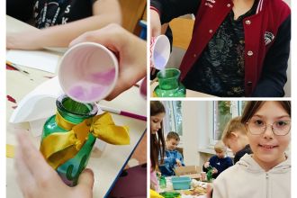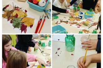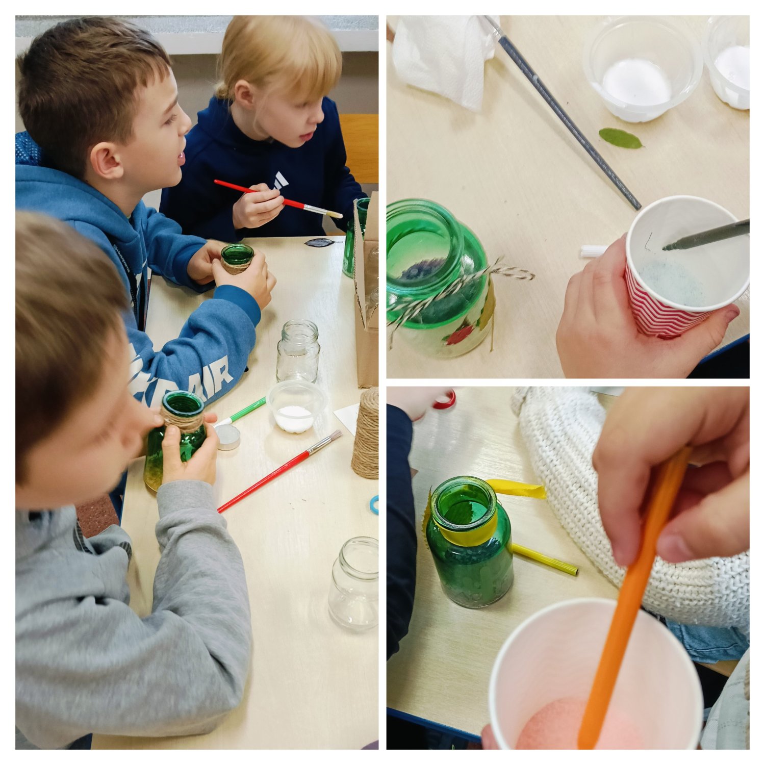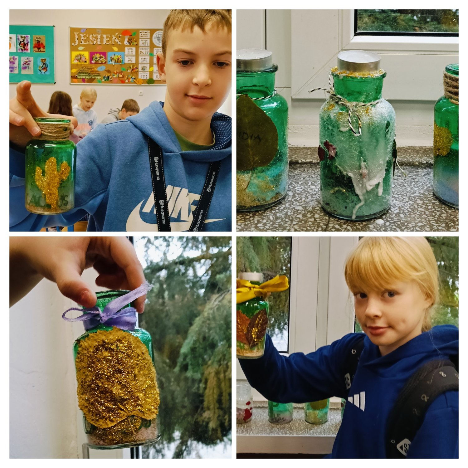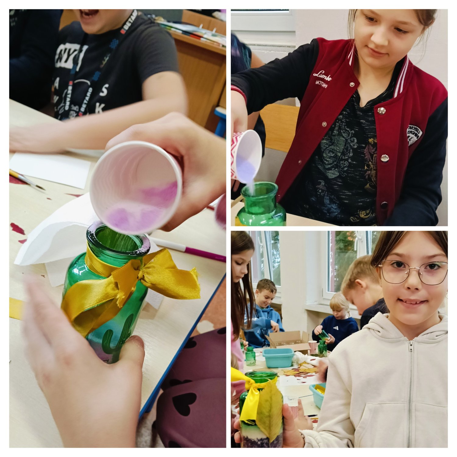 Sala wypełniła się szelestem liści, dźwiękiem szkła i nutką brokatu. Każdy uczeń miał okazję puścić wodze fantazji i stworzyć „coś” pięknego - od rustykalnych świeczników z wstążką z koronki i sznurkiem jutowym po kolorowe dekoracje z solą spożywczą farbowaną przez dzieci oraz solami do kąpieli o zapachu wrzosu i bursztynu.