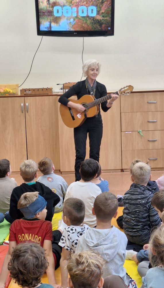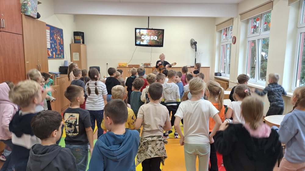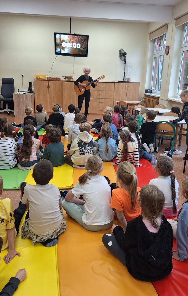 W świetlicy odbyły się zajęcia muzyczne z gitarą, podczas których uczestnicy śpiewali różnorodne piosenki oraz aktywnie ruszali się przy akompaniamencie instrumentu. Panowała radosna atmosfera pełna śmiechu, dźwięków i twórczej energii. Dzieci mogły nie tylko posłuchać muzyki, lecz również stać się jej częścią poprzez wspólne wykonywanie utworów.