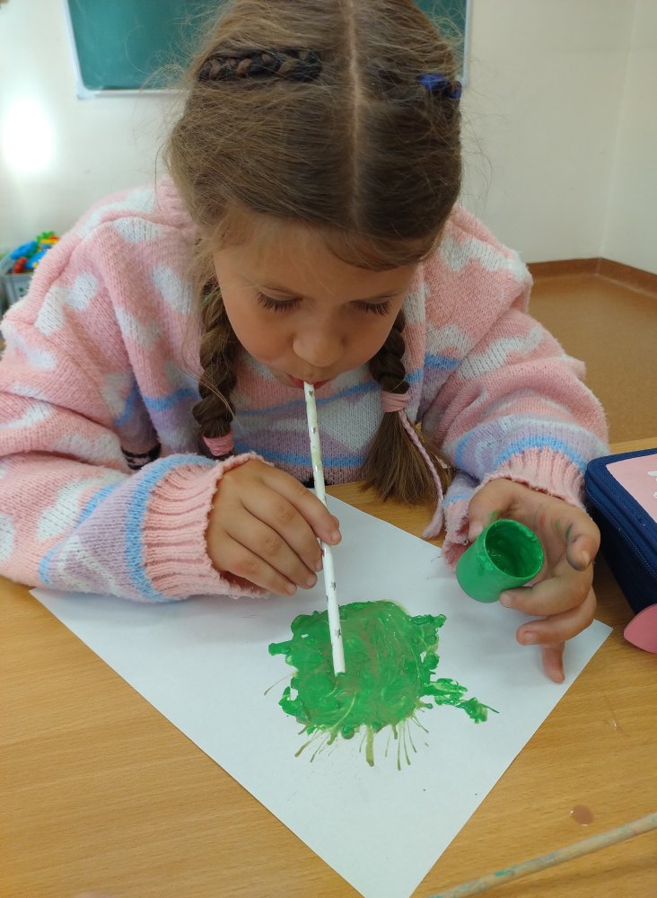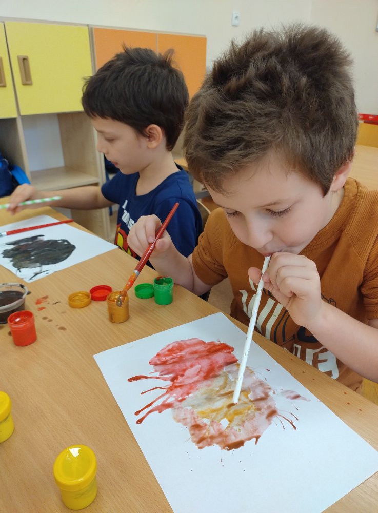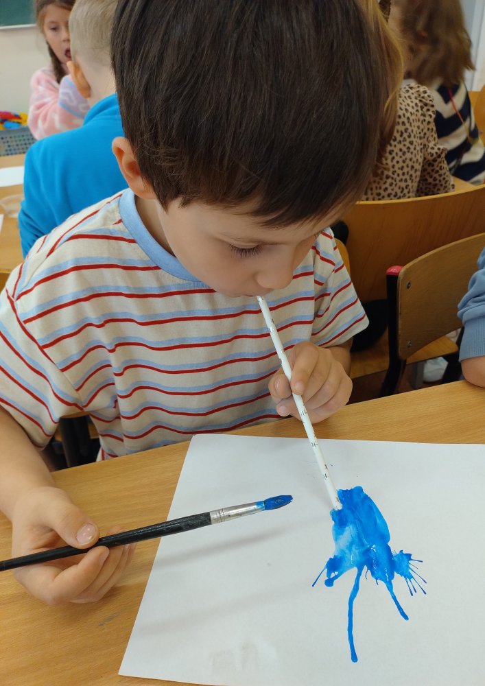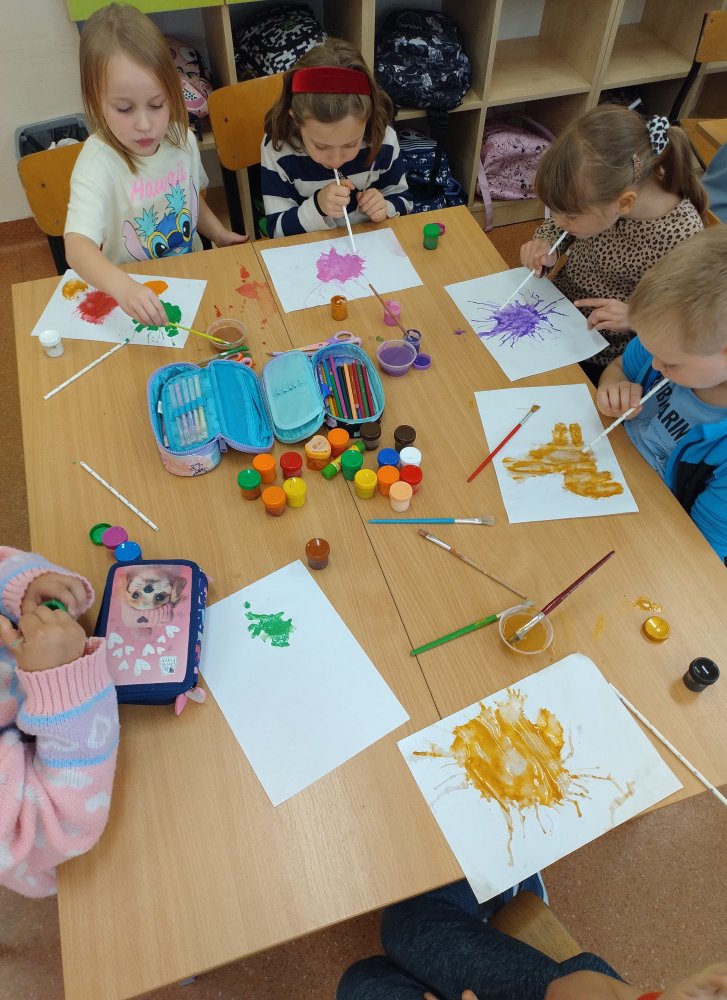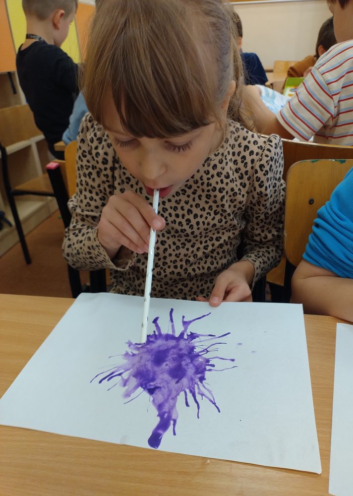 Zamiast tradycyjnego użycia pędzla, dzieci tworzyły barwne kompozycje, dmuchając w słomkę i rozprowadzając krople farby po kartce. Dzięki temu powstały niepowtarzalne, abstrakcyjne obrazki, przypominające fantazyjne stworki.