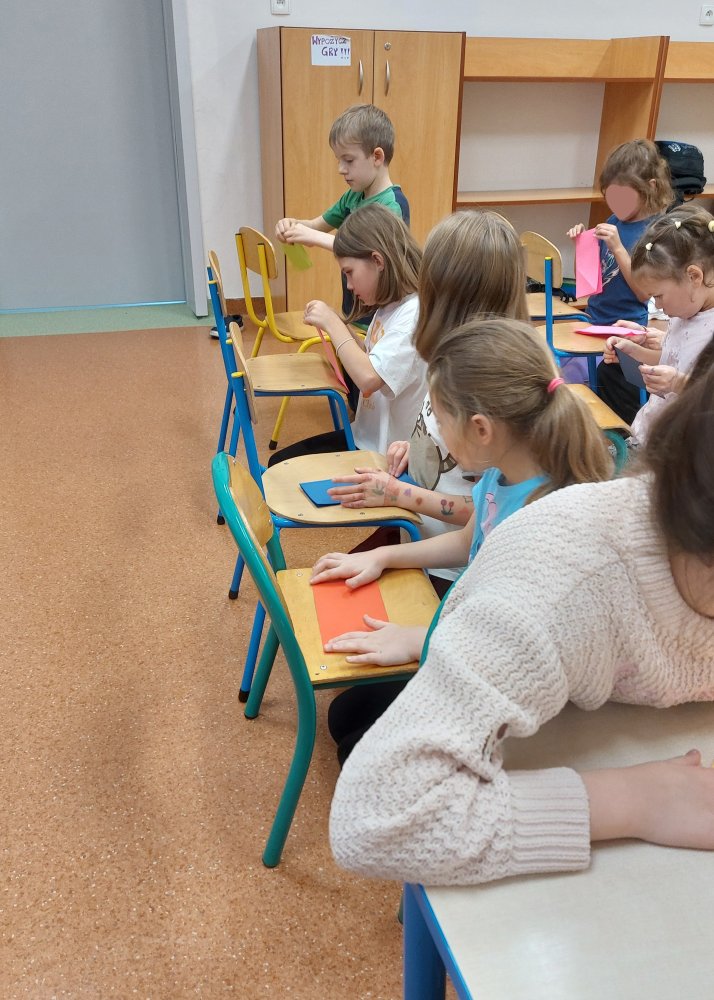Podczas zajęć na świetlicy uczniowie poznali sztukę origami, czyli japońską technikę składania papieru. Z dużym zaangażowaniem i precyzją tworzyli swoje własne skaczące żabki, które po złożeniu naprawdę potrafiły podskakiwać!
