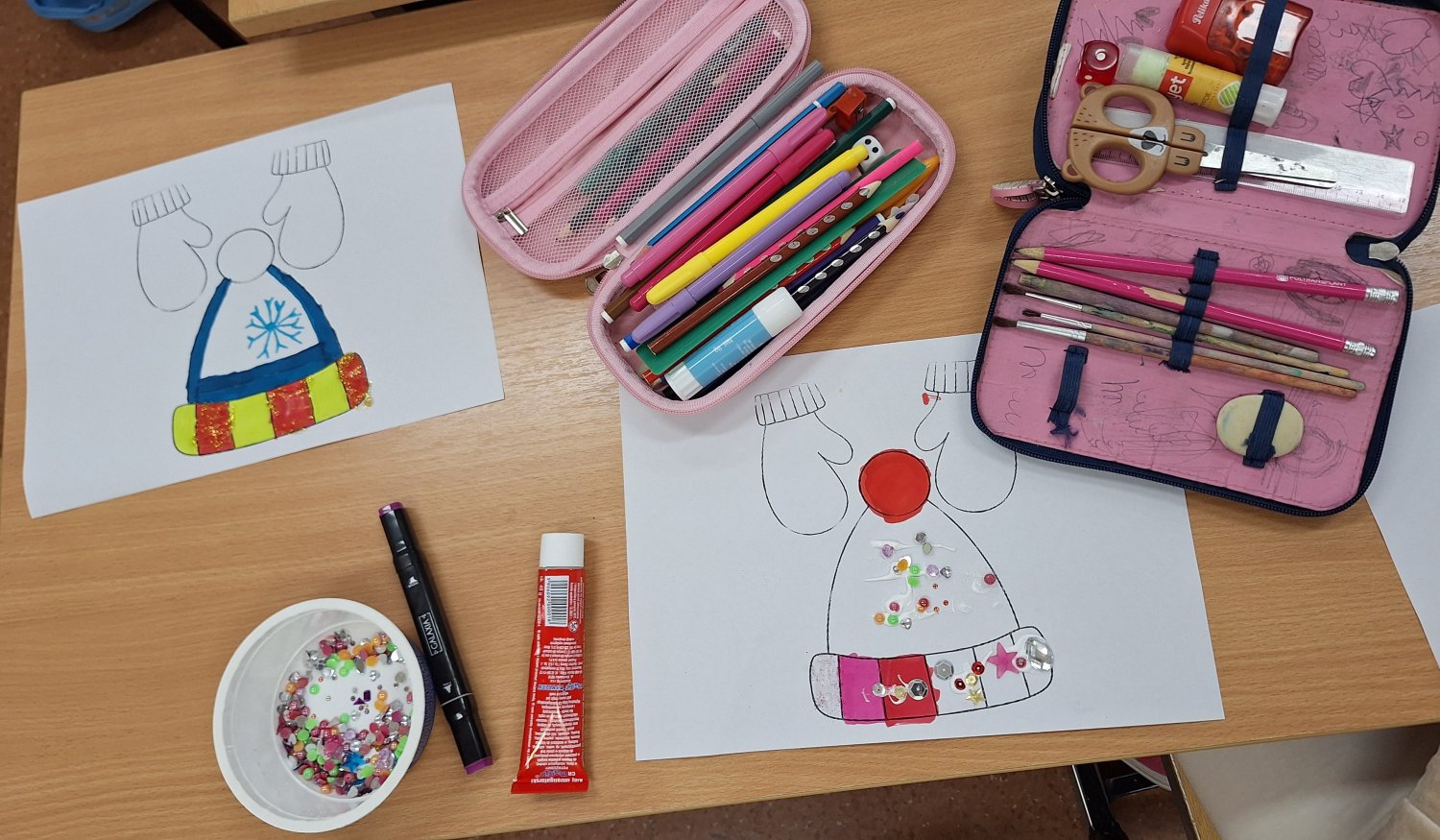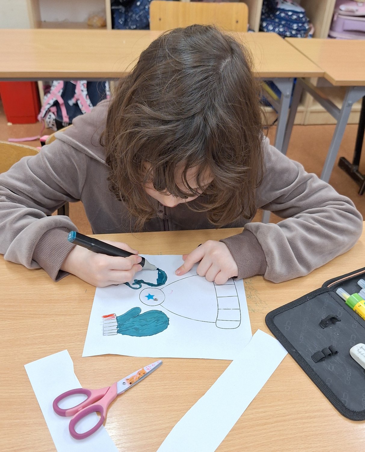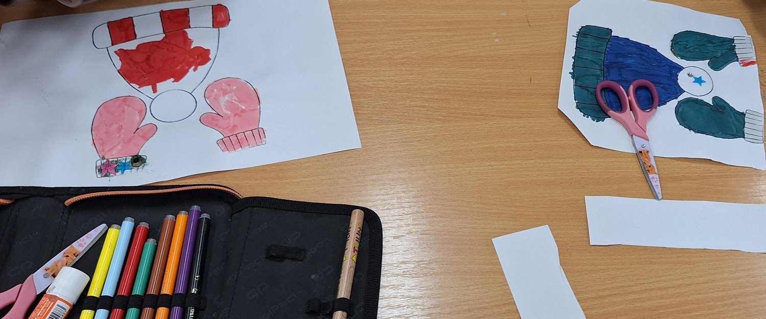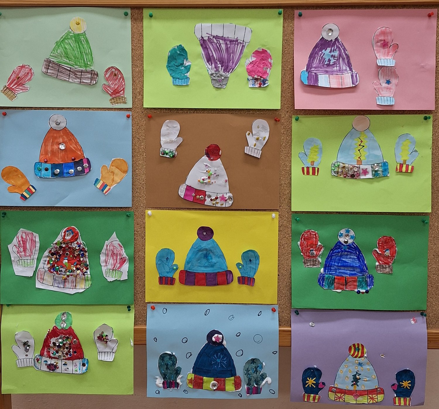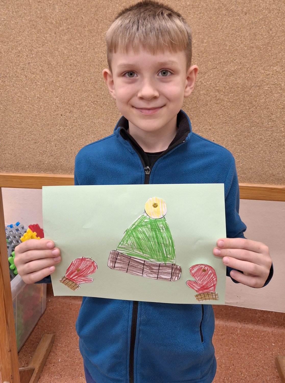 Wykonaliśmy pracę plastyczną – czapkę z rękawiczkami. Każde dziecko dekorowało swój zestaw według własnego pomysłu. Powstały bardzo oryginalne zimowe akcesoria – jedne w pastelowych kolorach, inne w intensywnych barwach, a niektóre ozdobione były wzorami przypominającymi prawdziwe zimowe swetry.