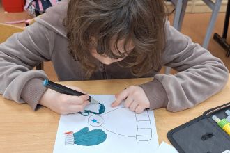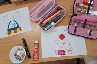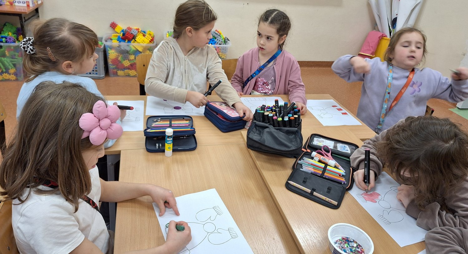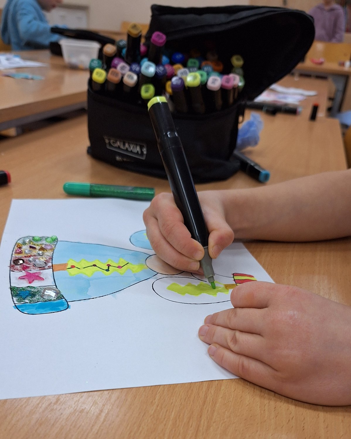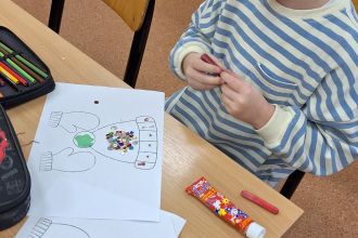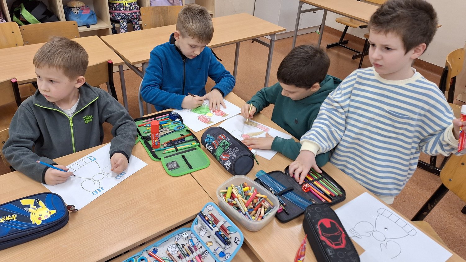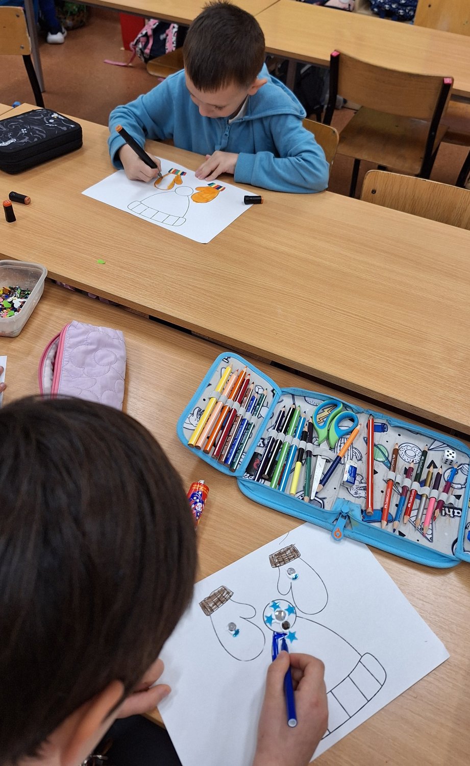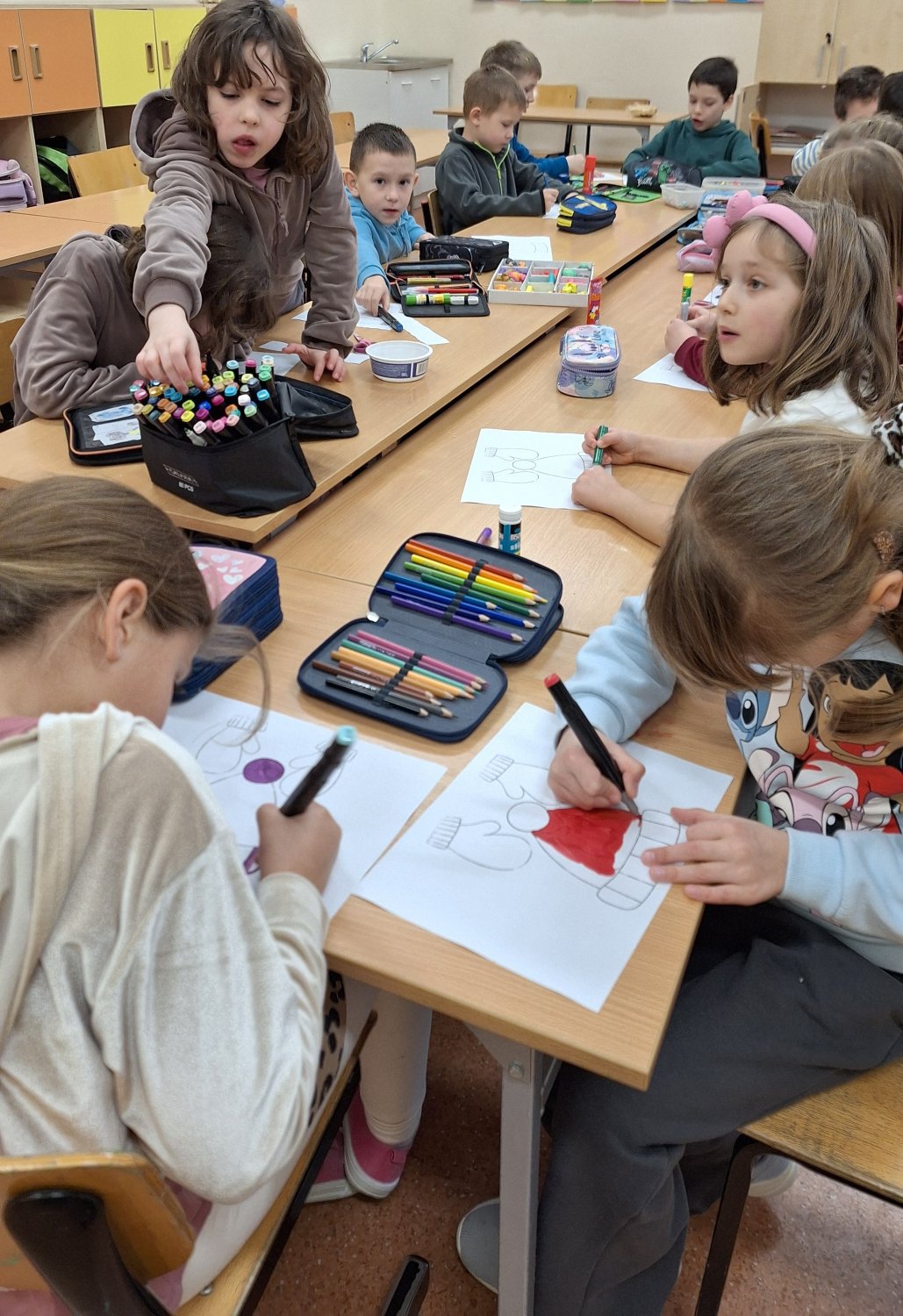 Wykonaliśmy pracę plastyczną – czapkę z rękawiczkami. Każde dziecko dekorowało swój zestaw według własnego pomysłu. Powstały bardzo oryginalne zimowe akcesoria – jedne w pastelowych kolorach, inne w intensywnych barwach, a niektóre ozdobione były wzorami przypominającymi prawdziwe zimowe swetry.
