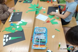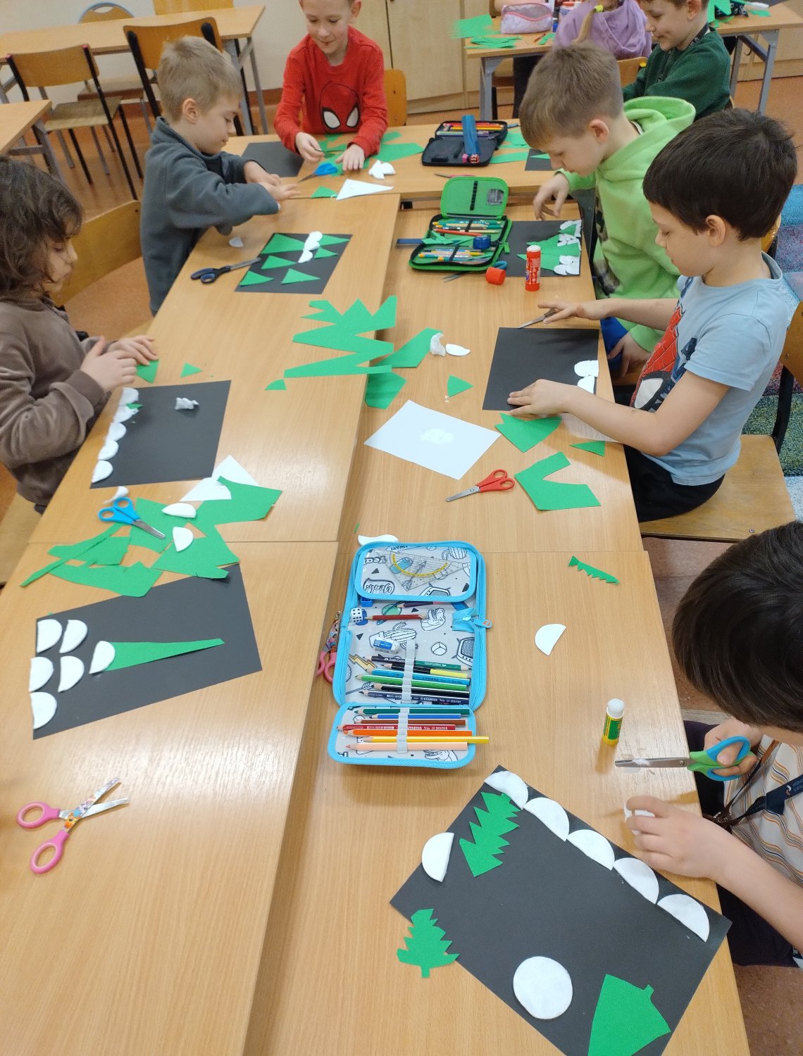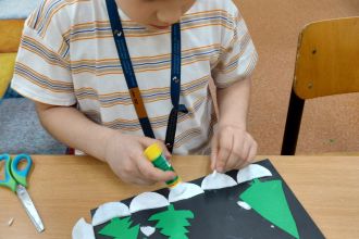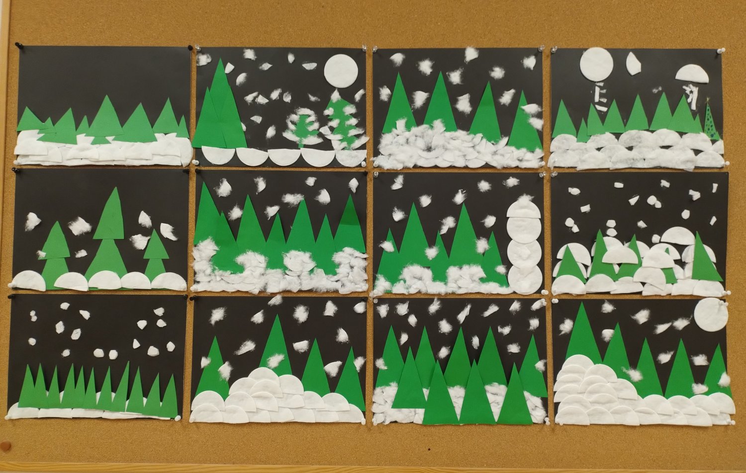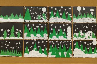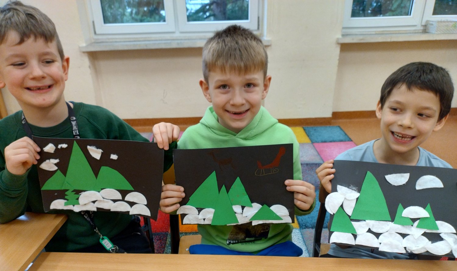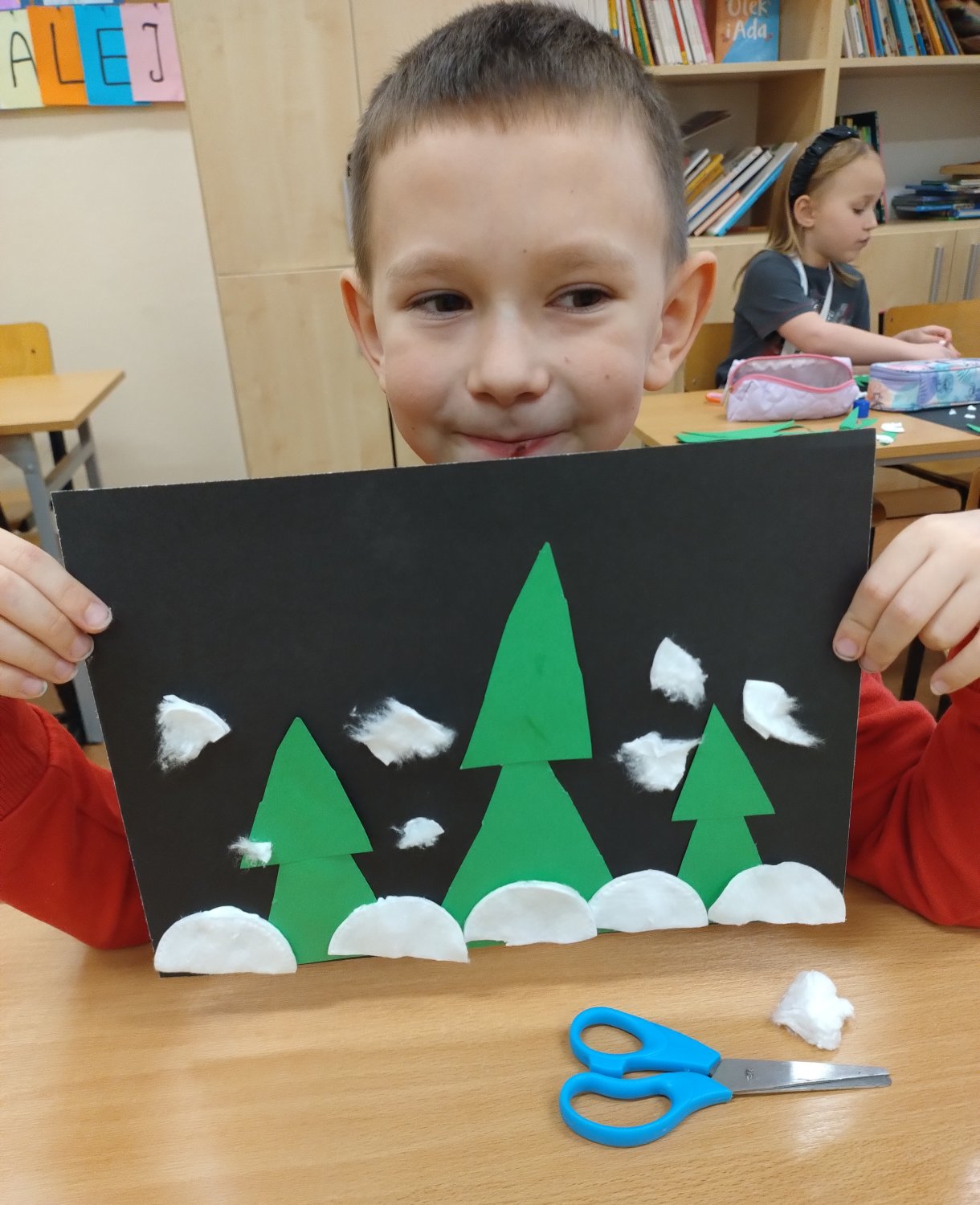 Do stworzenia swoich kompozycji uczniowie wykorzystali zielone choinki, wycięte z papieru oraz waciki imitujące śnieg.