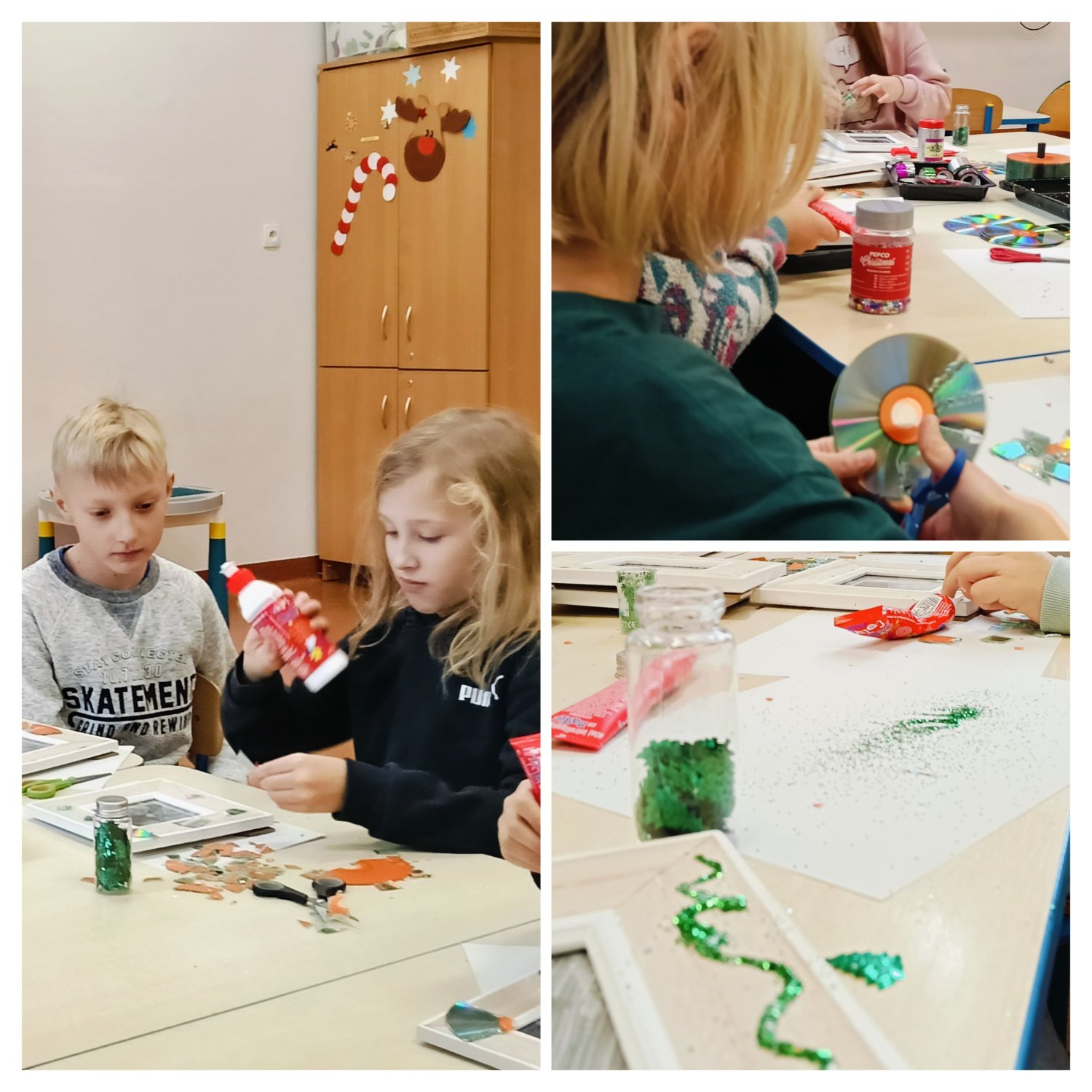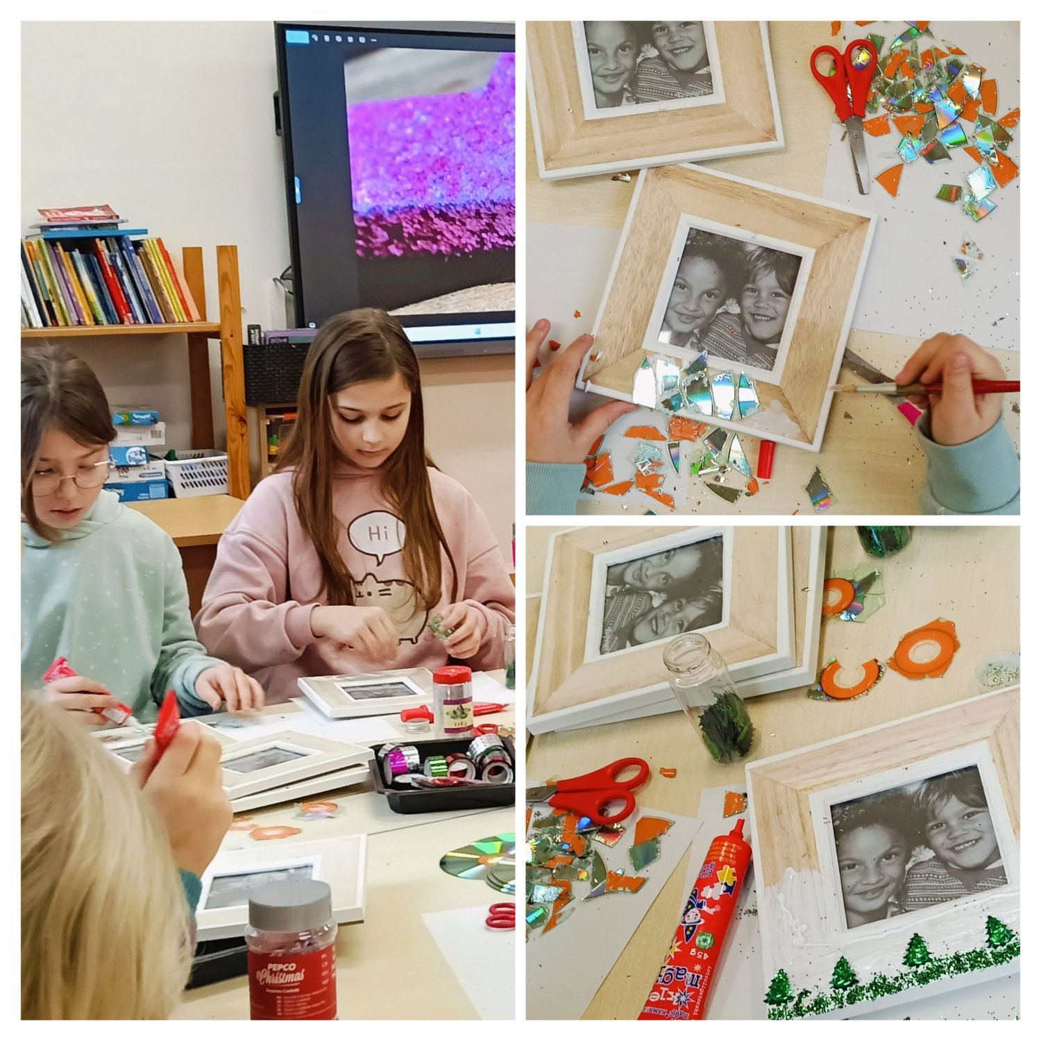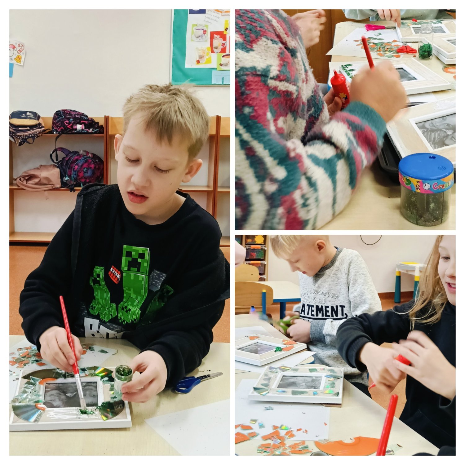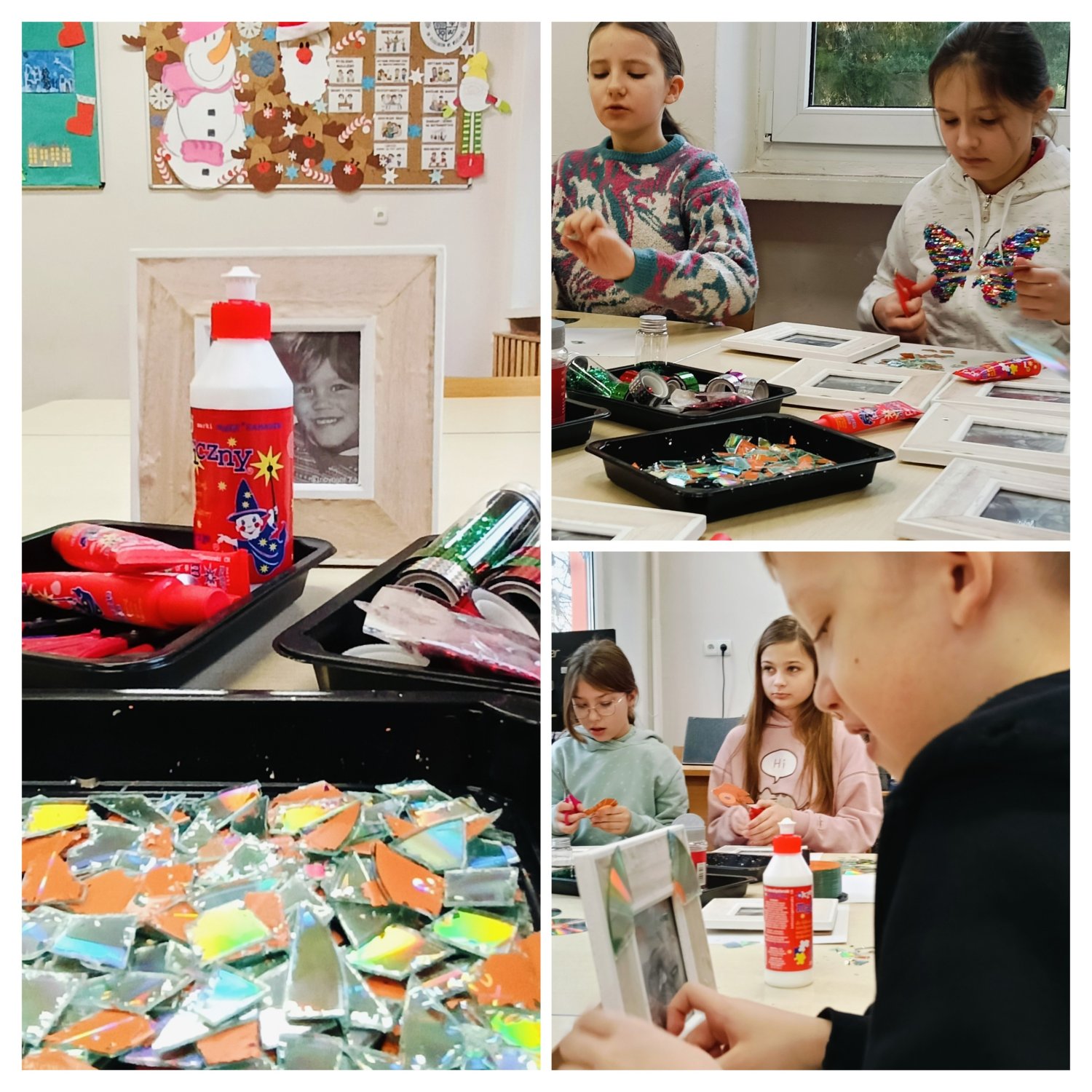 Świetliczaki z zapałem tworzyły swoje prace – jedni precyzyjnie układali kompozycje, inni śmiało sięgali po klej i brokat, zamieniając zwykłe ramki na zdjęcia w designerskie cuda. „Ale to się świeci!”