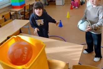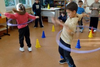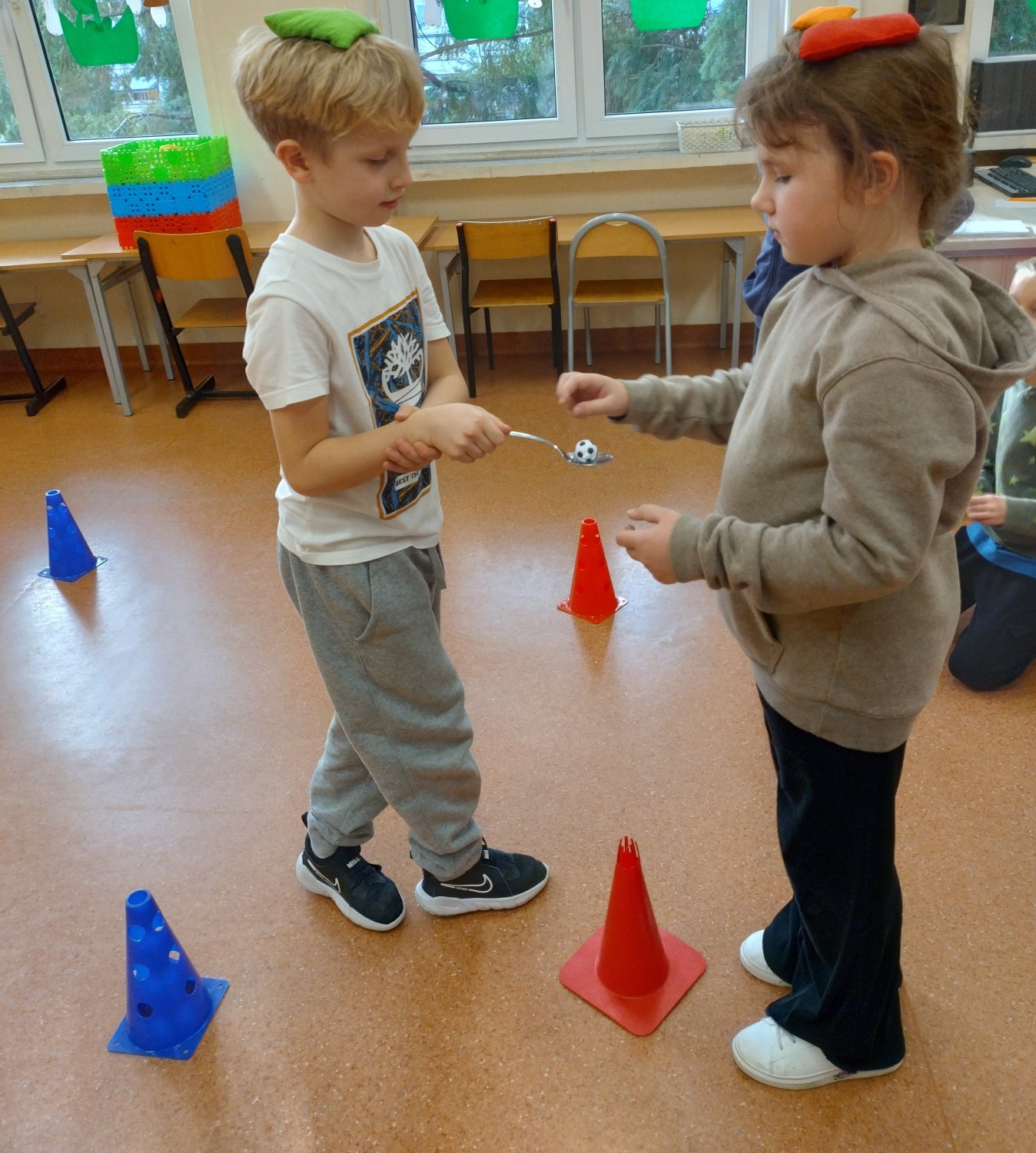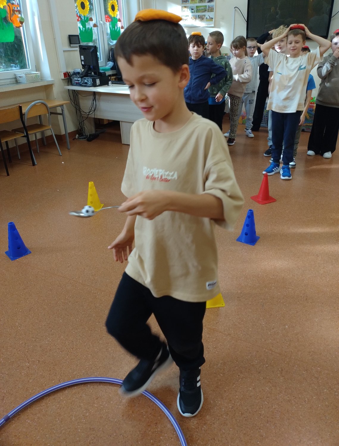 Dzieci pokonywały sztafetę z przeszkodami, rzucały piłkę do celu, ćwiczyły z hula-hop, brały udział w wyścigu z woreczkami na głowie oraz wyścigu z piłeczką na łyżce, skakały na skakance.