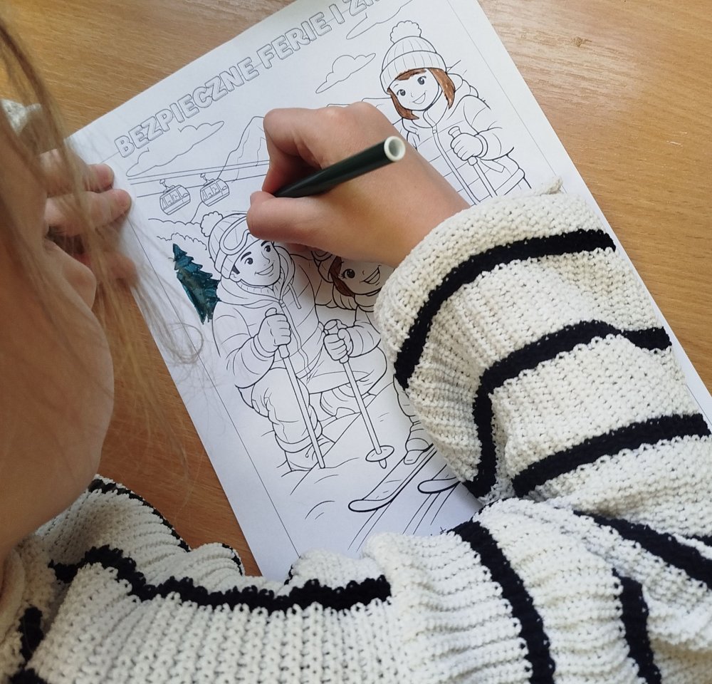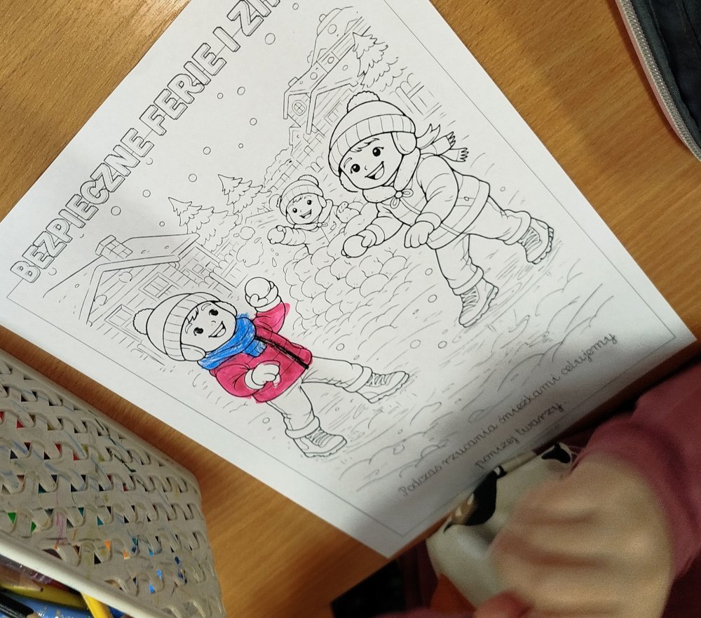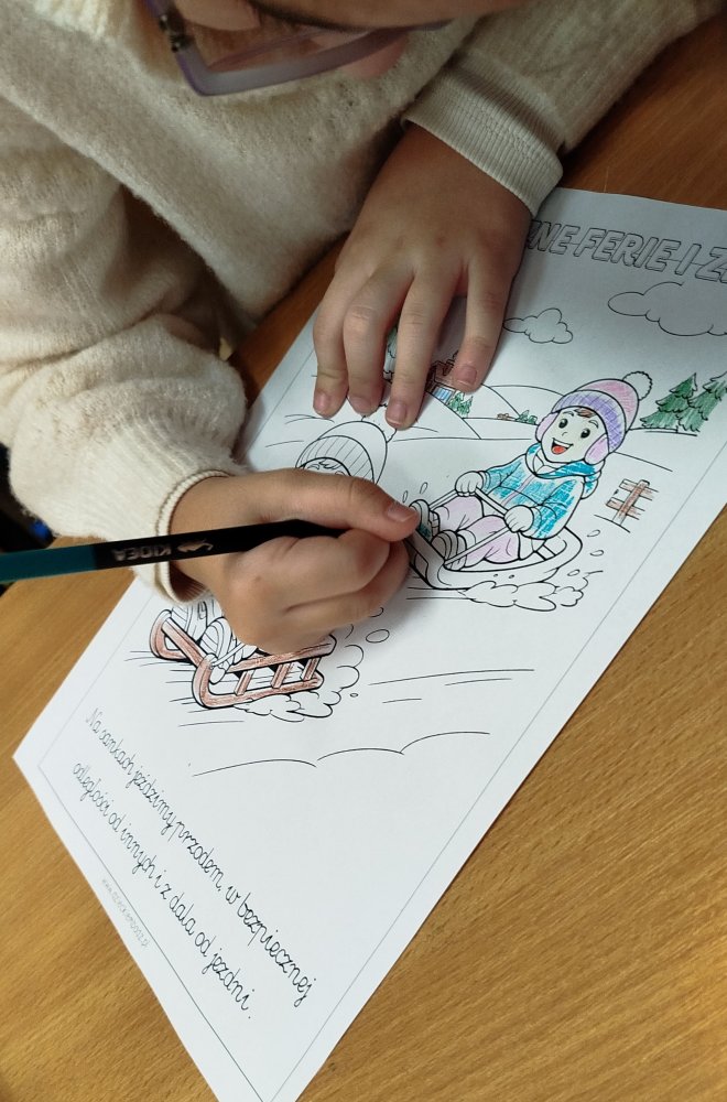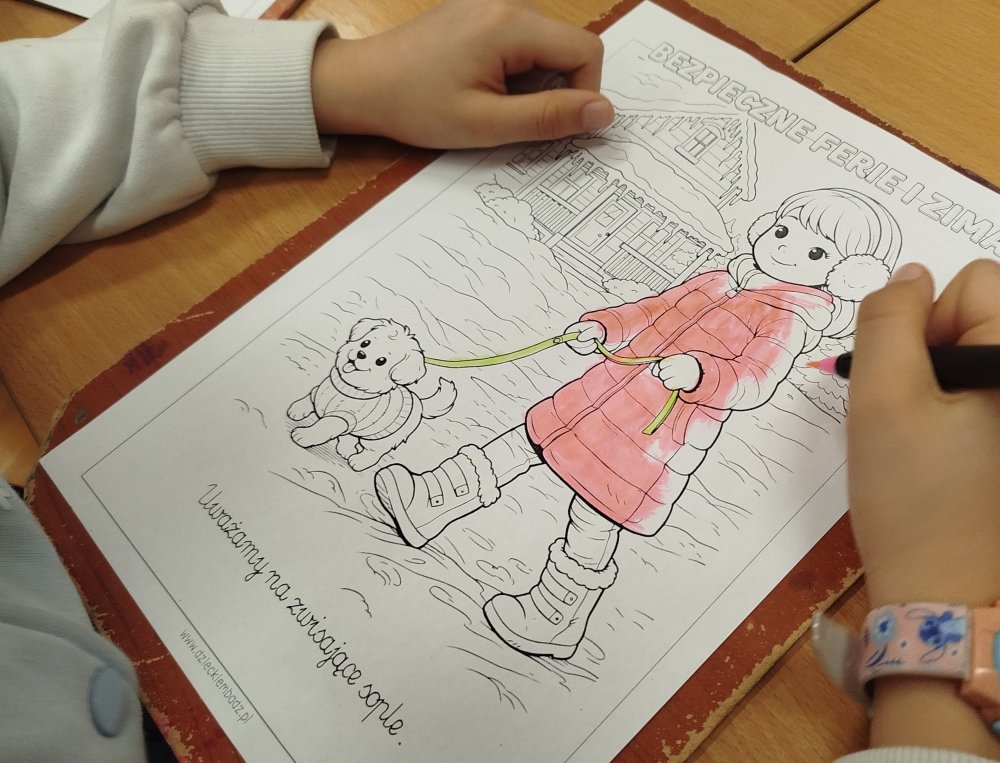Jak podsumowanie zajęć, dzieci kolorowo ozdobiły ilustracje do kodeksu bezpiecznych ferii.
